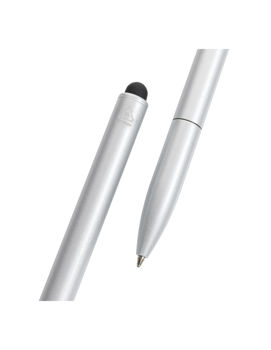 Set di penne in acciaio inossidabile riciclato con penna a sfera e roller. Presentato in una scatola di sughero abbinata. Inchiostro blu e nero rispettivamente.