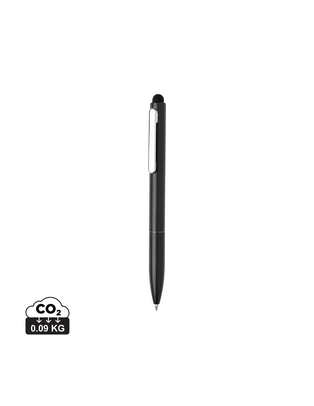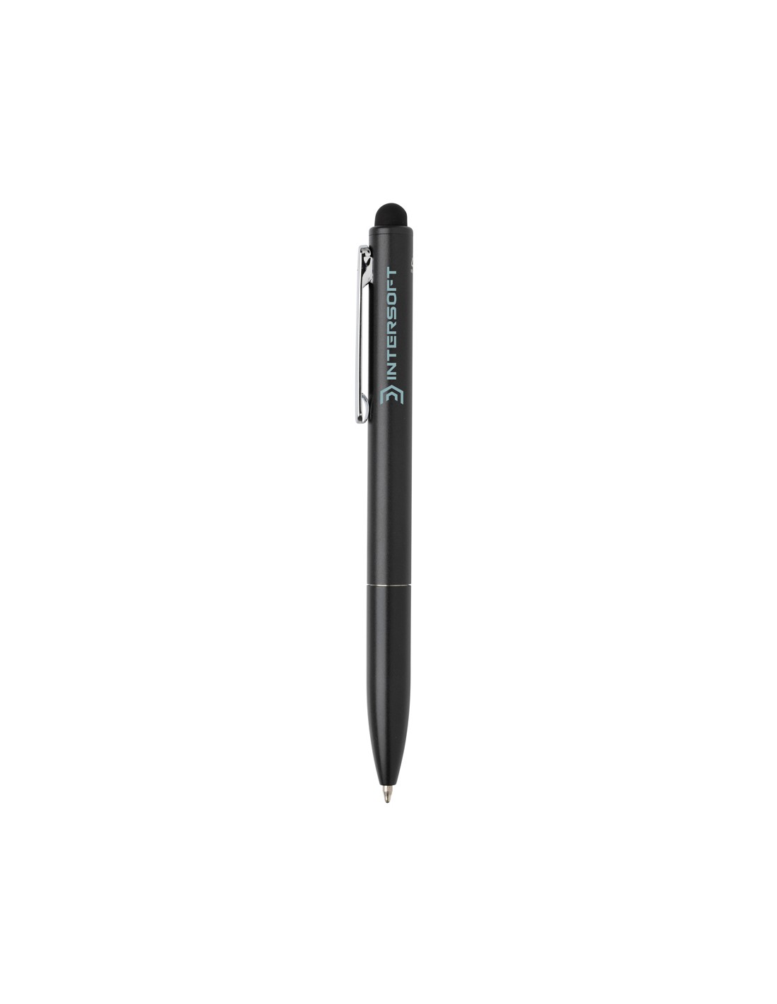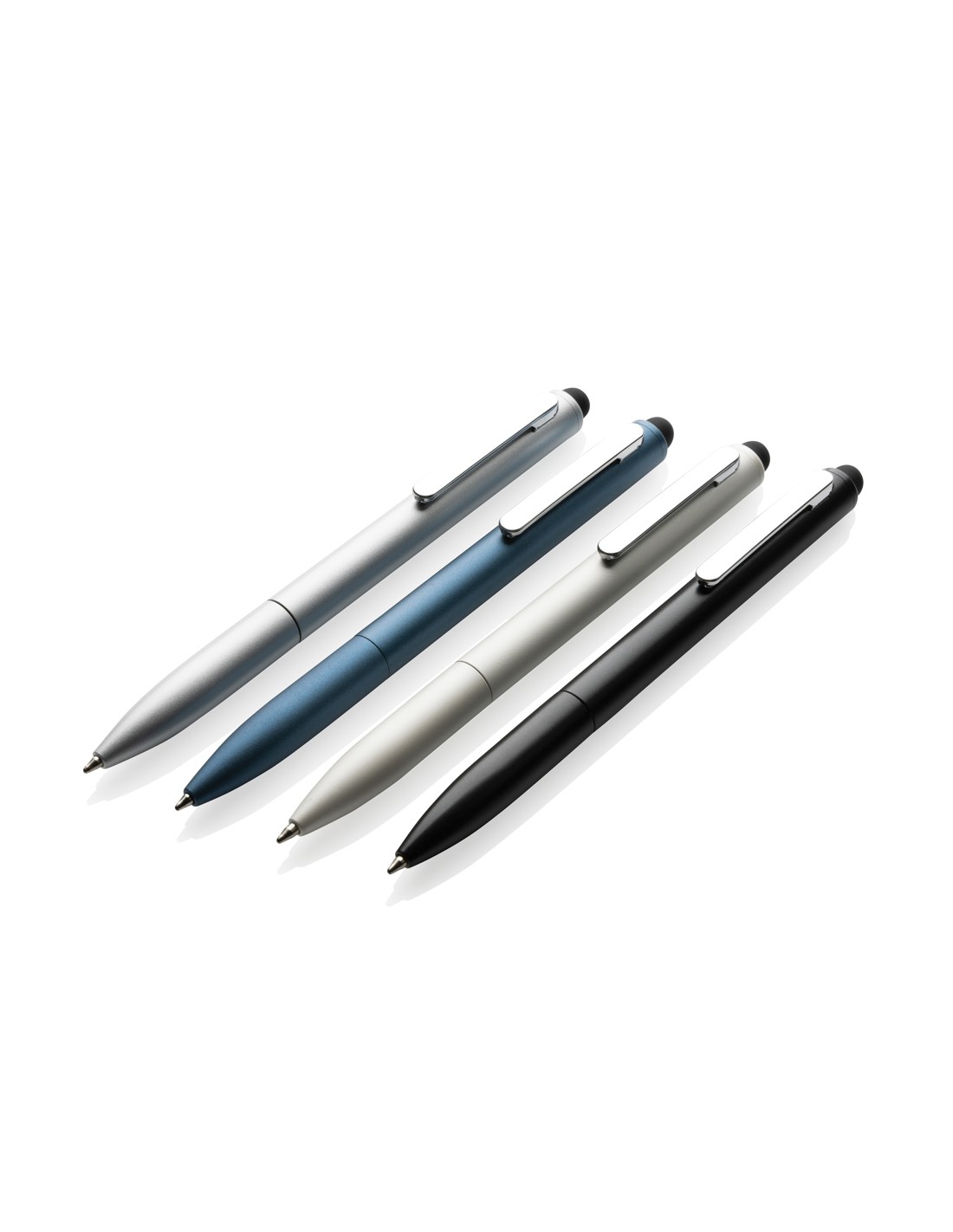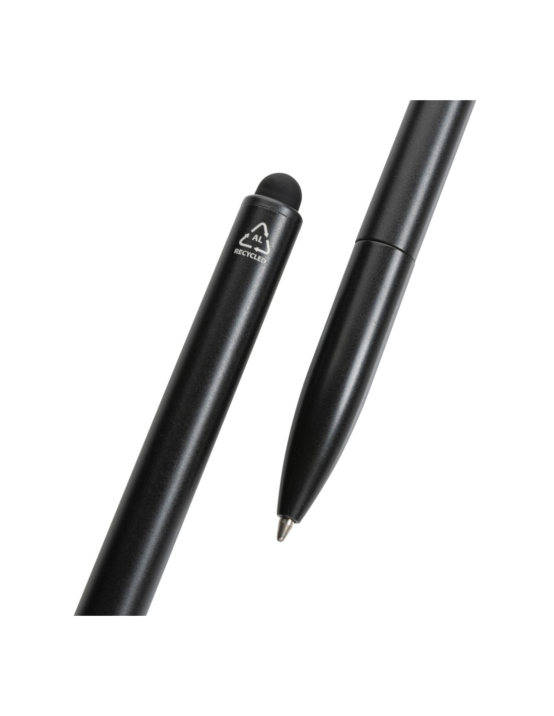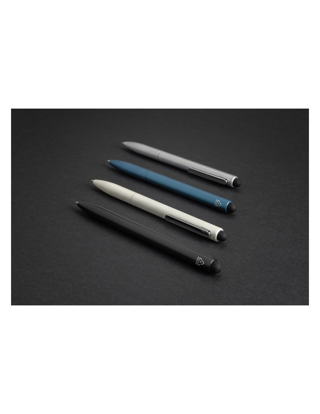 Set di penne in acciaio inossidabile riciclato con penna a sfera e roller. Presentato in una scatola di sughero abbinata. Inchiostro blu e nero rispettivamente.
