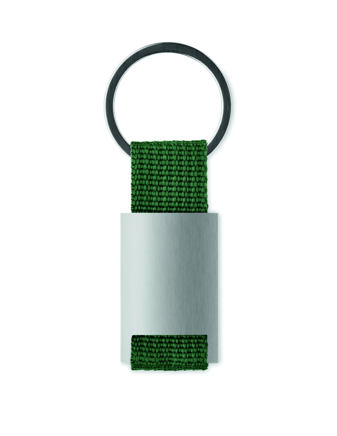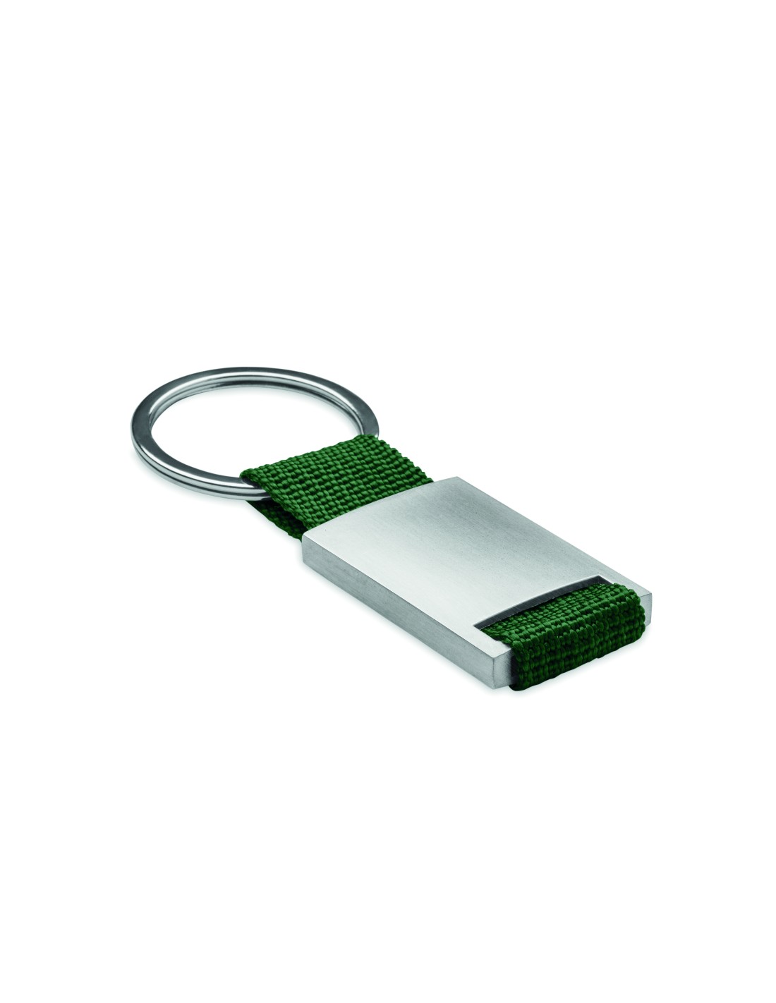 Portachiavi rettangolare in metallo e fascetta colorata.