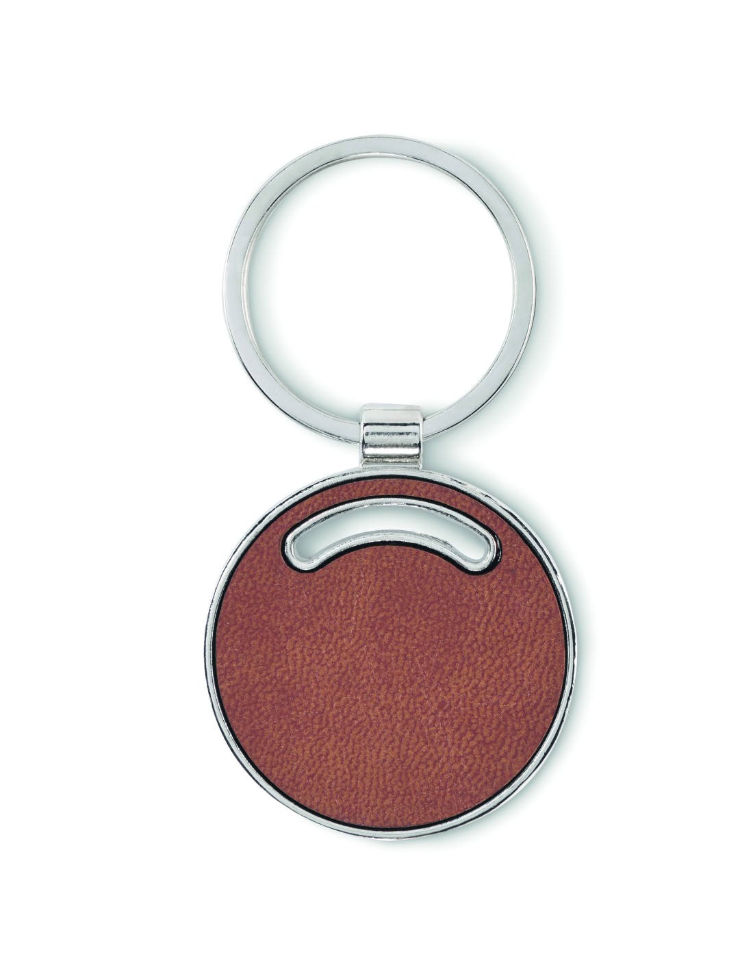 Portachiavi rotondo in metallo con inserto in pelle PU riciclata.