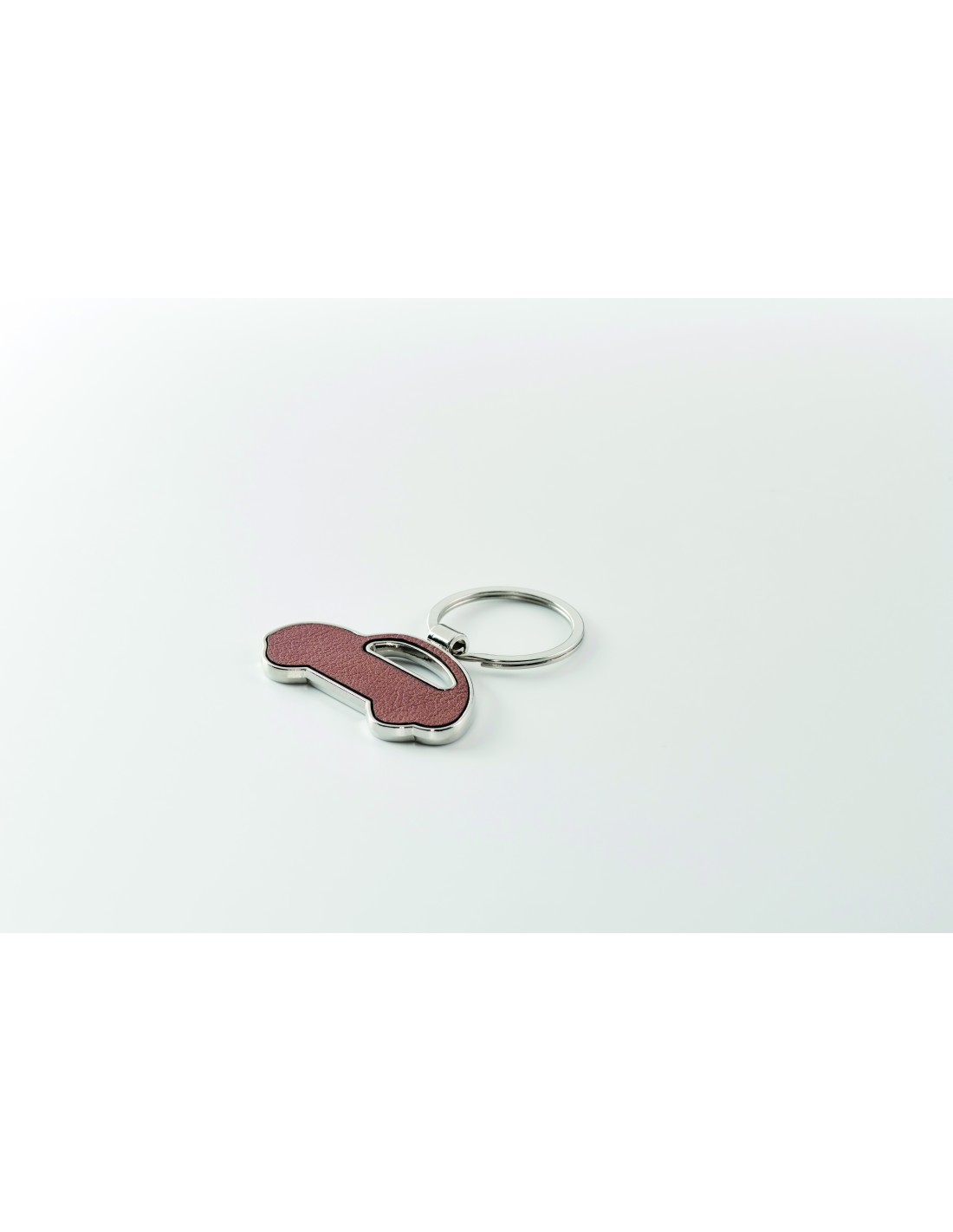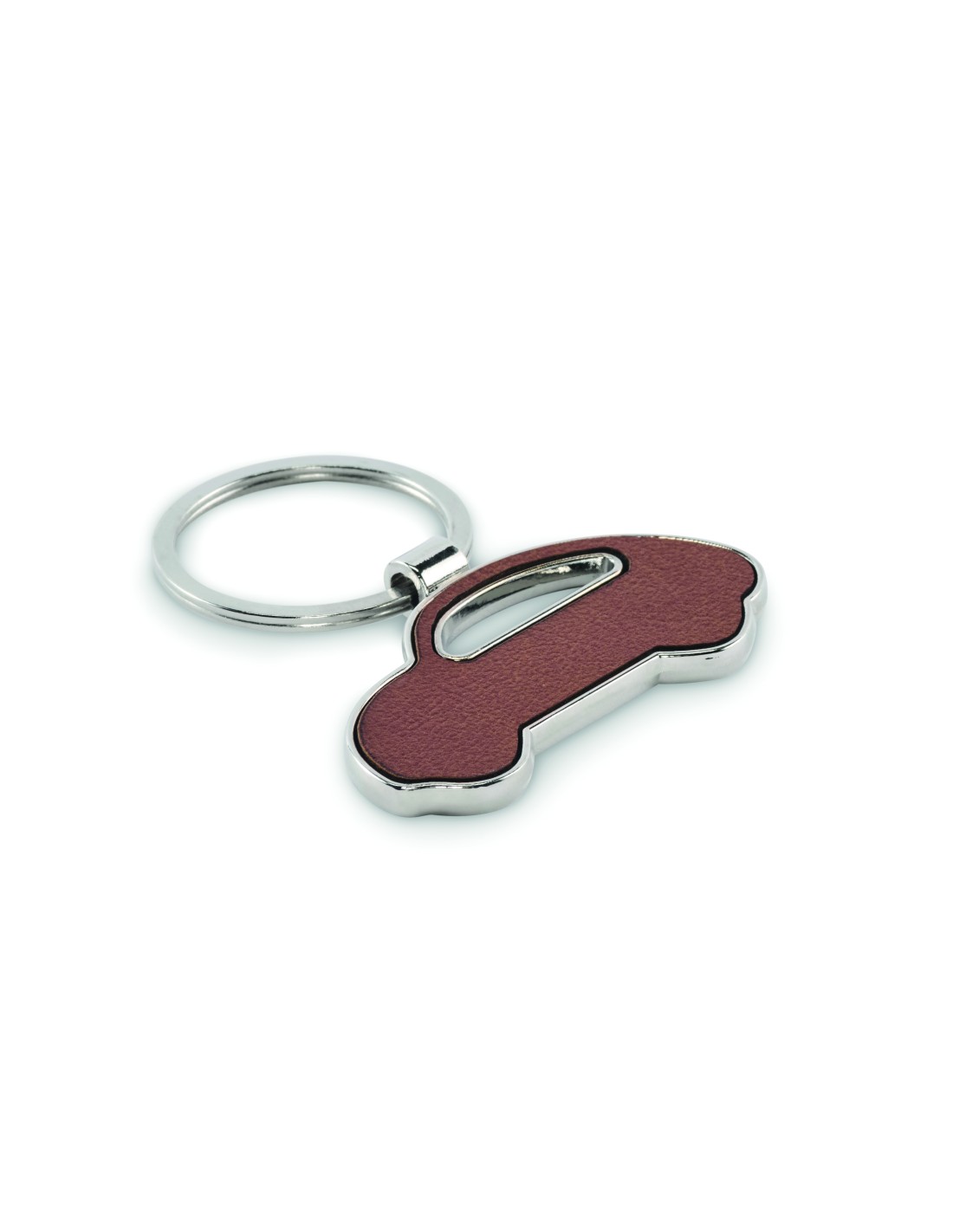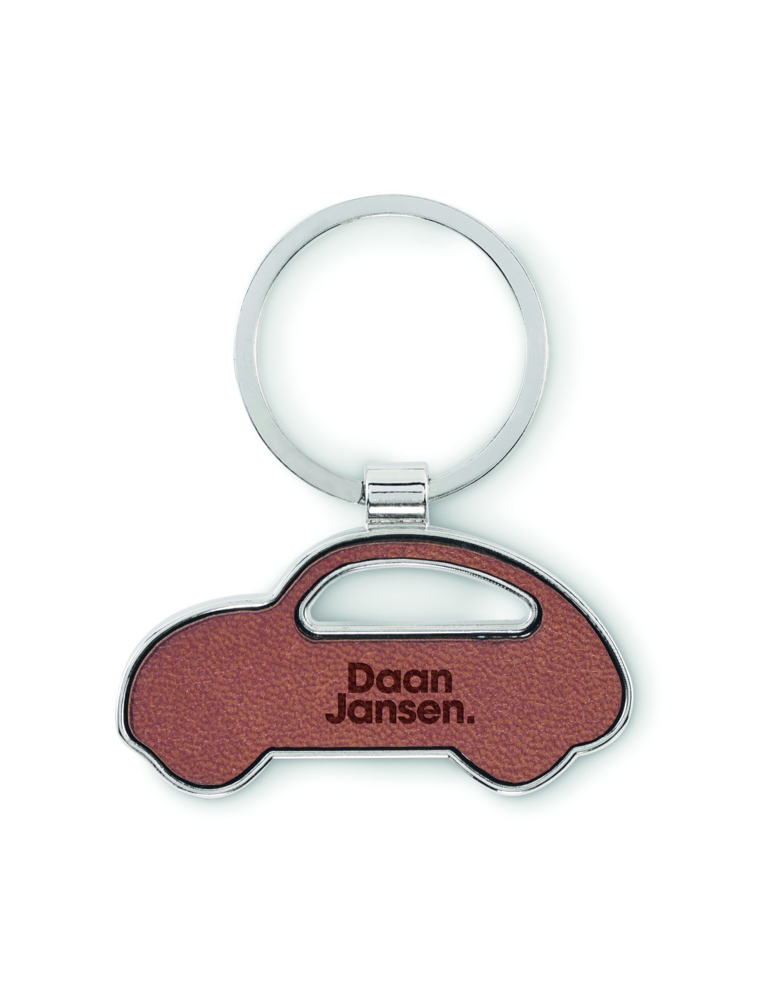 Portachiavi in metallo a forma di auto con inserto in pelle PU riciclata.