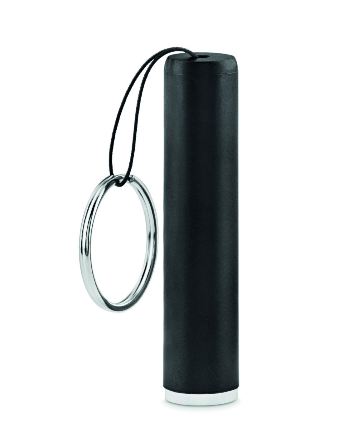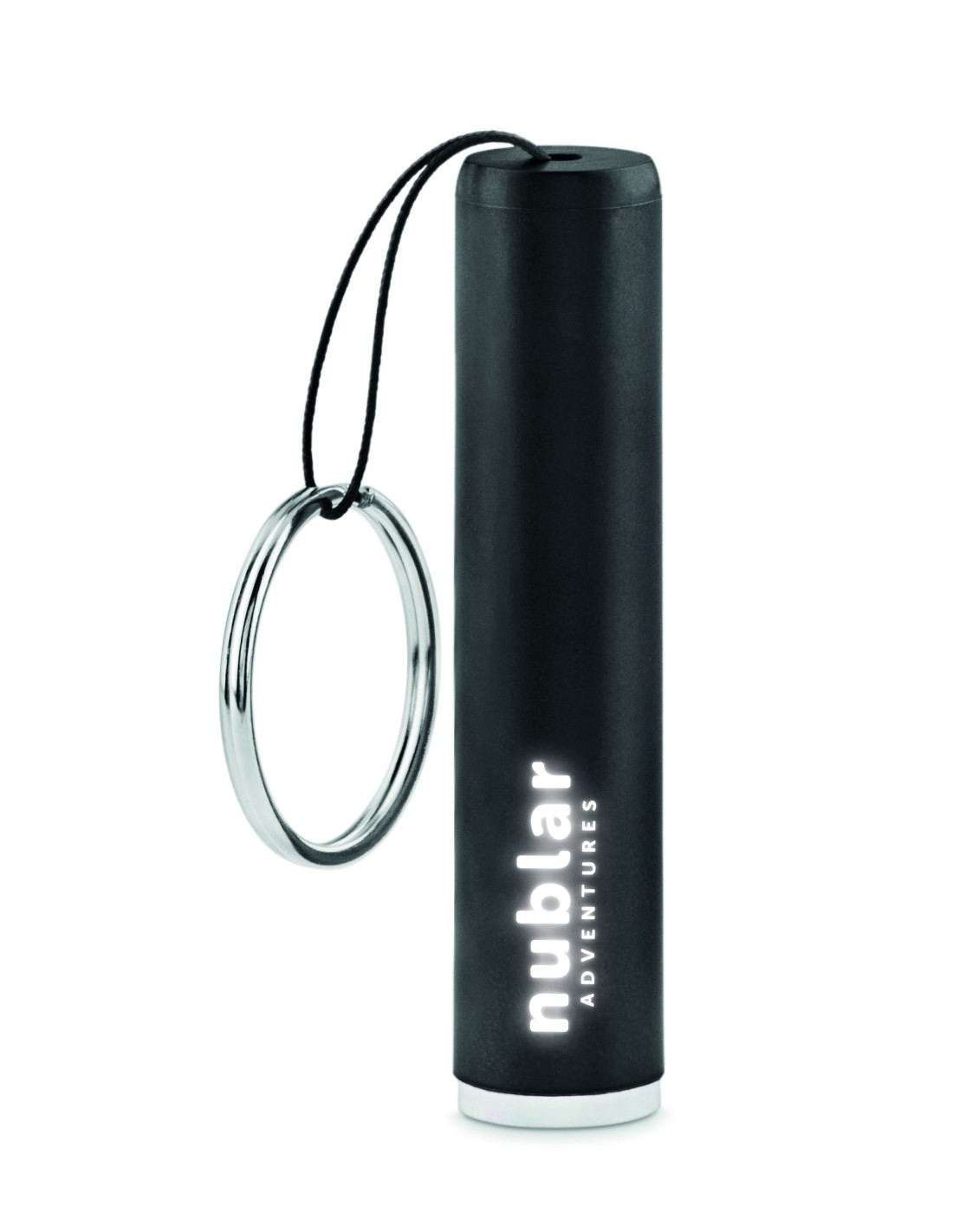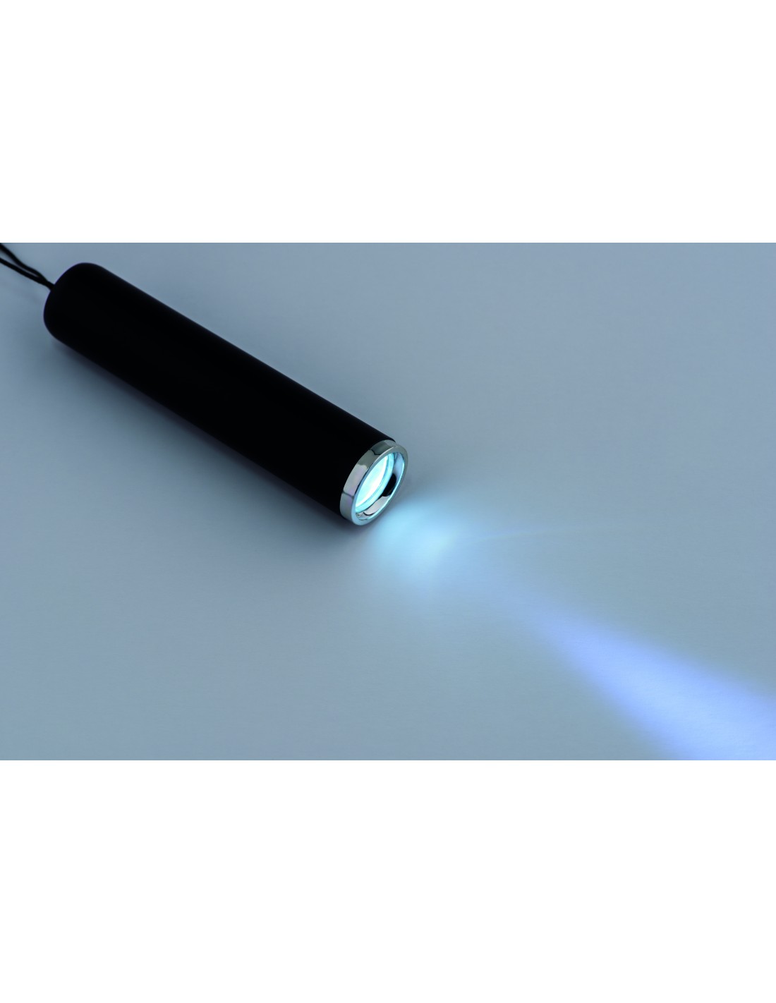 Torcia a LED in ABS. Con anello portachiavi e cinturino. 3 batterie AG3 incluse. Il fusto include una luce per illuminare il logo inciso.
