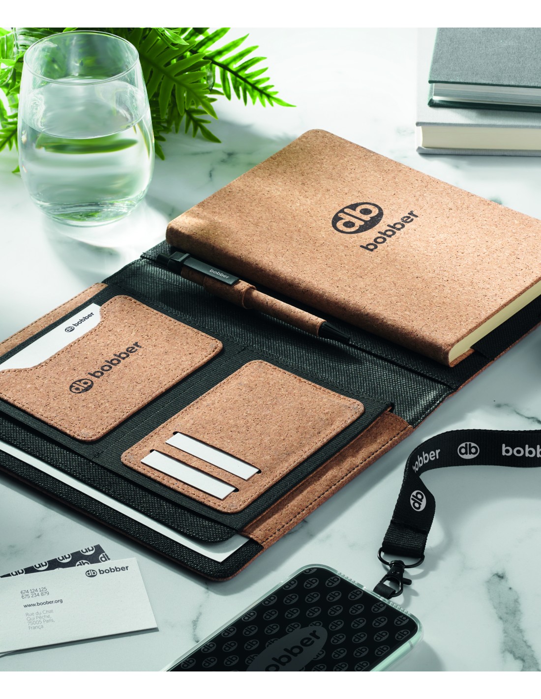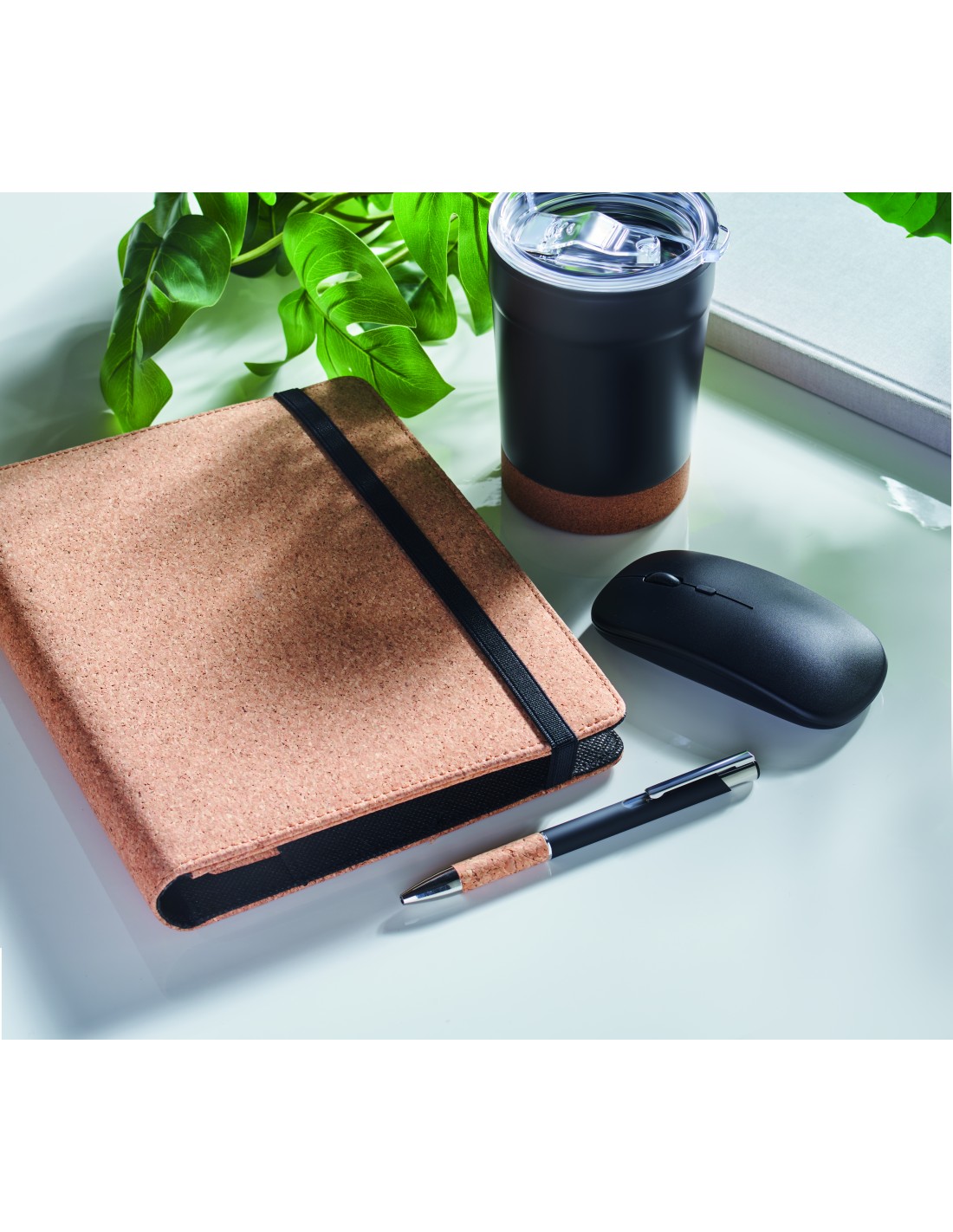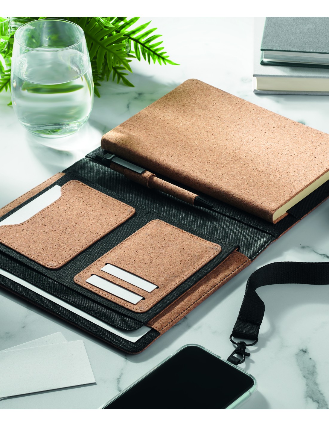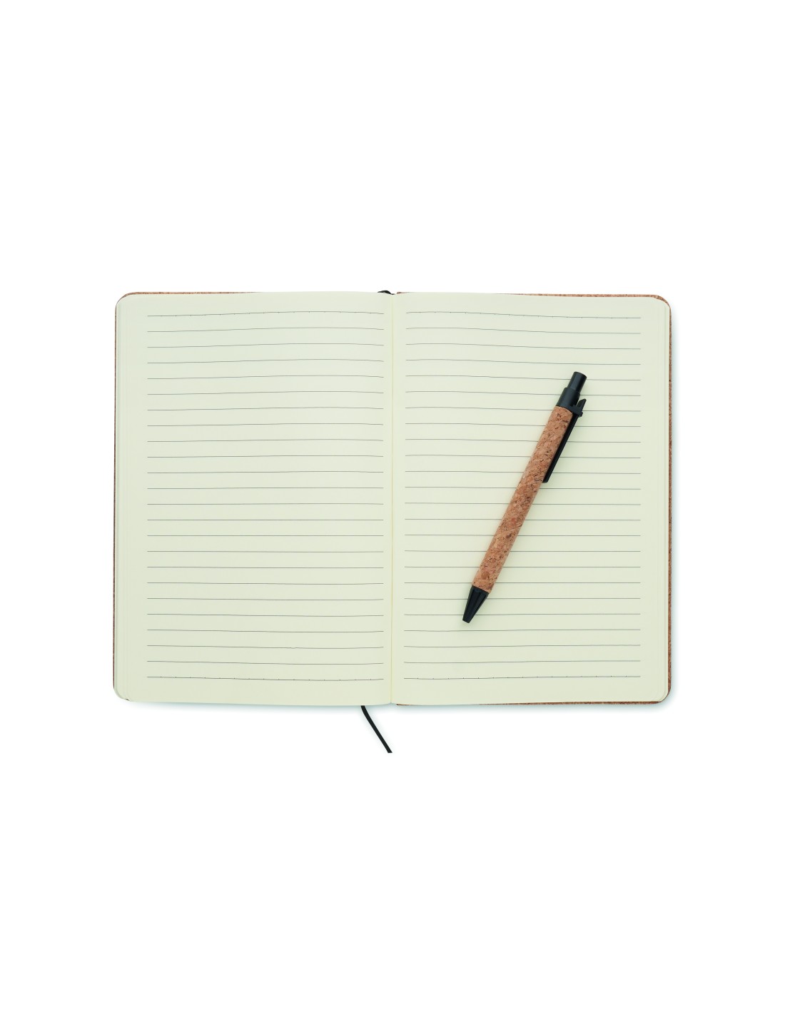 Porta documenti in sughero con notebook A5 ricaricabile. Rilegato con custodia. 192 pagine a righe in carta riciclata (96 fogli). Penna e portapenne abbinati. 2 portacarte. Chiusura elastica.