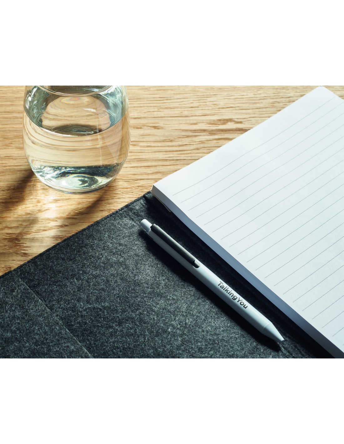 Cartella da conferenza in sughero A4 con blocco note A4 ricaricabile. 30 fogli foderati in carta riciclata. Penna e portapenne abbinati. 2 portacarte e un ampio scomparto.