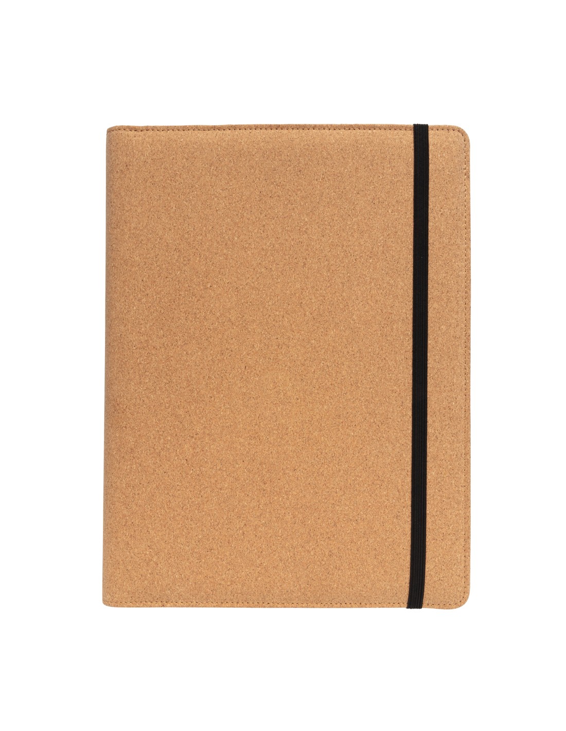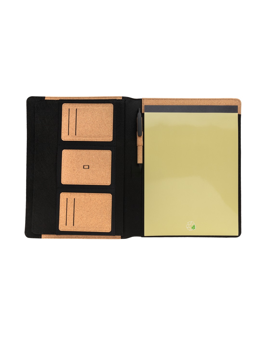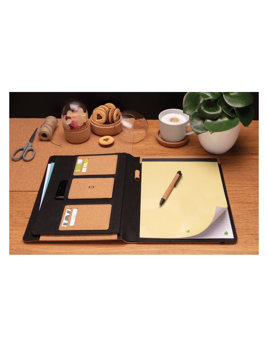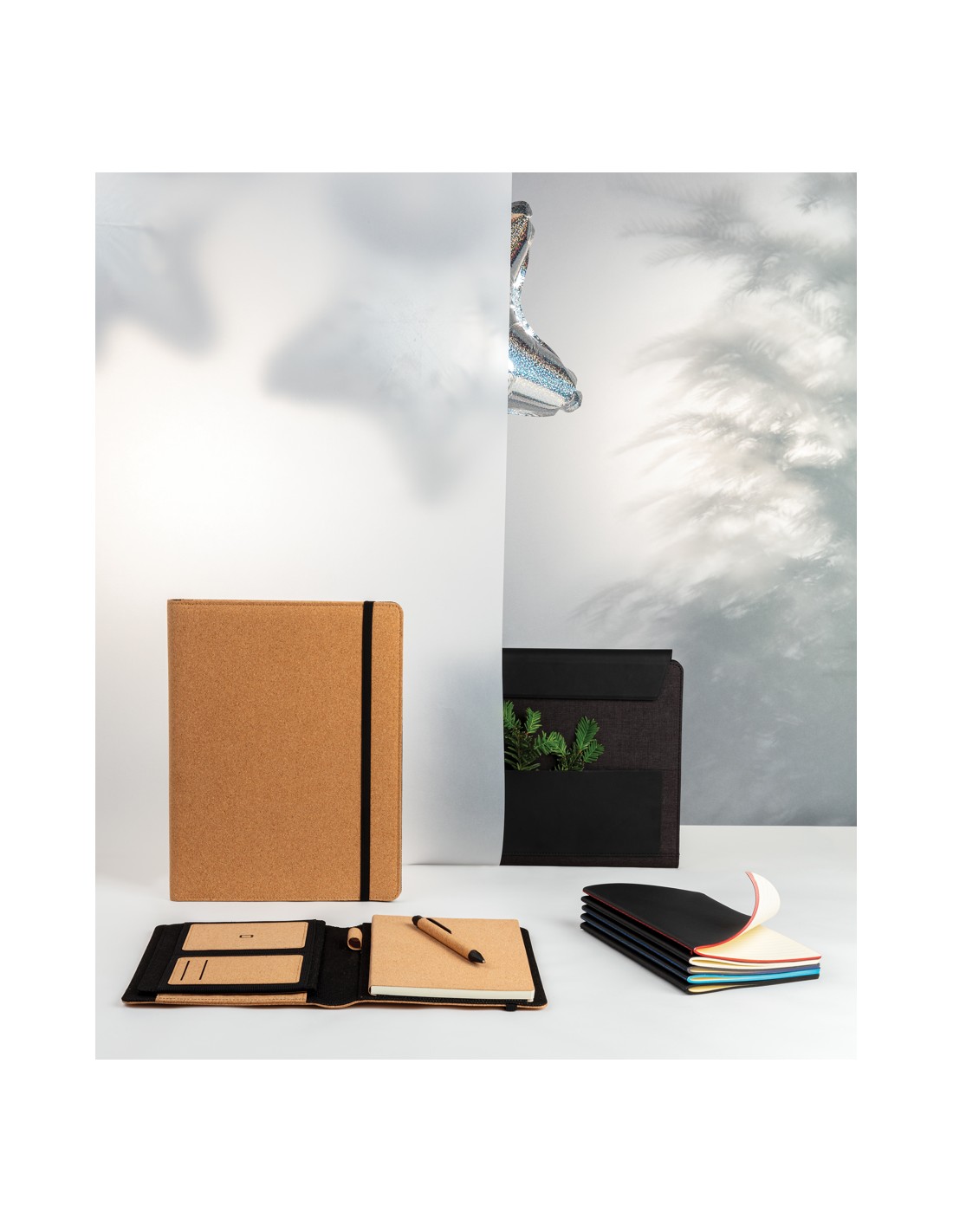 Cartella da conferenza in sughero A4 con blocco note A4 ricaricabile. 30 fogli foderati in carta riciclata. Penna e portapenne abbinati. 2 portacarte e un ampio scomparto.