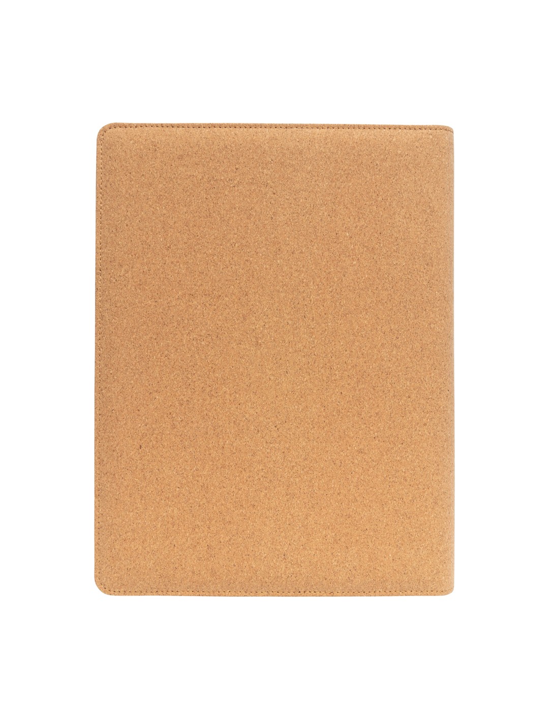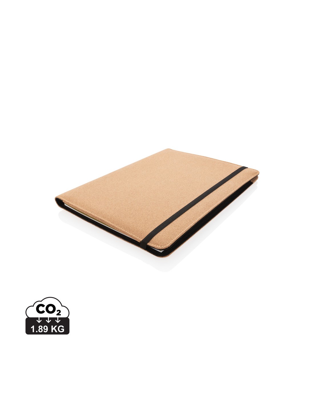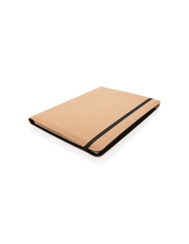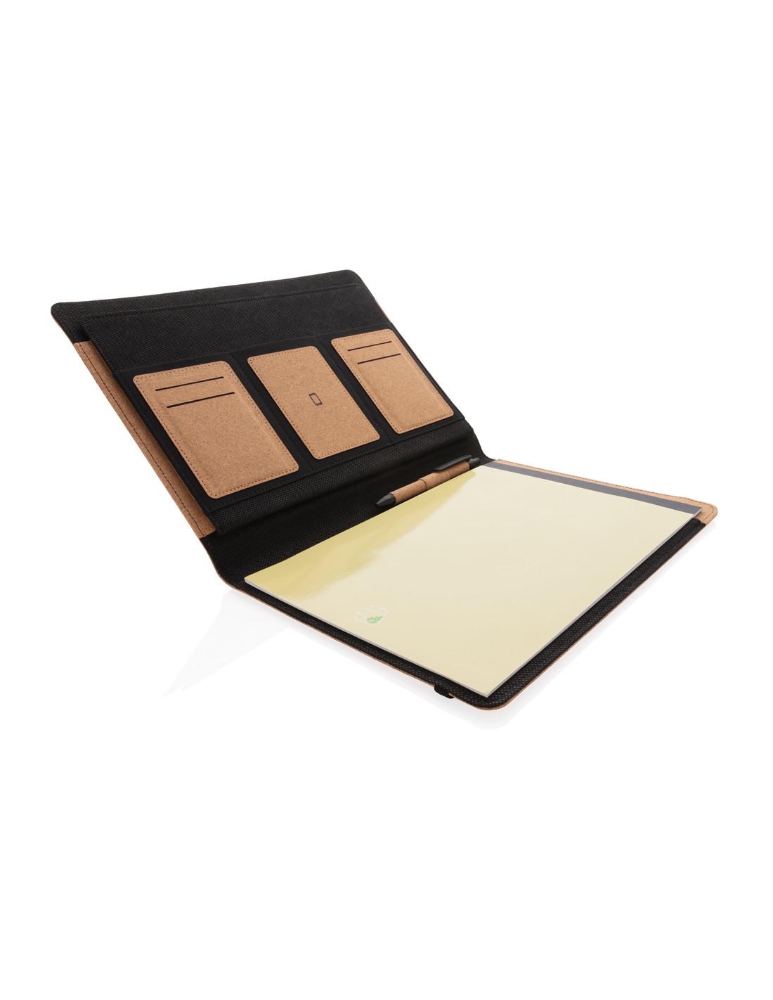 Cartella da conferenza in sughero A4 con blocco note A4 ricaricabile. 30 fogli foderati in carta riciclata. Penna e portapenne abbinati. 2 portacarte e un ampio scomparto.