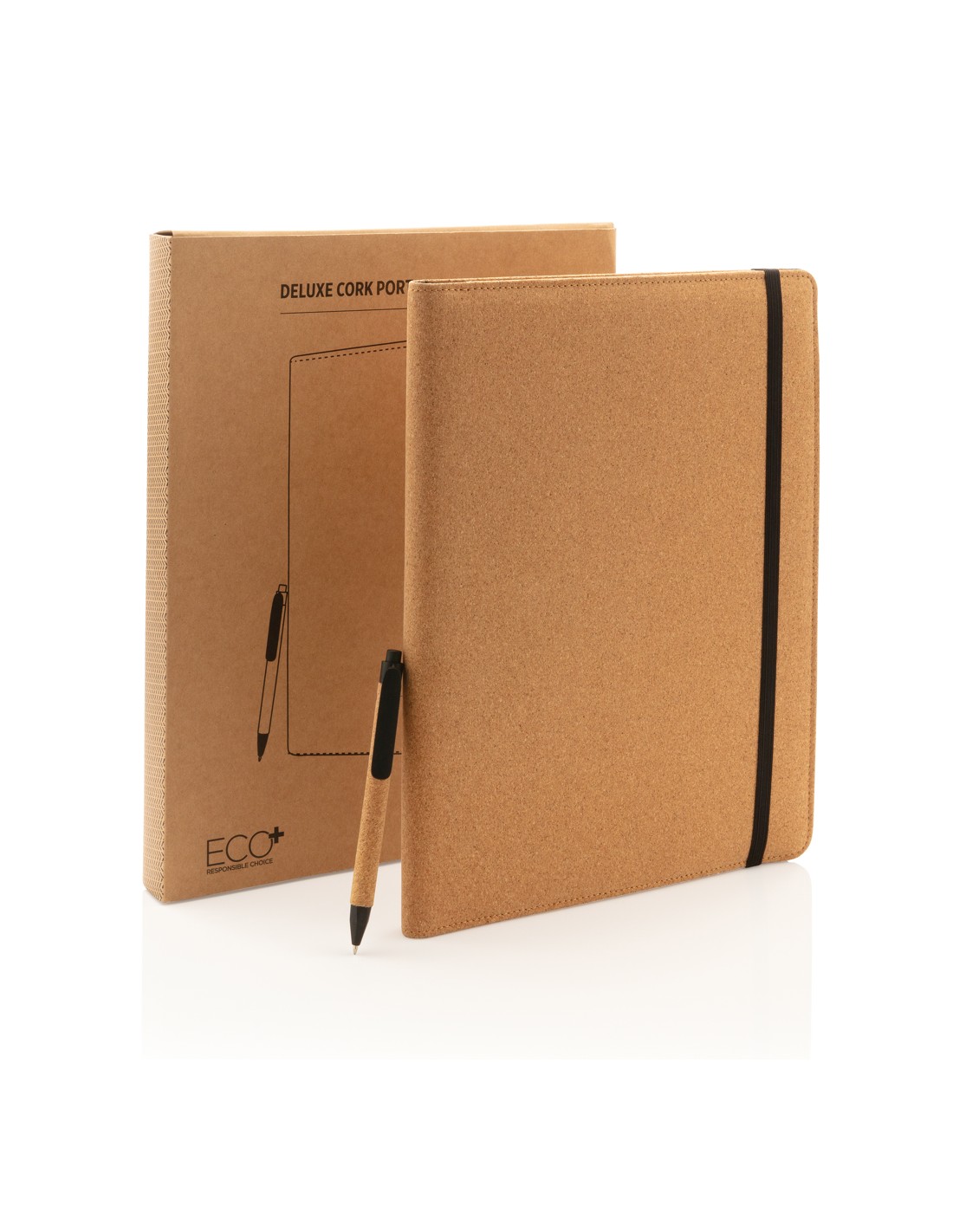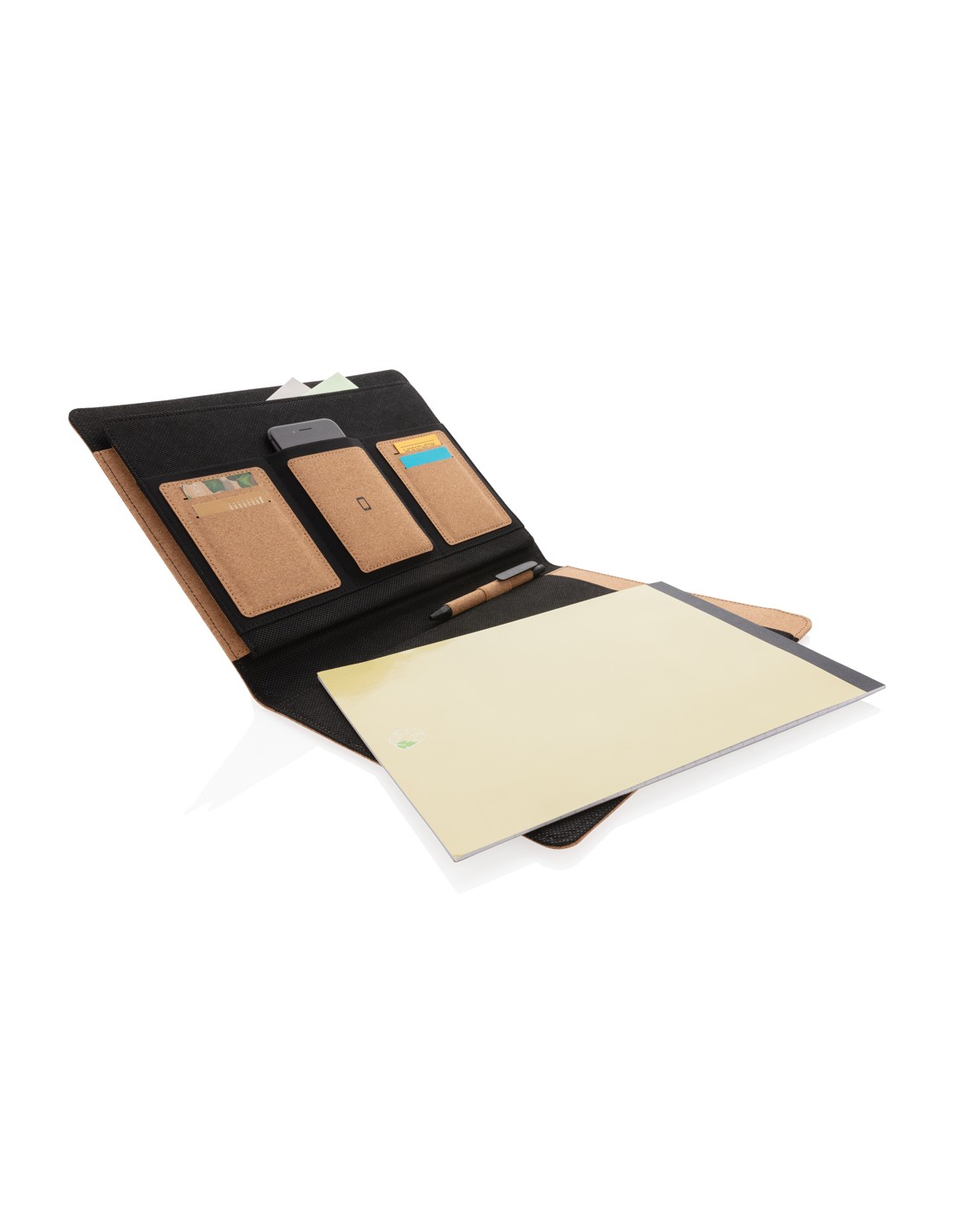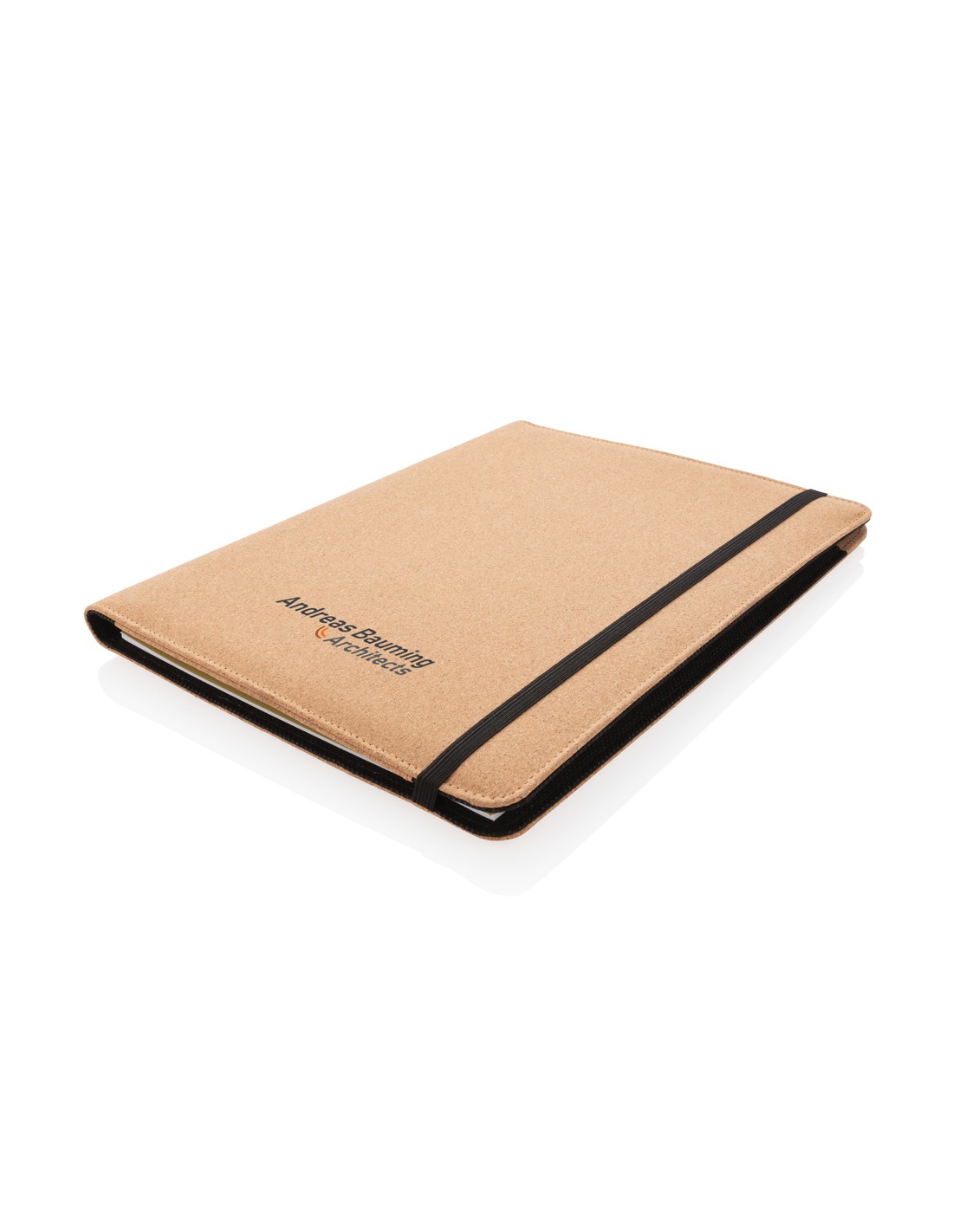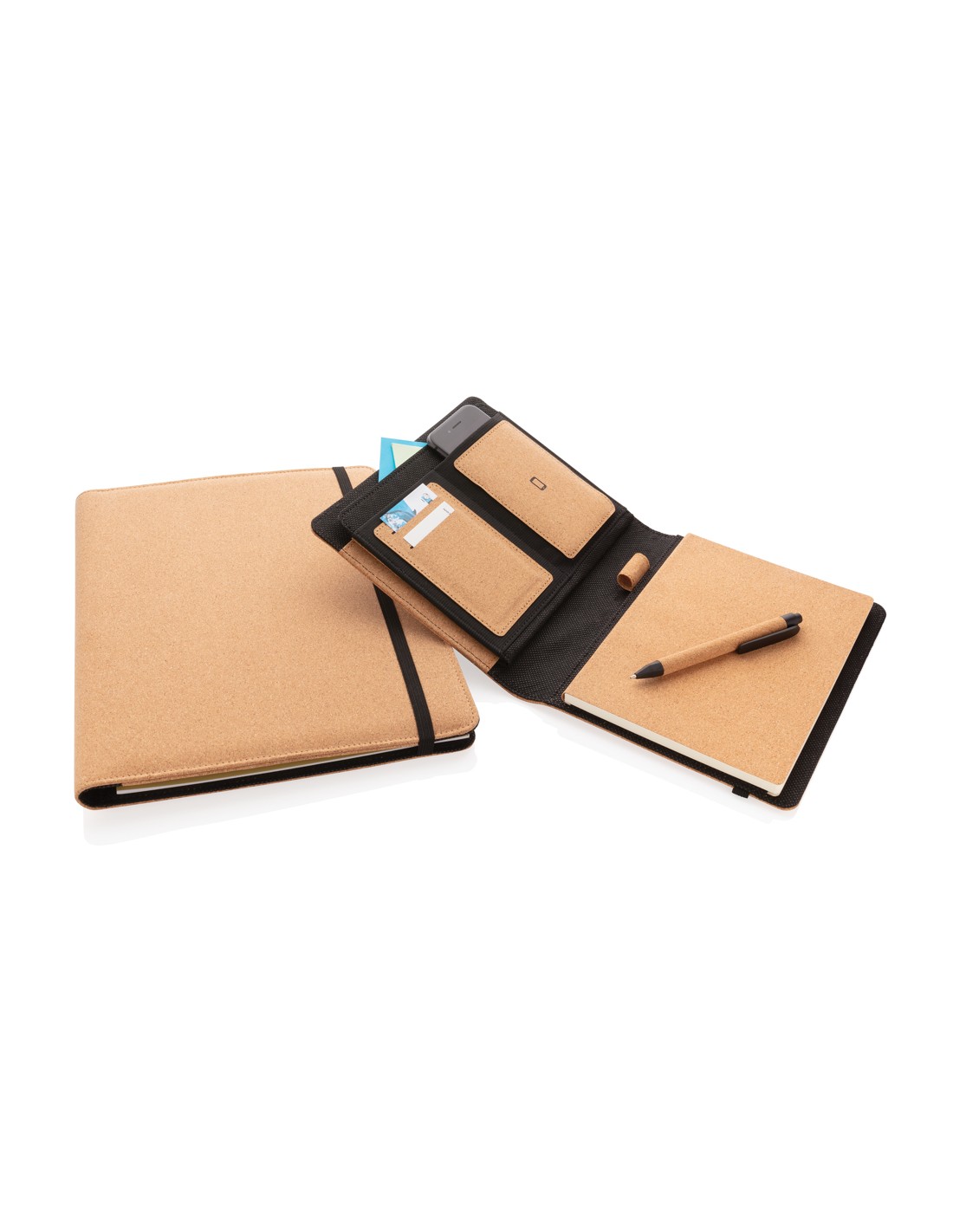 Cartella da conferenza in sughero A4 con blocco note A4 ricaricabile. 30 fogli foderati in carta riciclata. Penna e portapenne abbinati. 2 portacarte e un ampio scomparto.