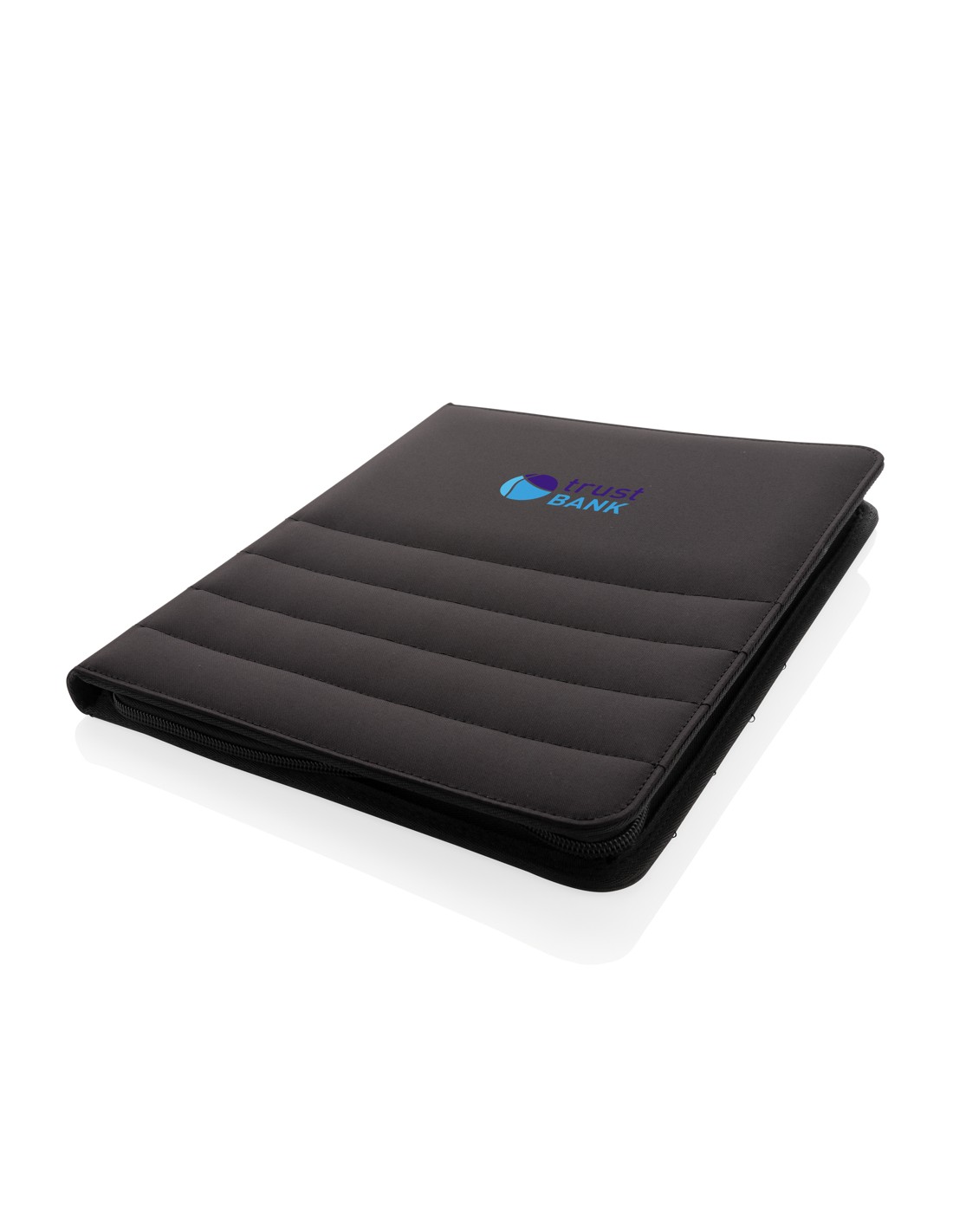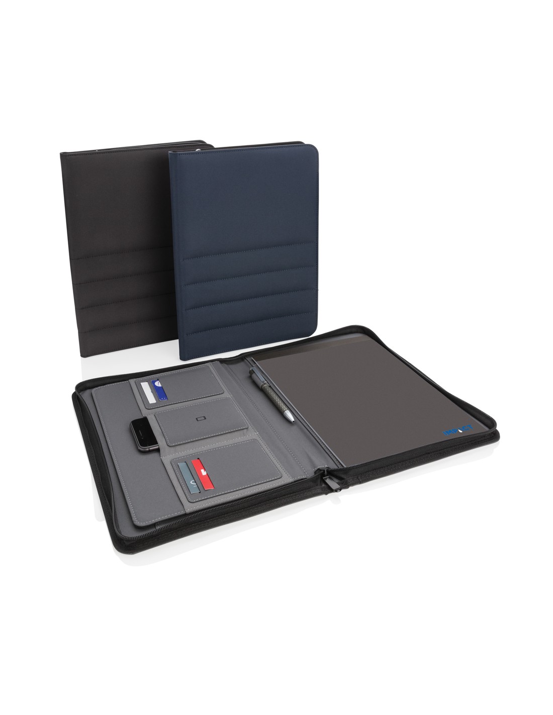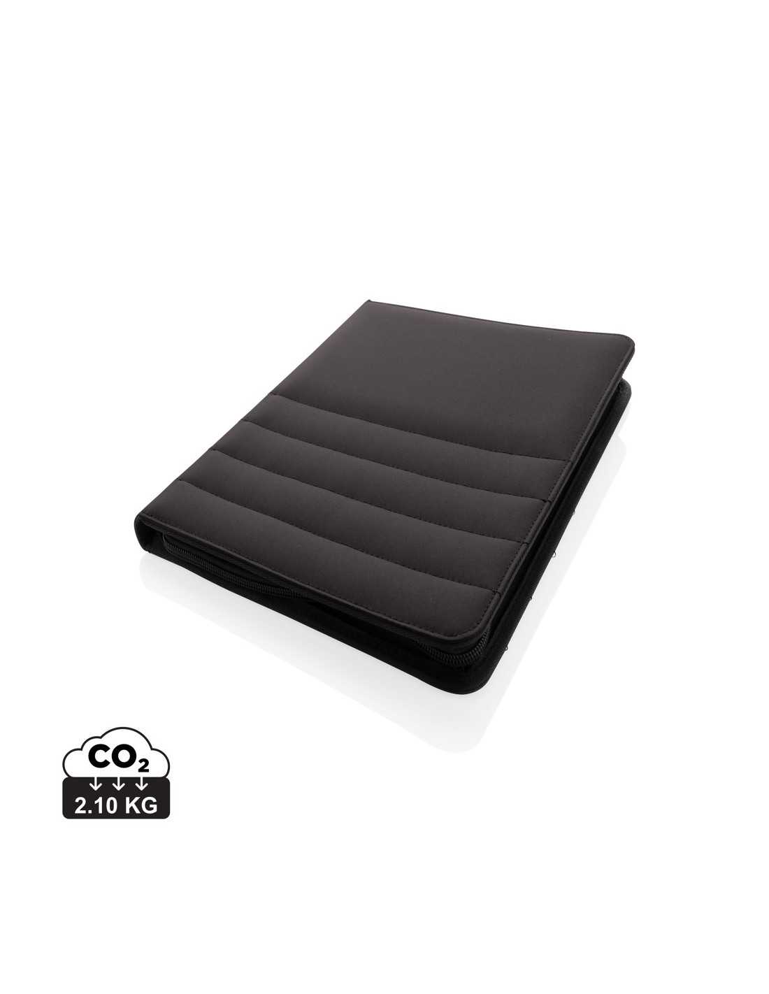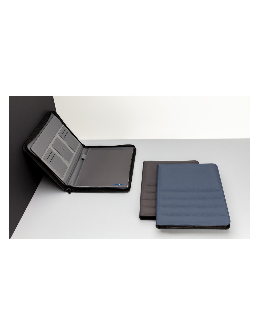 Portfolio A5 in RPET con dettagli in ecopelle. Quaderno A5 sostituibile con copertina rigida in sughero. Rilegato con custodia. 128 pagine a righe in carta riciclata (64 fogli). Porta penna. 2 portacarte e un grande scomparto. Cinturino di chiusura elastico con dettagli FSC®-certified | FSC MIX,...