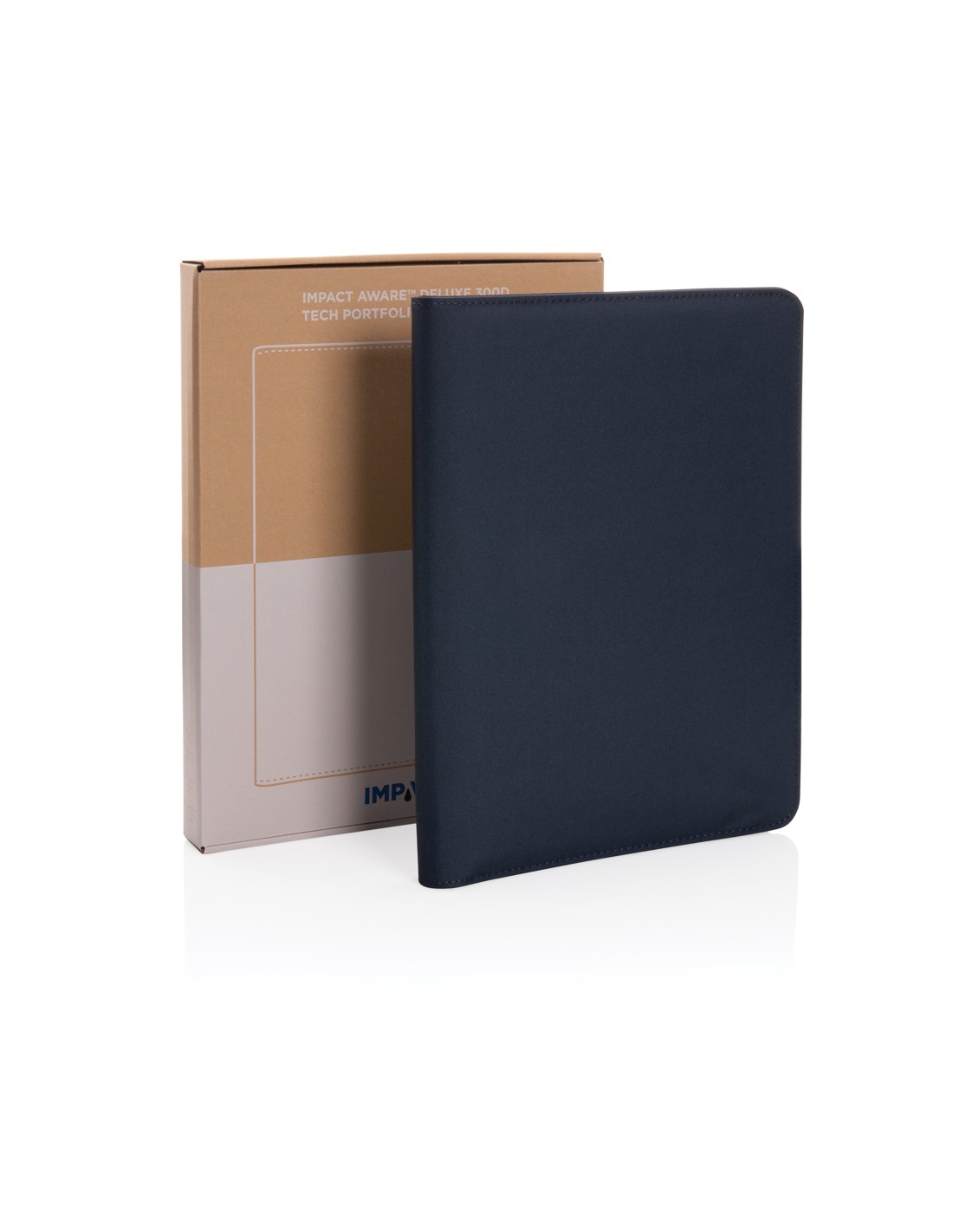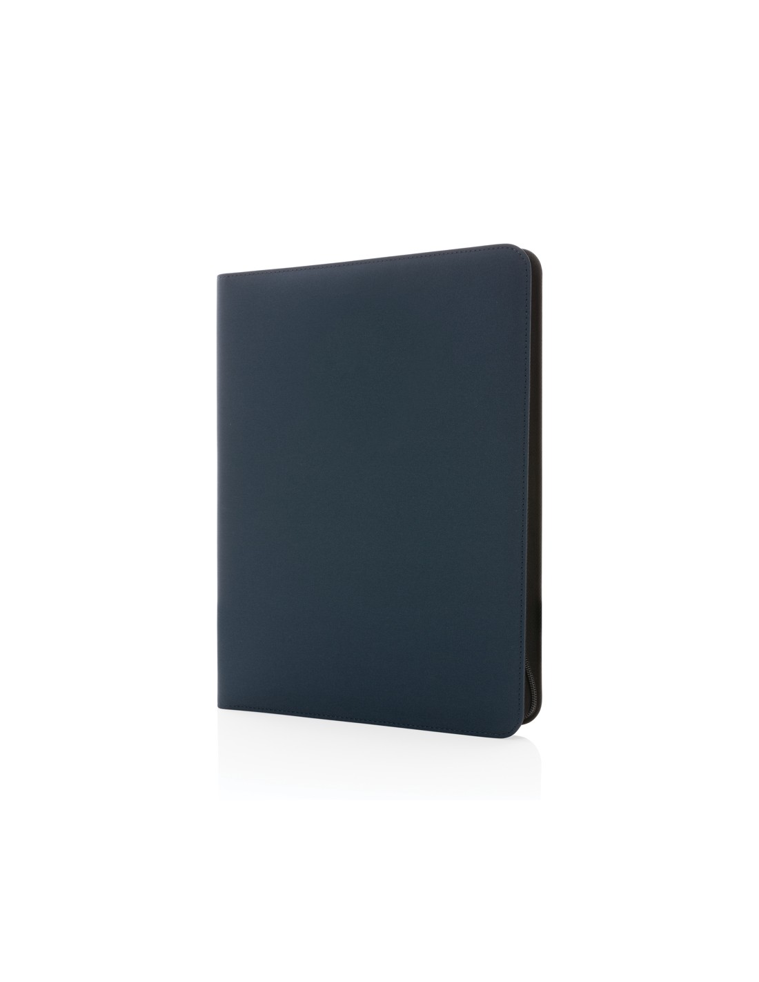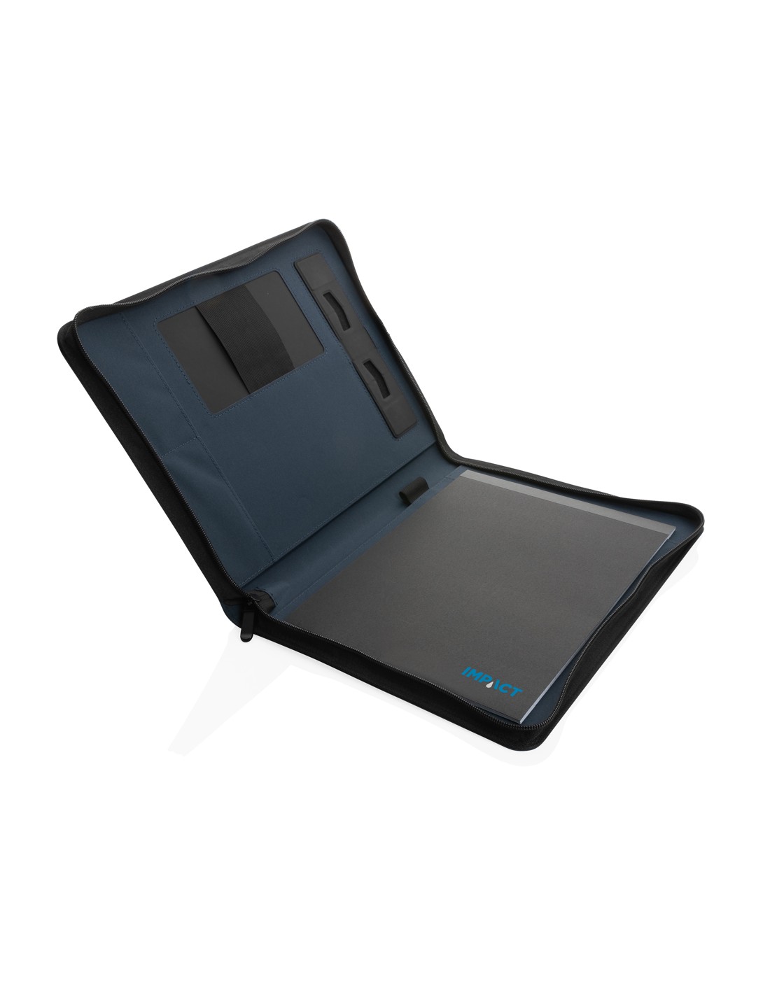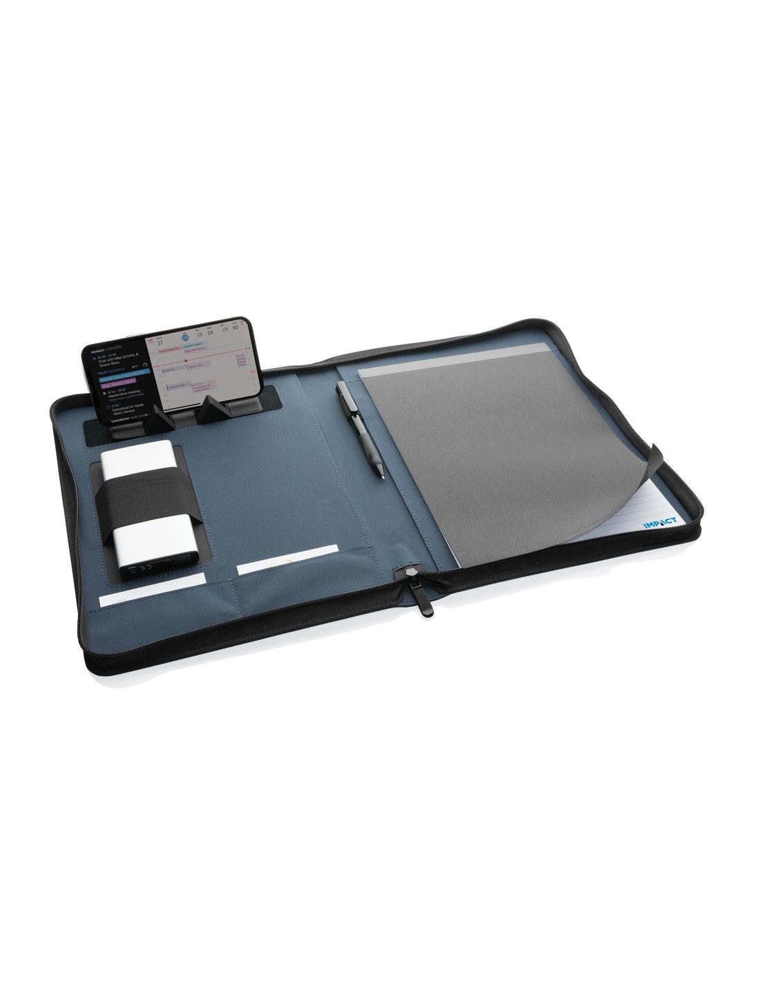 Questo portadocumenti 300D deluxe tech A4 Impact AWARE™ con cerniera dà un tocco di raffinatezza al tuo lavoro. Organizza i tuoi documenti importanti, carte e note. Include un blocco A4 in carta riciclata da 64 gm/2 da 20 pagine. All'interno c'è 1 tasca per telefono, un supporto per telefono, portapenna e 2 scomparti per biglietti da visita. Con tracciante AWARE™ che garantisce l'uso reale di materiali riciclati. Ogni portadocumenti e riutilizza 8 bottiglie in PET da 0,5 litri. Il 2% del ricavato di ogni prodotto Impact venduto sarà devoluto a Water.org. Senza PVC.