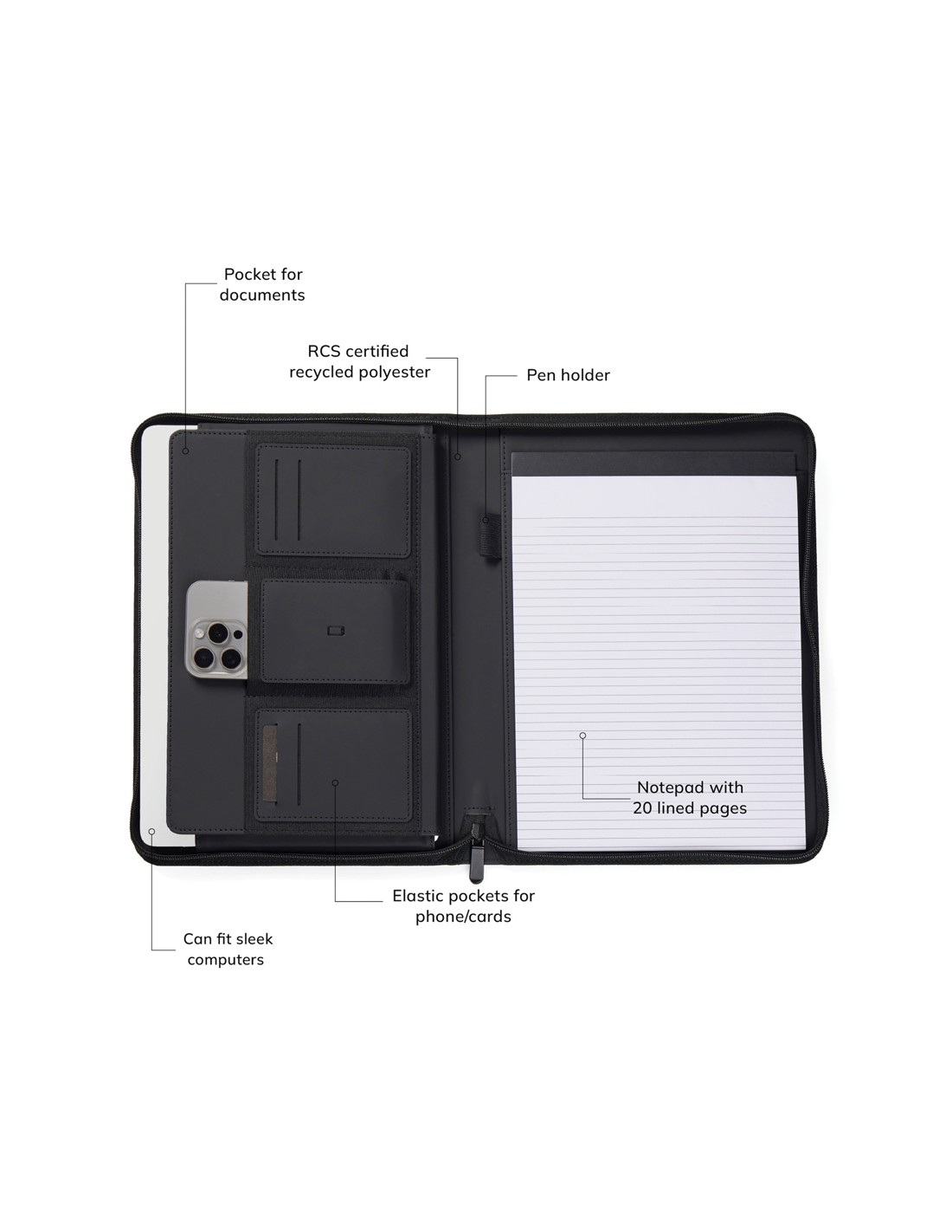 Portablocco A4 con cerniera che include: stand per tablet/smartphone, porta telefono con finestrella trasparente. Adatto a tutti più comuni smartphone incluso iPhone6 e Samsung S6. Include taschini porta gadgets quali cavi di ricarica, chiavette USB e powerbank. Tasca porta documenti/tablet....