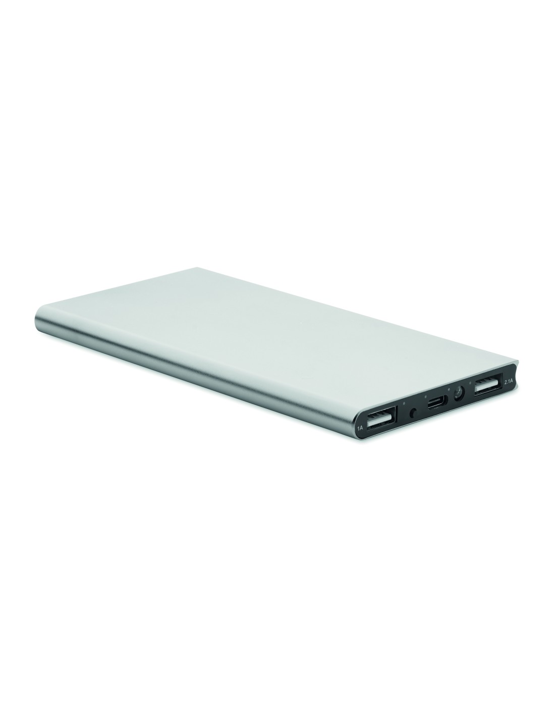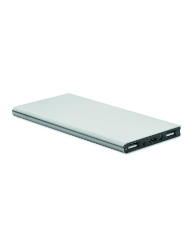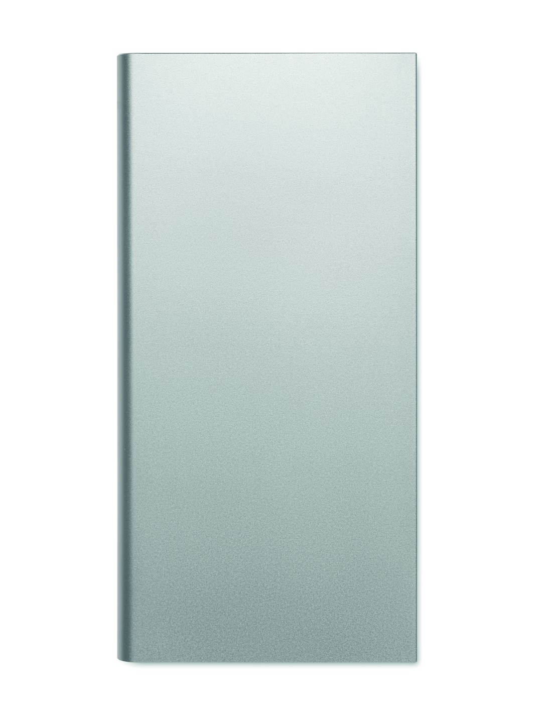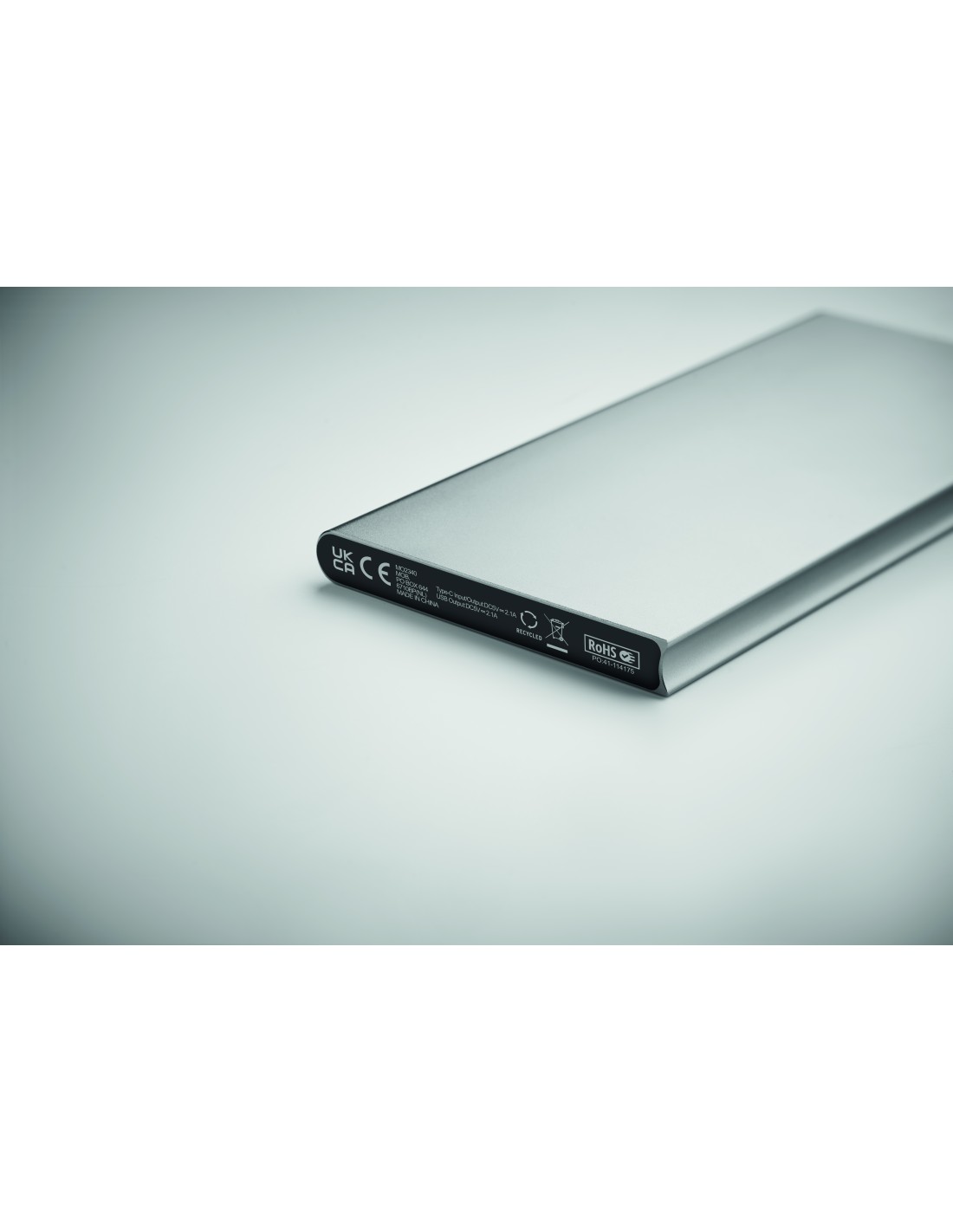 Power bank da 8000 mAh in alluminio riciclato. Capacità per uso smartphone, corrente di uscita DC5V/2A. Incluso cavo di ricarica USC Type-C. Ingresso/uscita: USB Tipo-C.