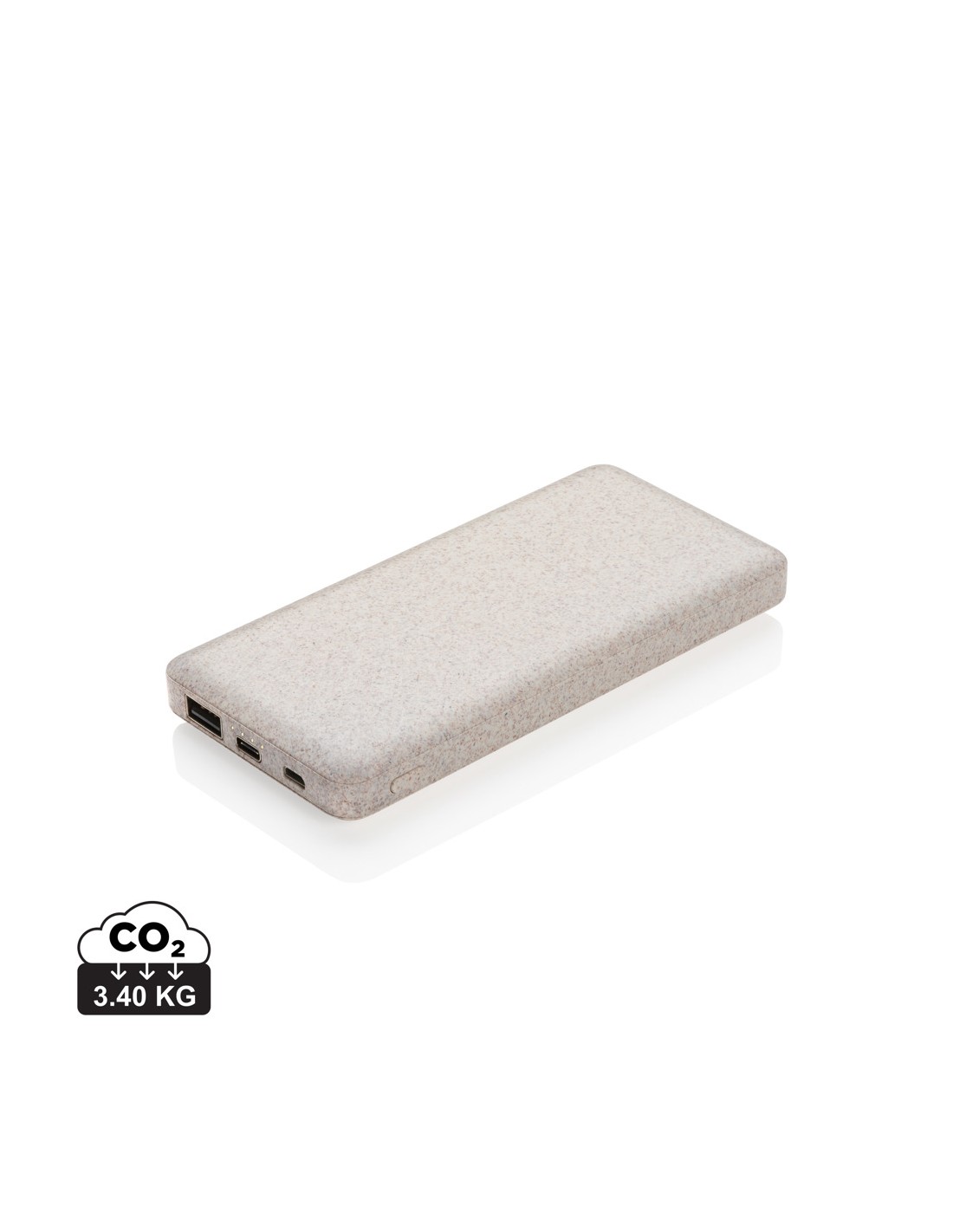 Powerbank ultrapiatta da 10.000 mAh realizzata in fibra di grano (35%) e ABS. A piena carica potrà ricaricare il tuo smartphone 4 volte. Include una batteria ad alta densità ai polimeri di litio di lunga durata da 10.000 mAh. Doppia porta USB che include un output type C adatta agli ultimi modelli di smartphone. Grazie agli indicatori luminosi saprai sempre il residuo di carica. Include un cavo di ricarica micro USB in TPE. Input micro USB 5V/2A; Input type-C 5V/2A; output USB 5V/3A; output Type-C 5V/2A. L'articolo e gli accessori non contengono PVC.