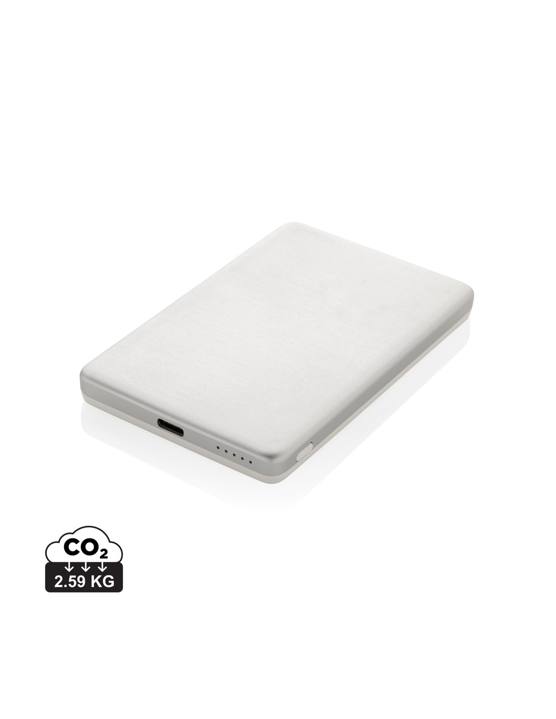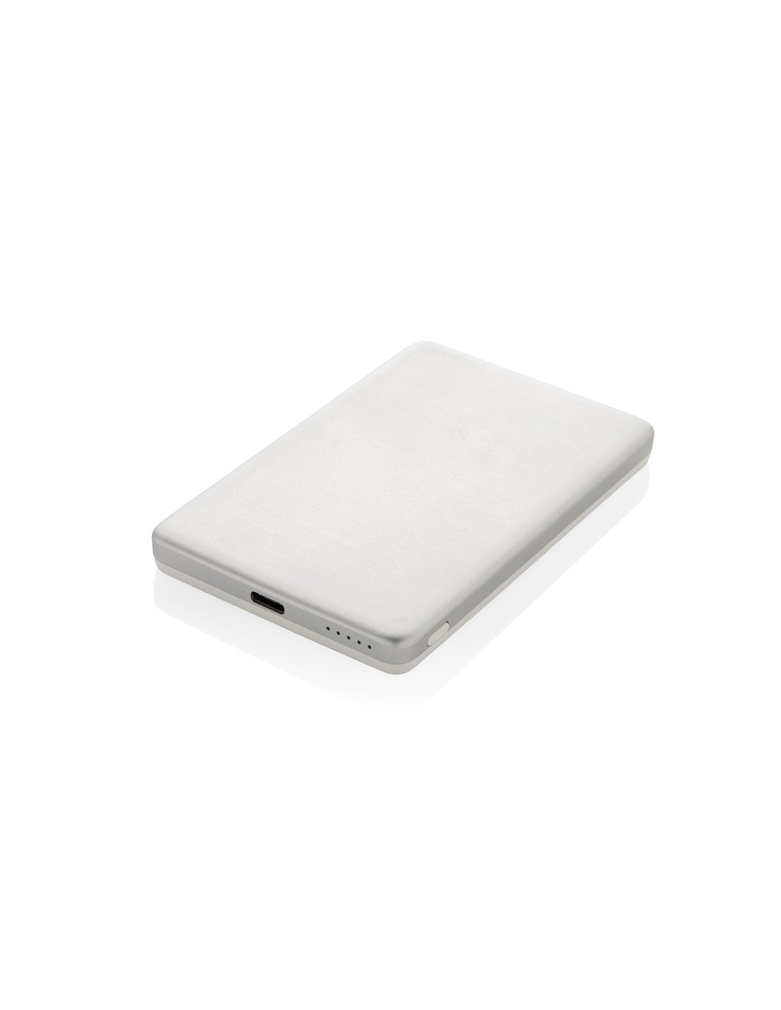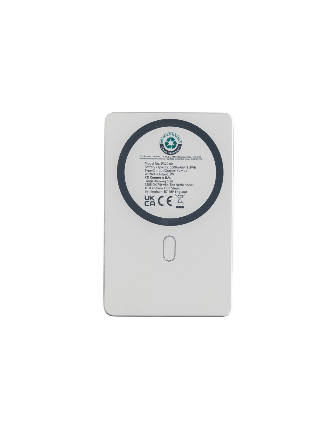 Powerbank ultrasottile da 5.000 mAh con caricatore wireless magnetico da 5W, la cui custodia è realizzata in alluminio e ABS riciclati RCS. RCS (Recycled Claim Standard) è uno standard per verificare il contenuto riciclato di un prodotto lungo l'intera catena di fornitura. Contenuto riciclato totale: 23 % in base al peso totale dell'articolo. La powerbank contiene una batteria ai polimeri di litio di grado A da 5.000 mAh a lunga durata. Gli indicatori di potenza indicano il livello di energia rimanente, in modo da sapere sempre quando ricaricare.; Input type C 5V/2.4A; output type C: 5V/2A.4A Articolo e accessori privi di PVC. Incluso cavo di ricarica in TPE riciclato certificato RCS. Imballato in una confezione FSC® mix.