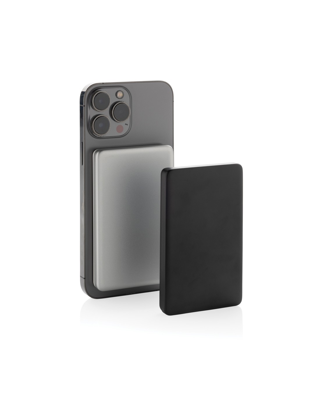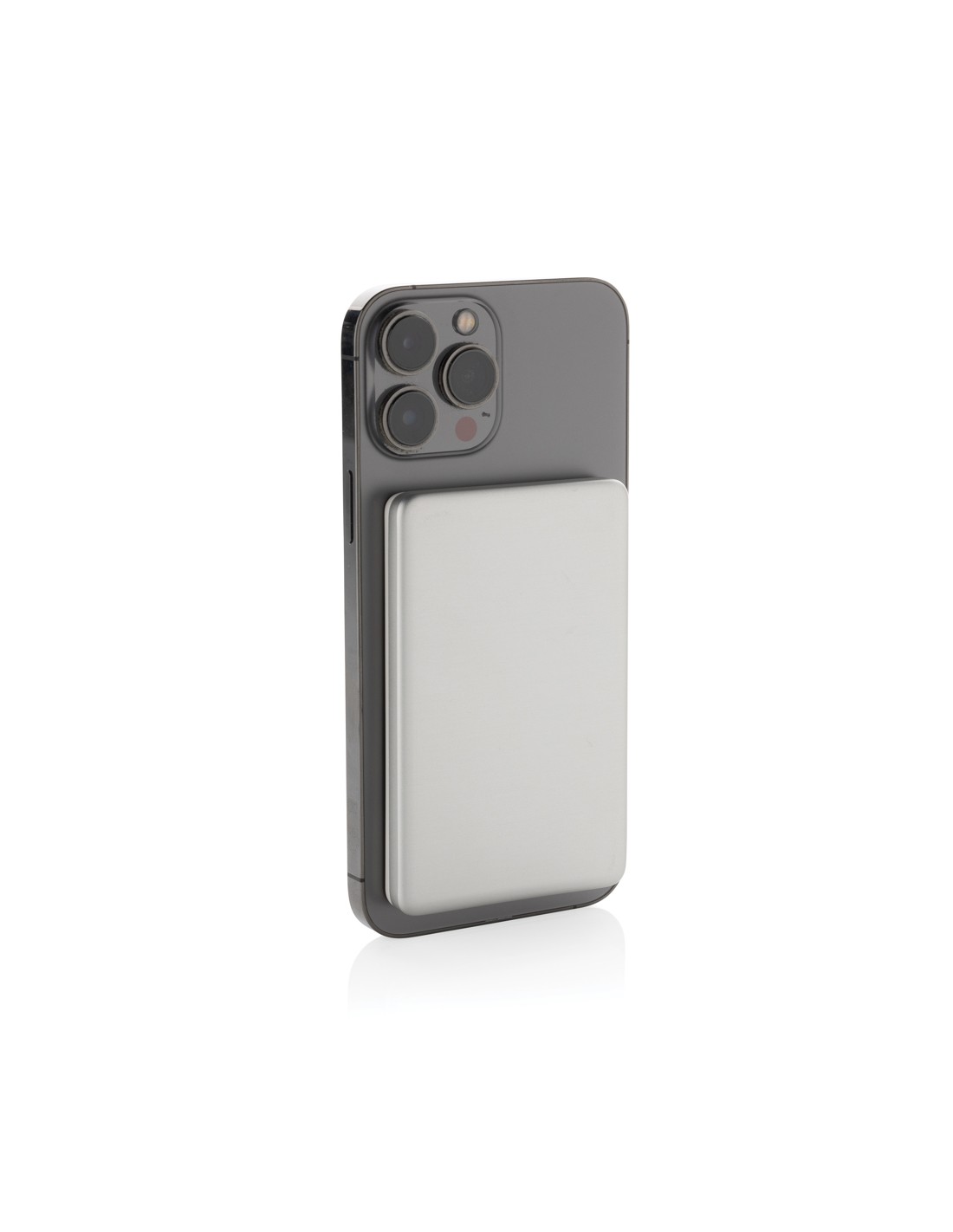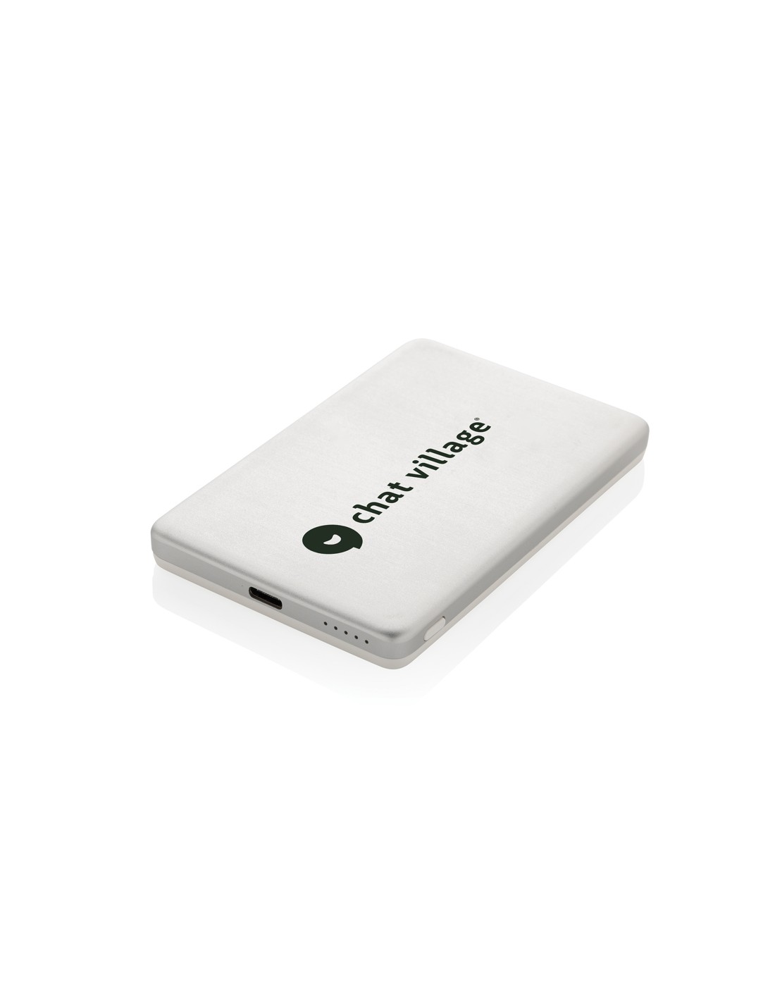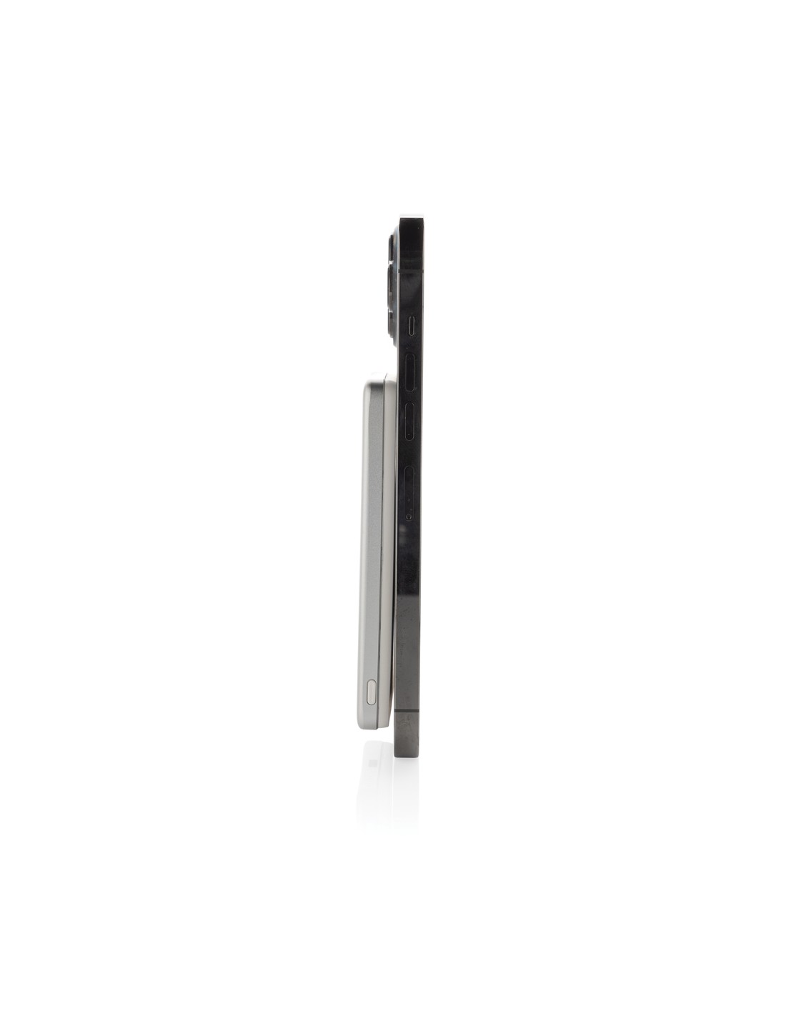 Powerbank ultrasottile da 5.000 mAh con caricatore wireless magnetico da 5W, la cui custodia è realizzata in alluminio e ABS riciclati RCS. RCS (Recycled Claim Standard) è uno standard per verificare il contenuto riciclato di un prodotto lungo l'intera catena di fornitura. Contenuto riciclato totale: 23 % in base al peso totale dell'articolo. La powerbank contiene una batteria ai polimeri di litio di grado A da 5.000 mAh a lunga durata. Gli indicatori di potenza indicano il livello di energia rimanente, in modo da sapere sempre quando ricaricare.; Input type C 5V/2.4A; output type C: 5V/2A.4A Articolo e accessori privi di PVC. Incluso cavo di ricarica in TPE riciclato certificato RCS. Imballato in una confezione FSC® mix.