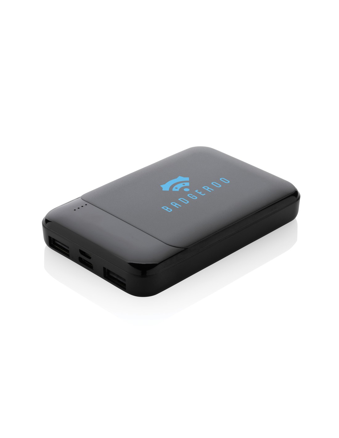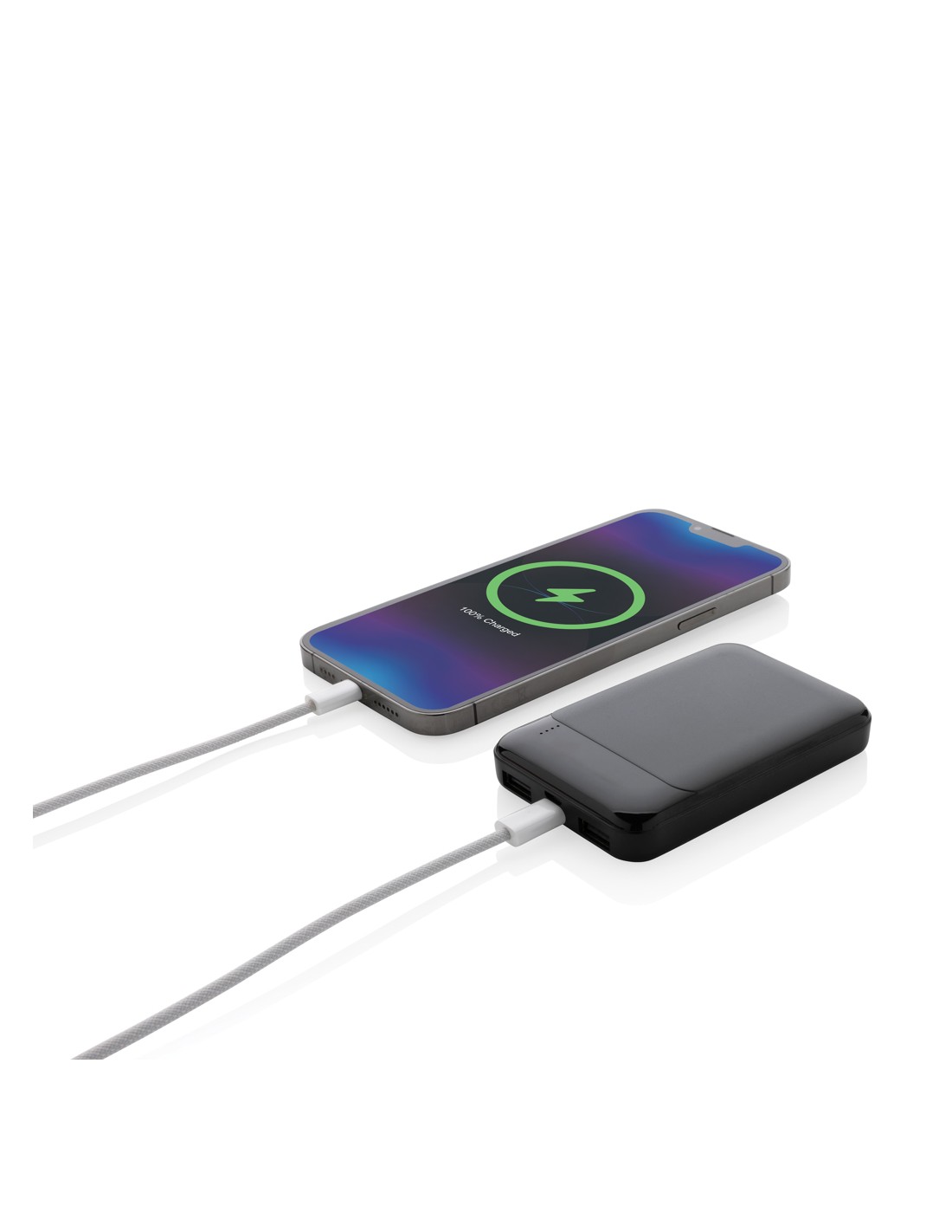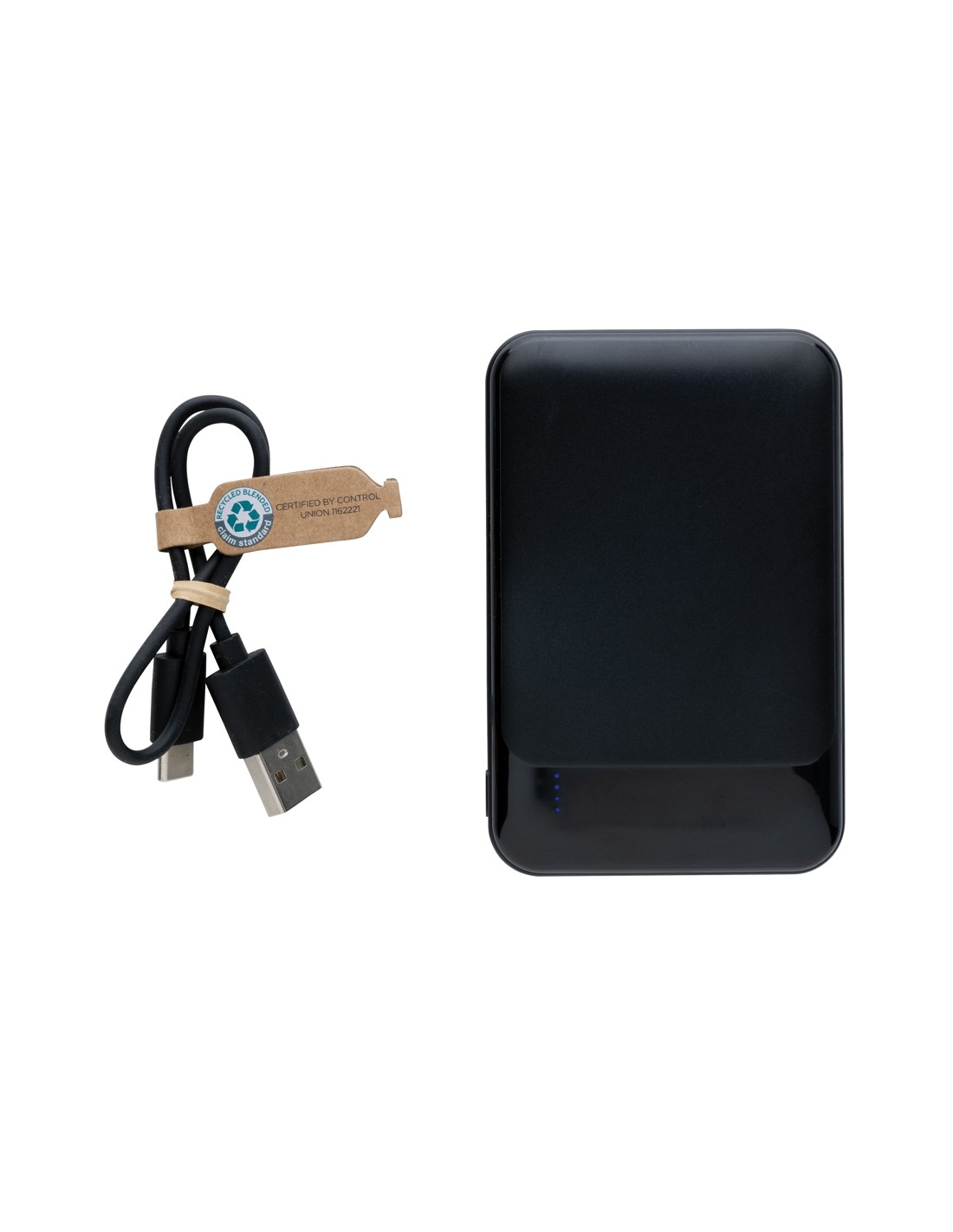 Power bank in legno con trattamento antibatterico e logo luminoso. Il logo si illumina per 30 secondi quando la batteria è carica e rimane acceso durante la ricarica. Cavo di ricarica 3 in 1 (iPhone/Android/Tipo C). Doppia uscita USB 2 A. Fornita in confezione regalo, realizzata in carta riciclata.