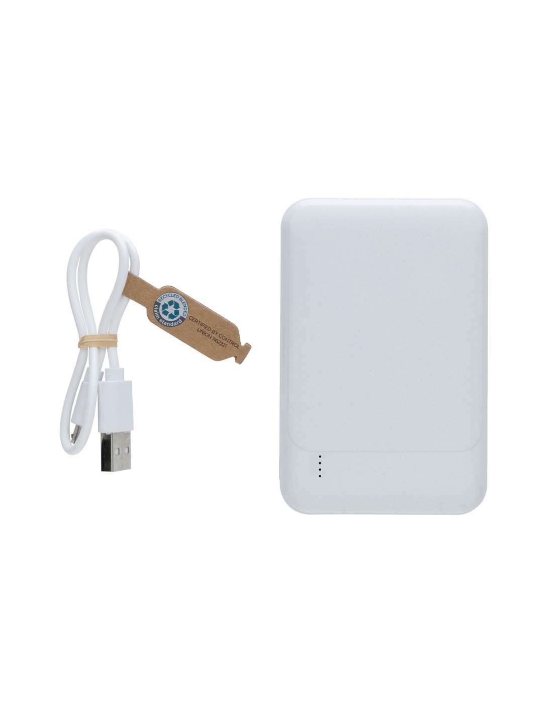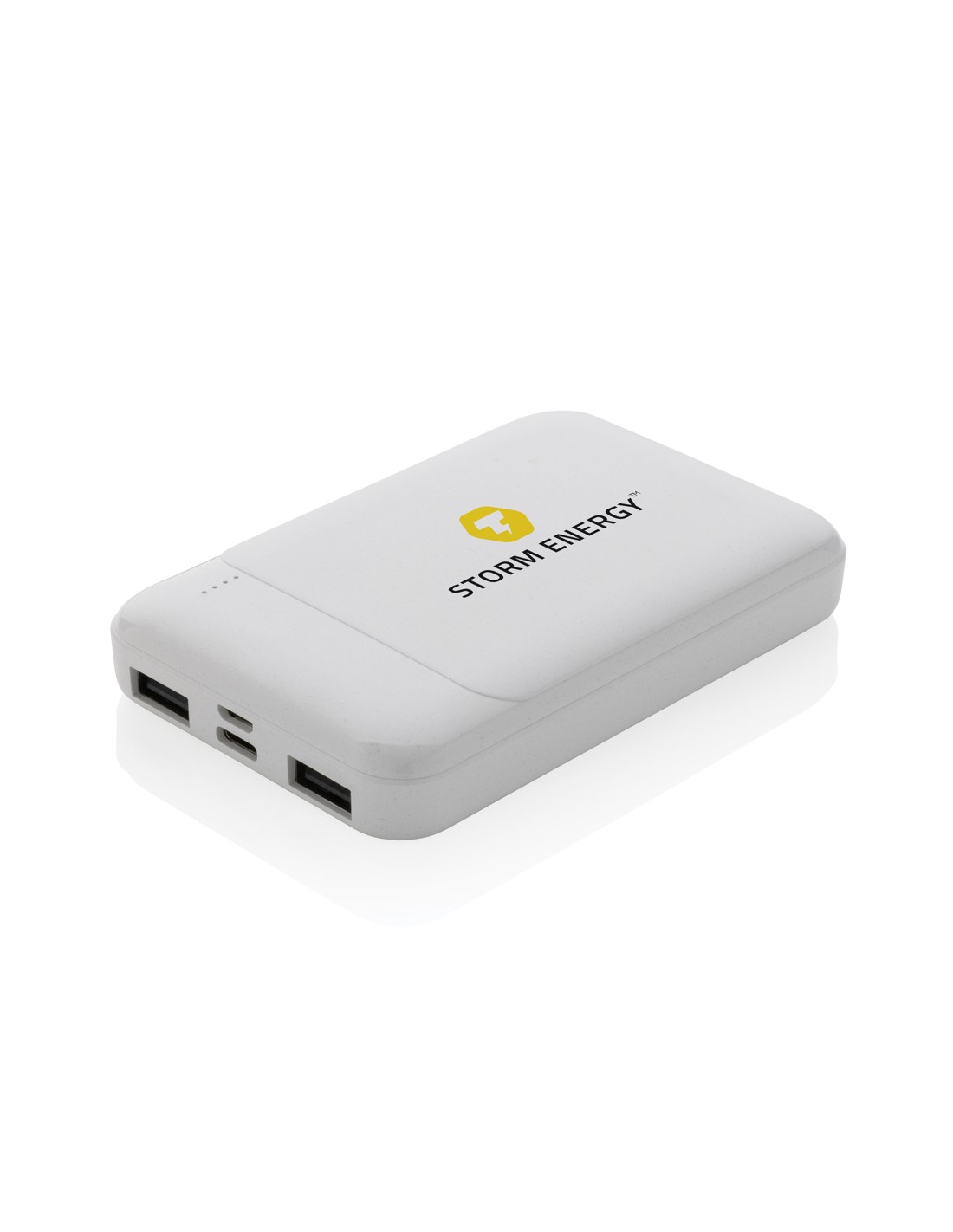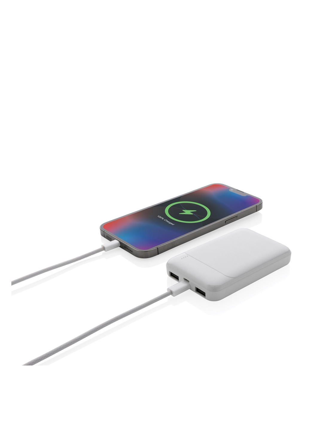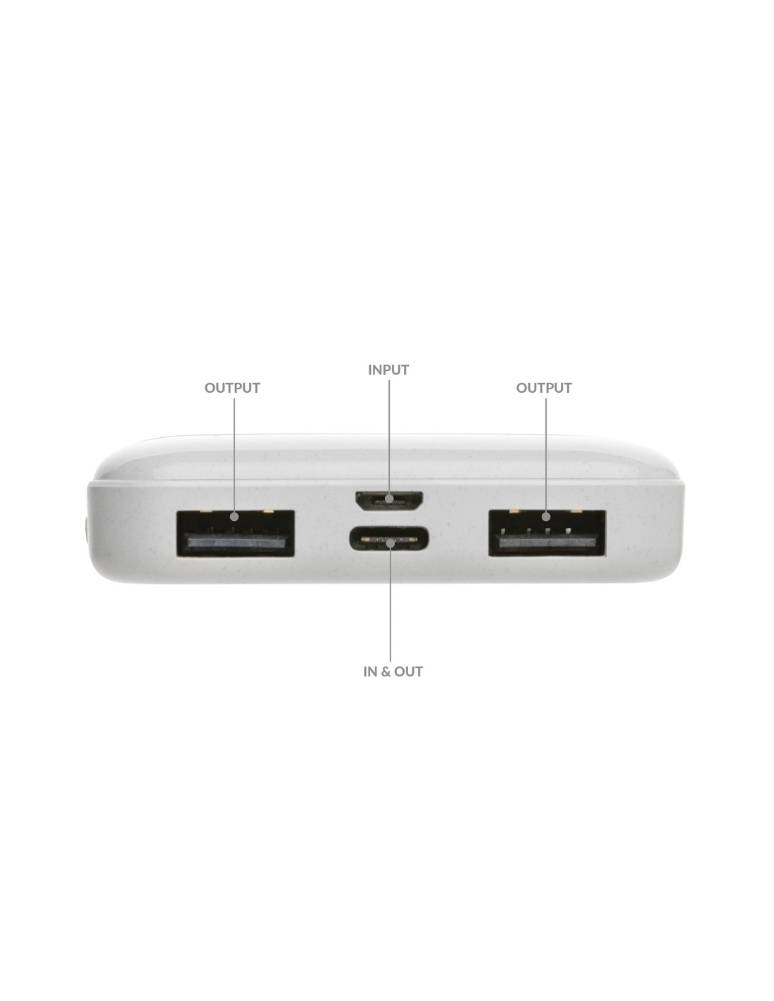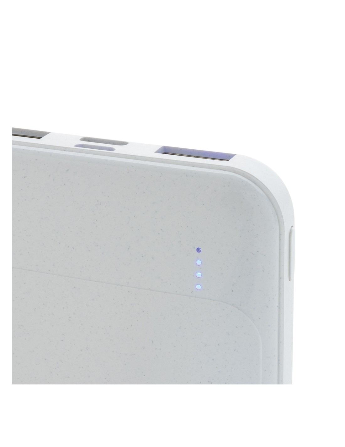 Power bank in legno con trattamento antibatterico e logo luminoso. Il logo si illumina per 30 secondi quando la batteria è carica e rimane acceso durante la ricarica. Cavo di ricarica 3 in 1 (iPhone/Android/Tipo C). Doppia uscita USB 2 A. Fornita in confezione regalo, realizzata in carta riciclata.