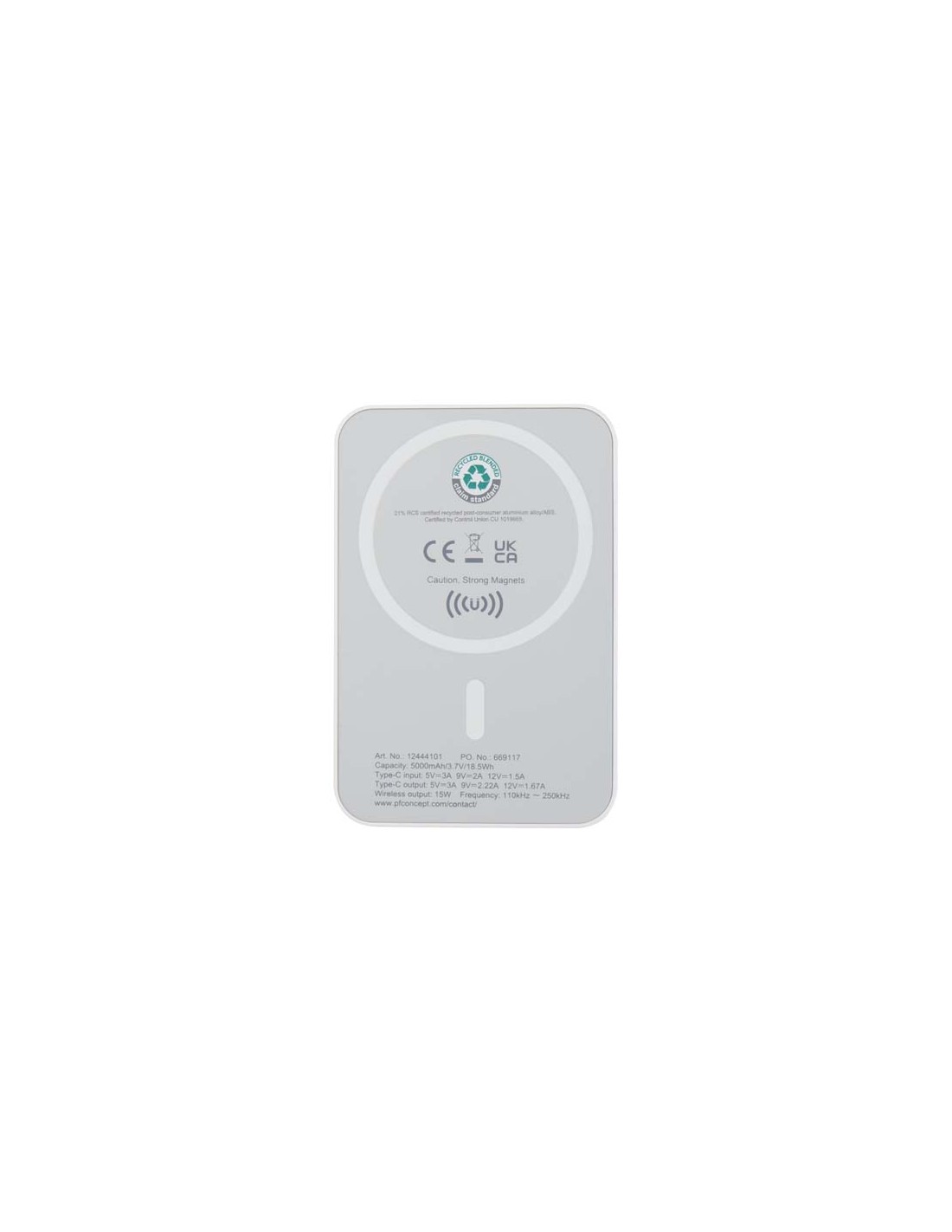 Powerbank tascabile da 10.000 mAh con caricatore magnetico wireless da 5W in custodia realizzata in plastica ABS riciclata certificata RCS. RCS (Recycled Claim Standard) è uno standard per la verifica del contenuto riciclato di un prodotto lungo tutta la catena di fornitura. Contenuto riciclato...