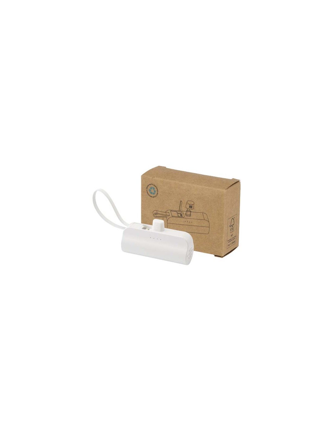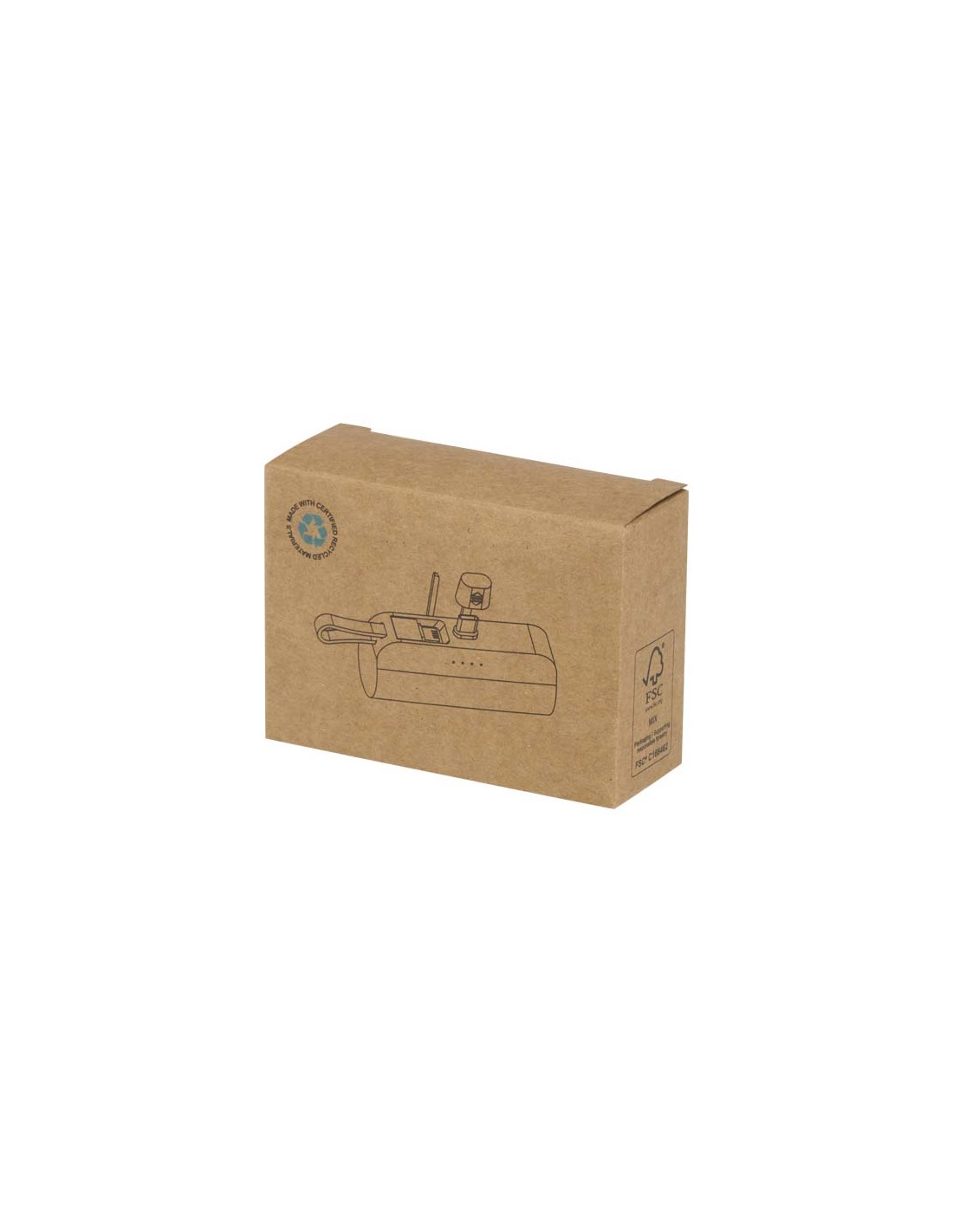 Power bank da 8000 mHa in alluminio riciclato. Adatto a smartphone, output DC5V/1A. E DC5V/2A. Include indicatore di luce e cavo USB con micro USB.