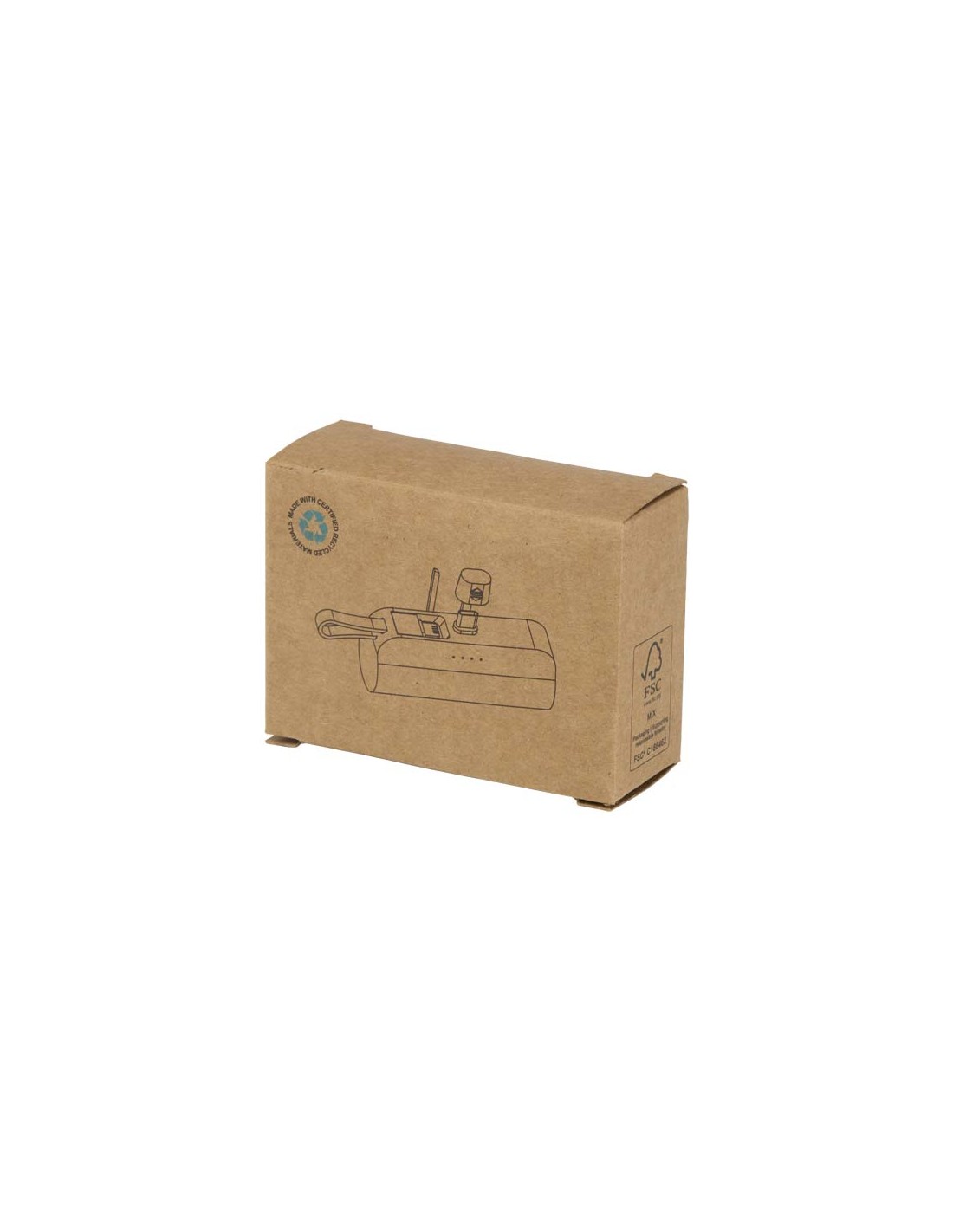 Power bank da 8000 mHa in alluminio riciclato. Adatto a smartphone, output DC5V/1A. E DC5V/2A. Include indicatore di luce e cavo USB con micro USB.