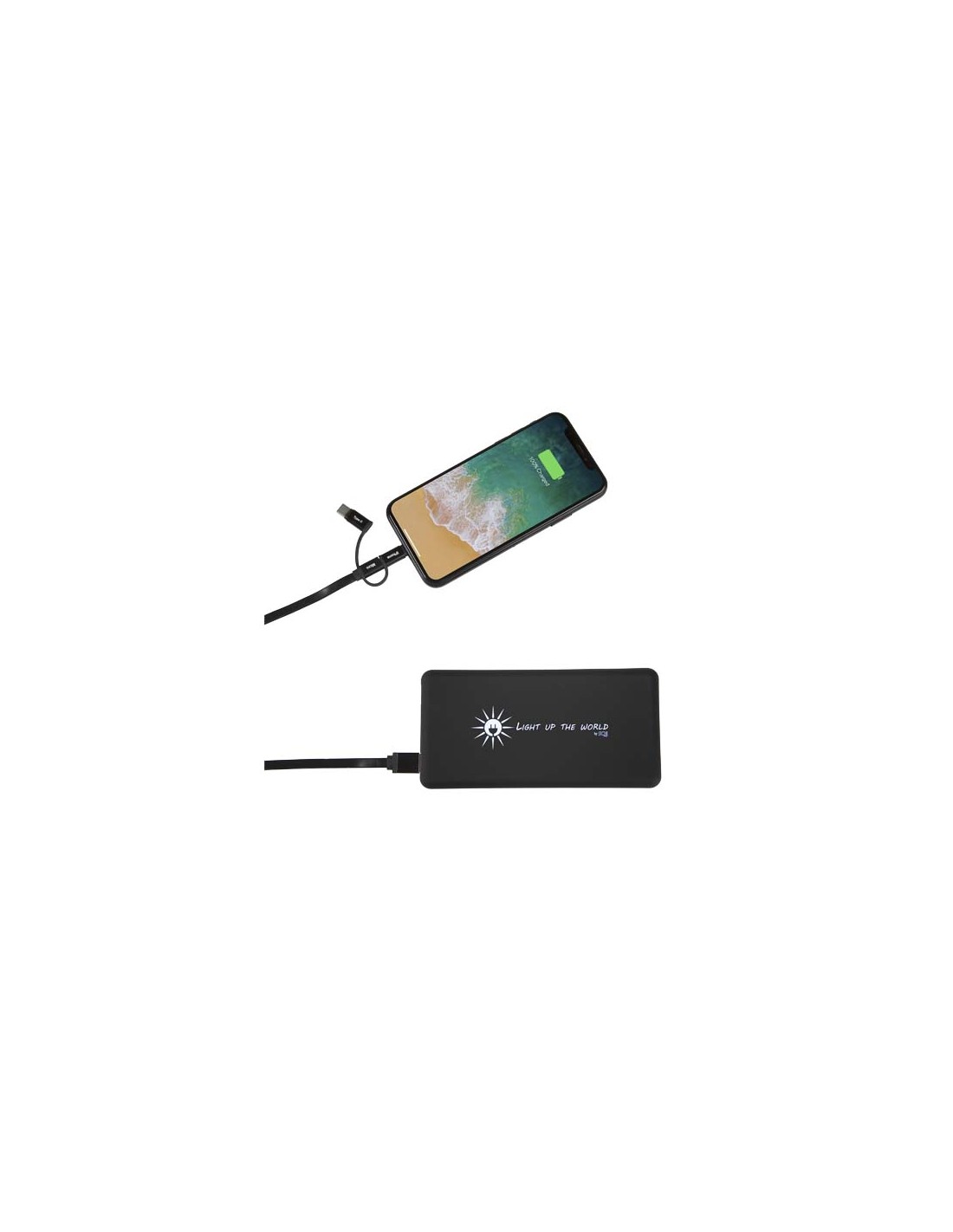 Power bank luminoso da 8.000 mAh a carica solare con cavo 3 in 1 in PET riciclato (tipo C, Android, iPhone). Il pannello solare è realizzato in silicio monocristallino. La ricarica può essere effettuata anche tramite il cavo in dotazione. Il dispositivo si illumina per 30 secondi quando viene toccato o ricaricato. Capacità: 8000 mAh. Ingresso: 5 V/1 A (USB). Uscita: 5 V/2 A. Tempo di ricarica solare/luce artificiale: 240 mAh/ora (circa 27 ore per una carica completa). Può essere ricaricato anche con il cavo in dotazione. Dimensione: 153 x 76 x 13,5 mm. Fornito in una confezione regalo realizzata in carta riciclata.