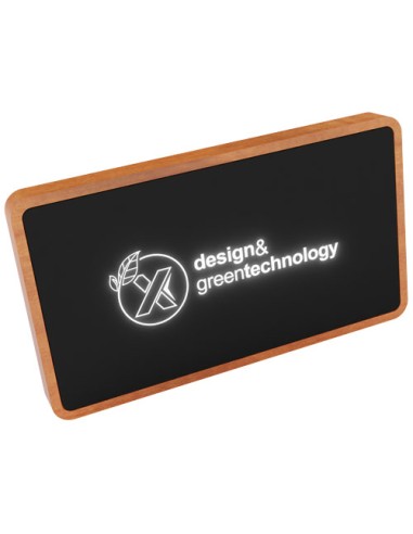 Power bank in legno ecologico da 5.000 mAh con funzione di ricarica wireless, che può essere decorato con un logo luminoso. Il logo si illumina per 30 secondi quando la batteria è carica e rimane acceso durante la ricarica. Fornito in una confezione regalo di carta riciclata, con un cavo 3 in 1 (iPhone/Android/Tipo-C) realizzato in RPET (bottiglie riciclate). Doppia uscita USB 2 A. 5 W. Finitura in gomma antibatterica. Brevetto EUIPO EUROPA.