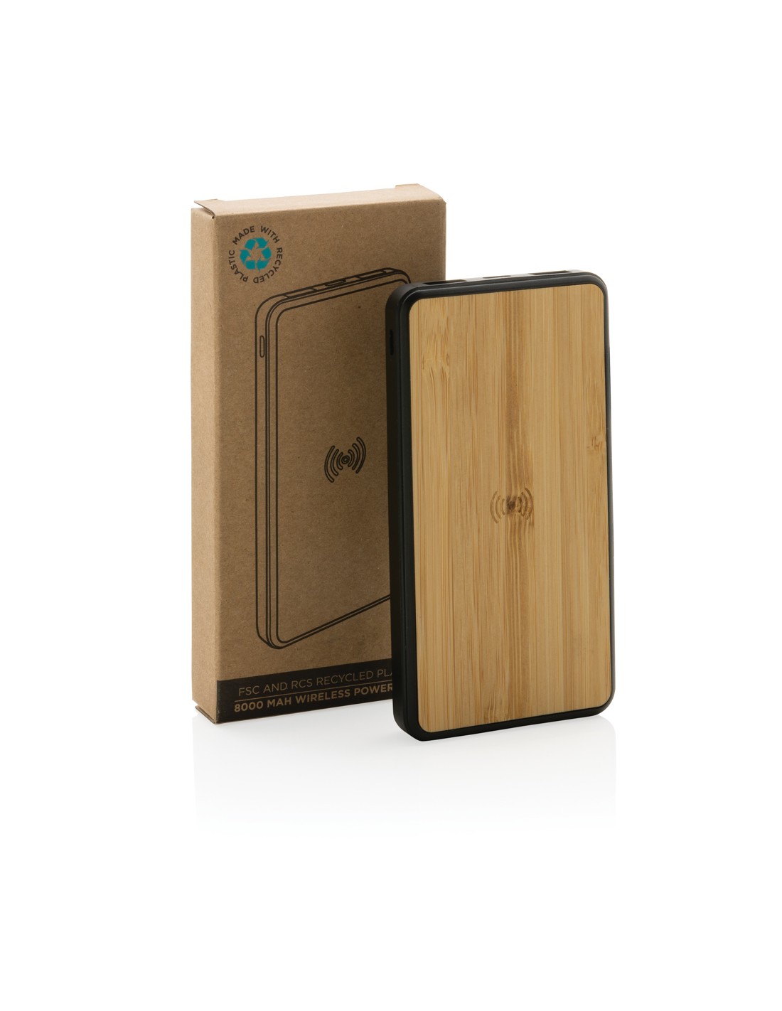Powerbank da 8.000 mAh realizzata con plastica ABS riciclata certificata RCS (Recycled Claim Standard) con finitura soft touch e bambù certificato FSC®. Contenuto totale riciclato: 17% in base al peso totale dell'articolo. La certificazione RCS garantisce una filiera completamente certificata dei materiali riciclati. Ricarica sia in modalità wireless 5W che via cavo tramite USB. Input sia tramite micro USB che type C. Quando è completamente carica avrai a disposizione energia sufficiente per ricaricare il tuo cellulare fino a quattro volte. La powerbank contiene una batteria ai polimeri di litio di grado A da 8.000 mAh di lunga durata. Le spie di alimentazione indicheranno il livello di energia rimanente in modo da sapere sempre quando ricaricare. Input micro 5V/2A Input tipo C 5V/2A Output USB 5V/2,4A. Output Wireless 5W 5V/1A. Confezionato in scatola FSC® mix. Include cavo di ricarica in TPE riciclato certificato RCS.