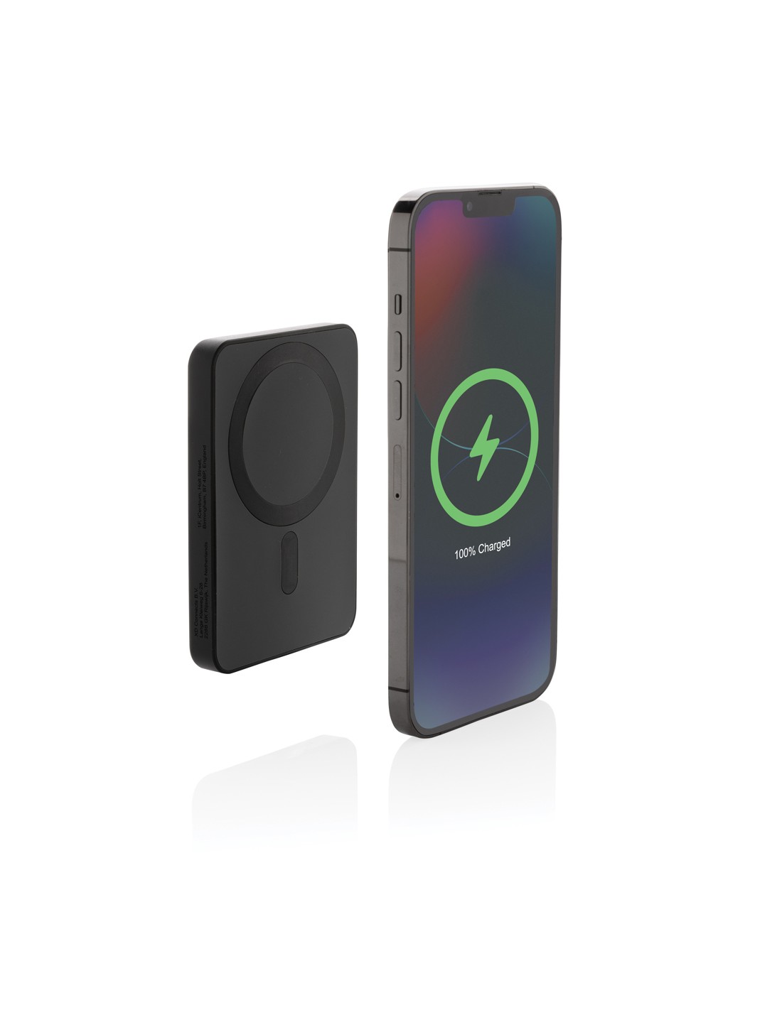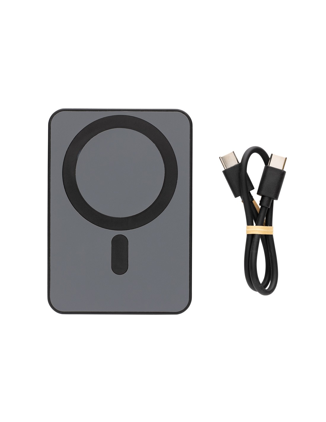 Powerbank tascabile da 5.000 mAh con caricatore wireless magnetico da 5W, la cui custodia è realizzata in plastica ABS riciclata certificata RCS. RCS (Recycled Claim Standard) è uno standard per verificare il contenuto riciclato di un prodotto lungo l'intera catena di fornitura. Contenuto riciclato totale: 20% in base al peso totale dell'articolo. La powerbank contiene una batteria ai polimeri di litio di grado A da 5.000 mAh a lunga durata. Gli indicatori di potenza indicano il livello di energia rimanente, in modo da sapere sempre quando è necessario ricaricare. Input Type-C 5V/2.4A; Output Type-C 5V/2A.4A. Articolo e accessori senza PVC. Include un cavo di ricarica in TPE riciclato certificato RCS. Confezionato in scatola FSC® mix.