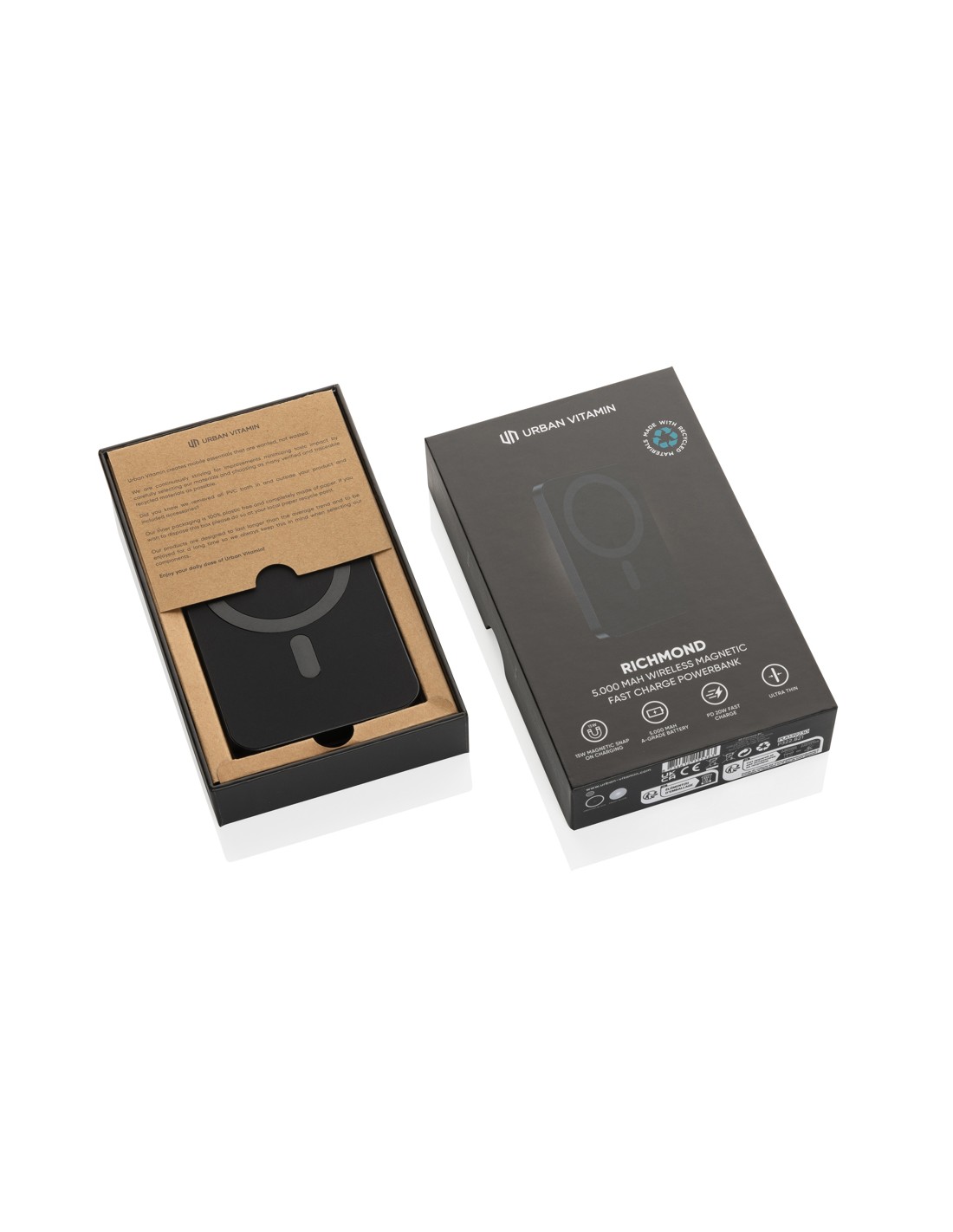 Grazie alla tecnologia magnetica, Richmond si aggancia facilmente all'iPhone 12 e successivi, nonché ai telefoni Android di nuova generazione, assicurando una connessione perfetta per una ricarica veloce a 15W. Supporta la ricarica rapida a 20W tramite la porta Type-C, sia per ricaricarsi che per ricaricare il dispositivo. Non potrebbe essere più semplice: basta inserire Richmond nel telefono e assistere alla magia! Il nostro design intelligente avvia automaticamente la ricarica nel momento in cui viene collegato, assicurando che i vostri dispositivi siano sempre carichi di energia quando ne avete bisogno. Crediamo nella qualità che dura nel tempo, ed è per questo che Richmond è dotata di una batteria di alta qualità da 5000 mah al 100% di cobalto. Questa batteria dura più a lungo e ha prestazioni migliori rispetto alle normali batterie al litio. Realizzata con alluminio e ABS riciclati certificati RCS (Recycled Claim Standard).