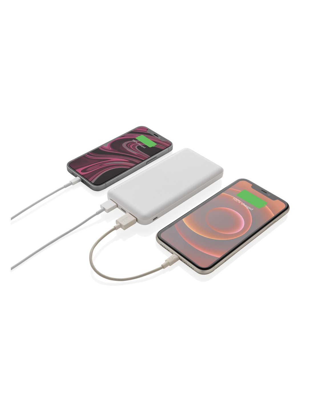 Potente powerbank tascabile da 10.000 mAh in ABS leggero. A piena carica può ricaricare il tuo smartphone circa cinque volte grazie alla batteria ai polimeri di litio ad alta densità di grado A da 10.000 mAh di lunga durata. Include 2 porte USB. Include indicatori luminosi di batteria residua così saprai quando è il momento di doverla ricaricare. Input: 5V/2A; Input Type C 5V2A; Output USB1: 5V/2A. Output USB2: 5V/1A.