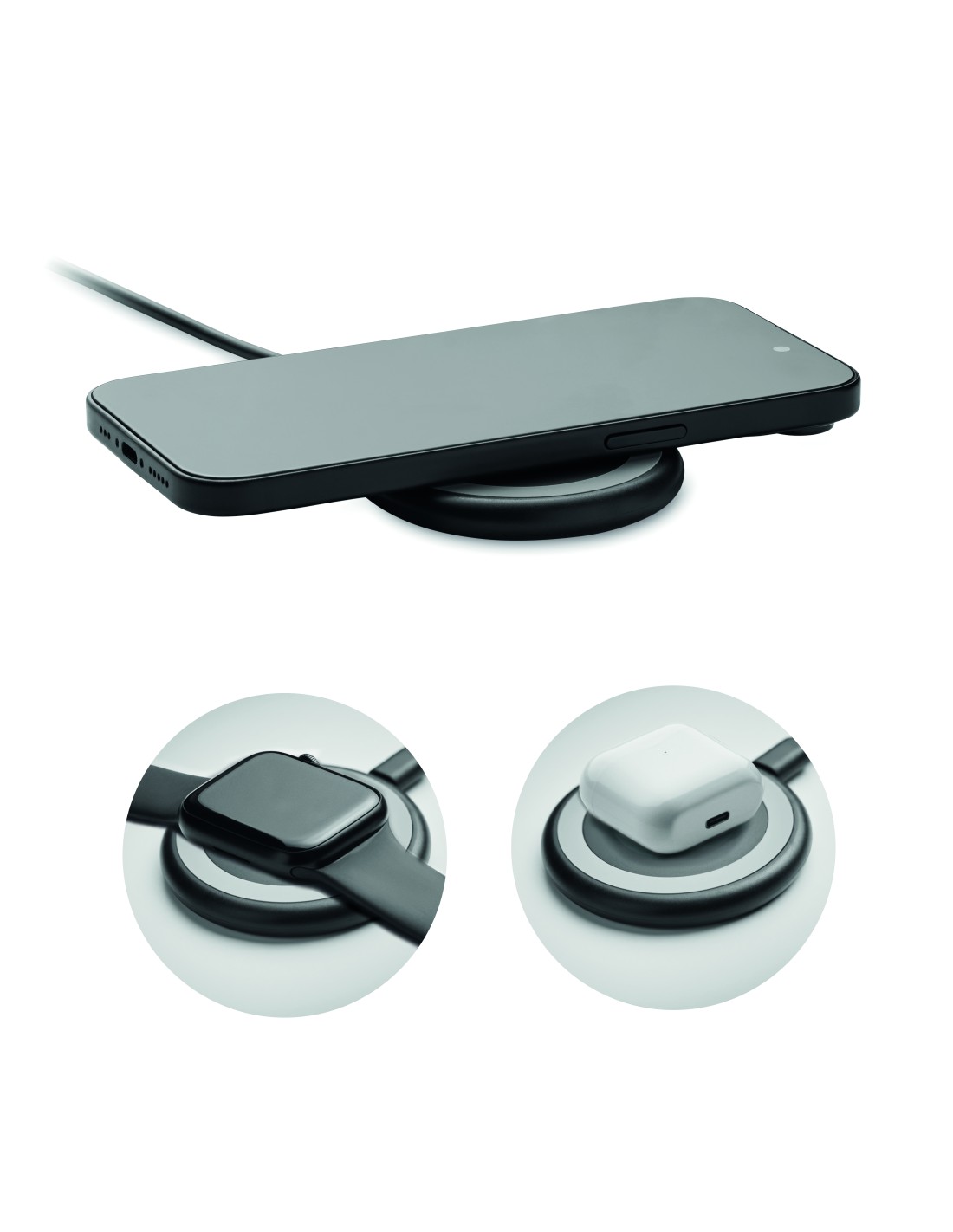 Caricatore wireless 3 in 1 da 15W. Include un caricatore wireless magnetico da 15W, un caricatore per smartwatch (solo Apple®) e un caricatore TWS. Lunghezza del cavo: 1M. Ingresso: 2-in-1 Tipo-C e Tipo-A.