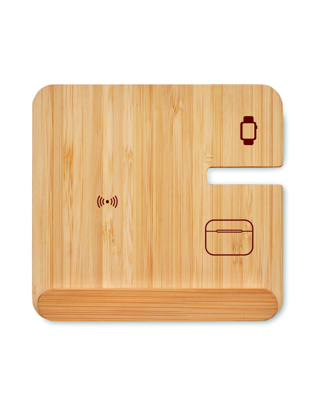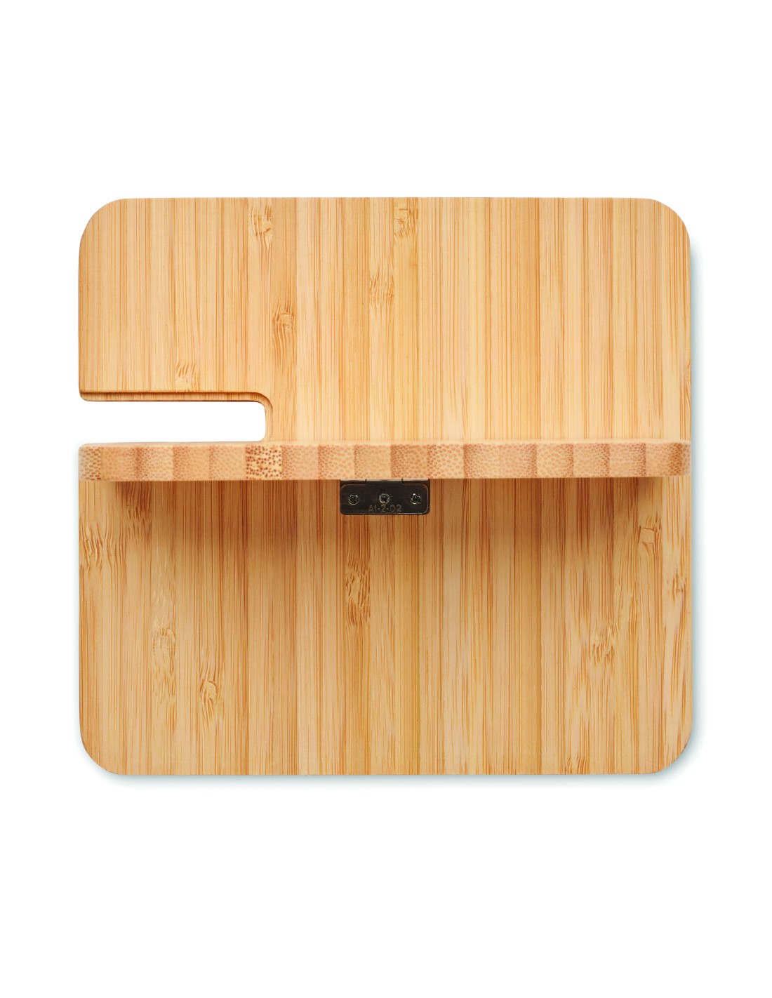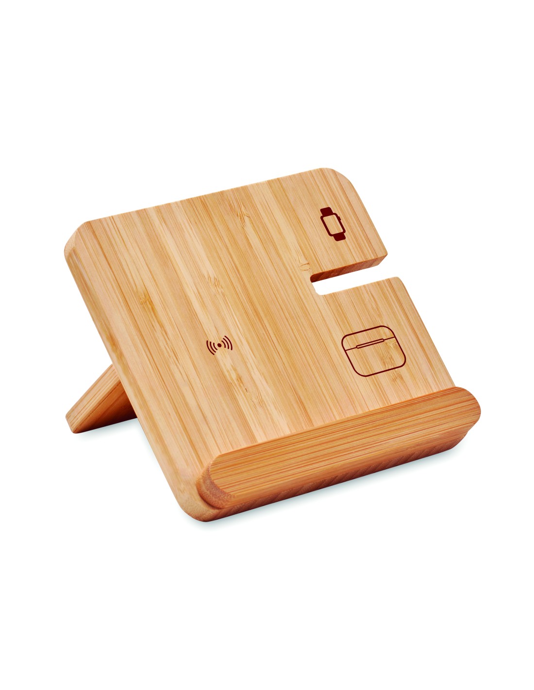 Stazione di ricarica 3 in 1 pieghevole con custodia in bamboo e supporto per telefono. Include un caricatore wireless a doppia bobina da 15 W, un caricatore per smartwatch (solo Apple®) e un caricatore TWS.