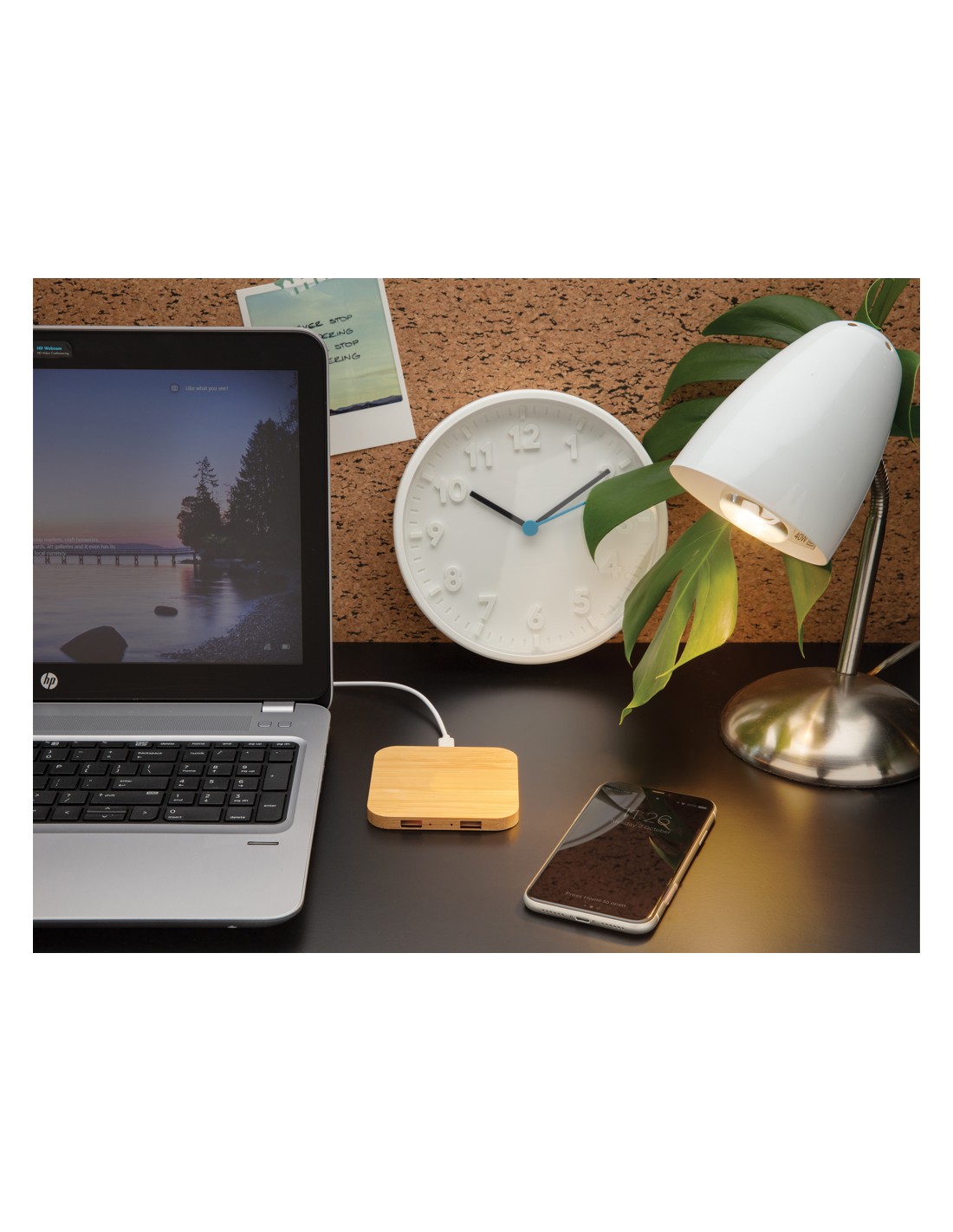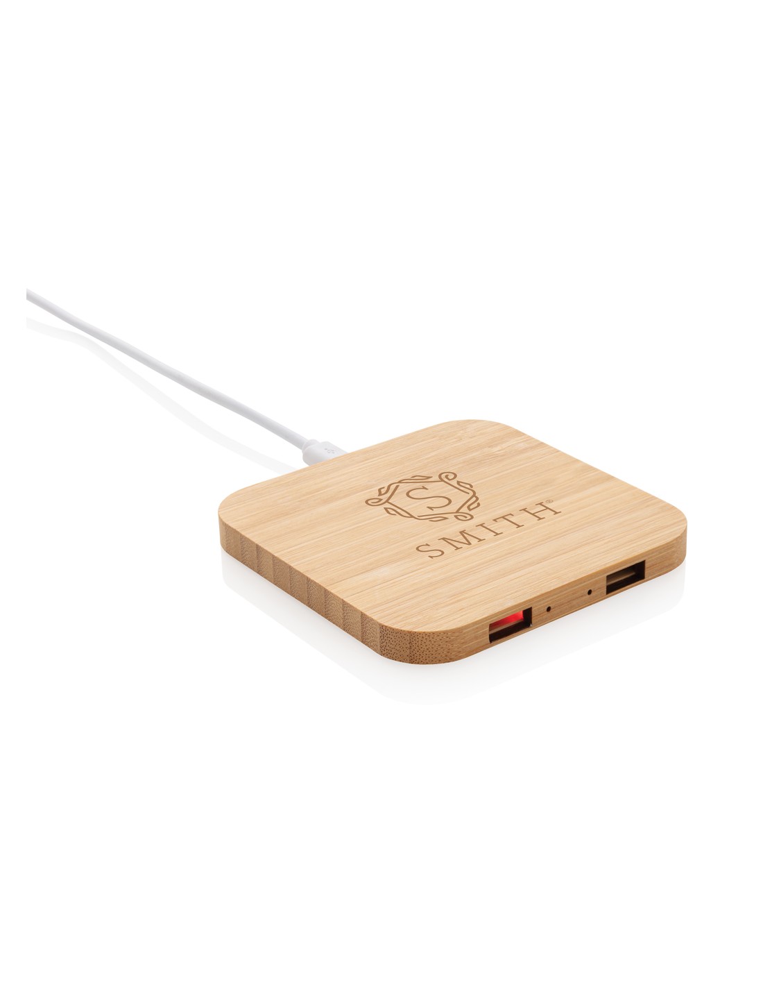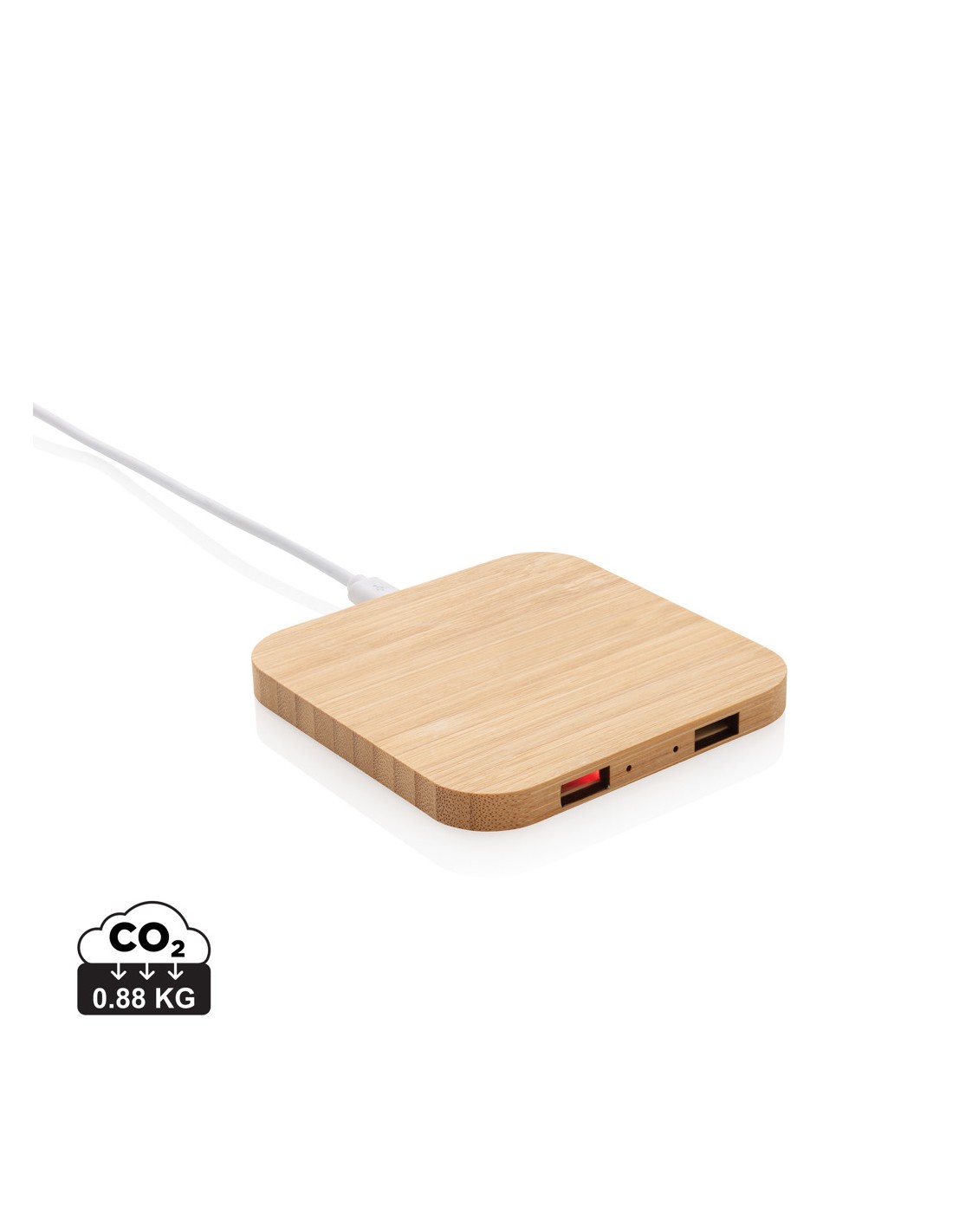 Caricatore wireless da 5W realizzato in bambù certificato FSC al 100% con due porte USB integrate. Include cavo micro USB in TPE da 150 cm. Compatibile con tutti i dispositivi abilitati QI come Android di ultima generazione, iPhone 8 e versioni successive. Input: 5V/2A; Output USB, 5V/2A; output wireless: 5V/1A - 5W. Articolo e accessori 100% senza PVC. Confezionato in scatolina FSC mix.