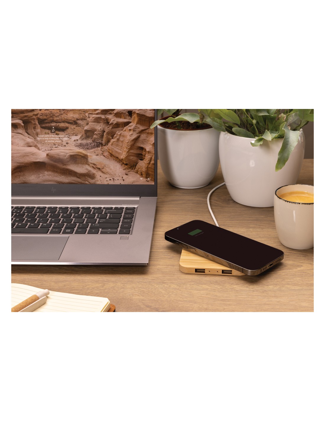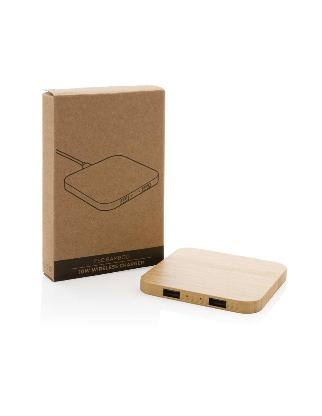 Caricatore wireless veloce da 10W in bambù FSC® 100%. Ricarica wireless compatibile con Android di ultima generazione, iPhone 8 e superiori. Articolo e accessori senza PVC. Include cavo di ricarica di type C da 150 cm in TPE riciclato certificato RCS. Confezionato in scatola FSC® mix. Type C in; Input 5V/2A; 9V/2A; Output wireless 5V/1A; 9V/1,1A (10W).
