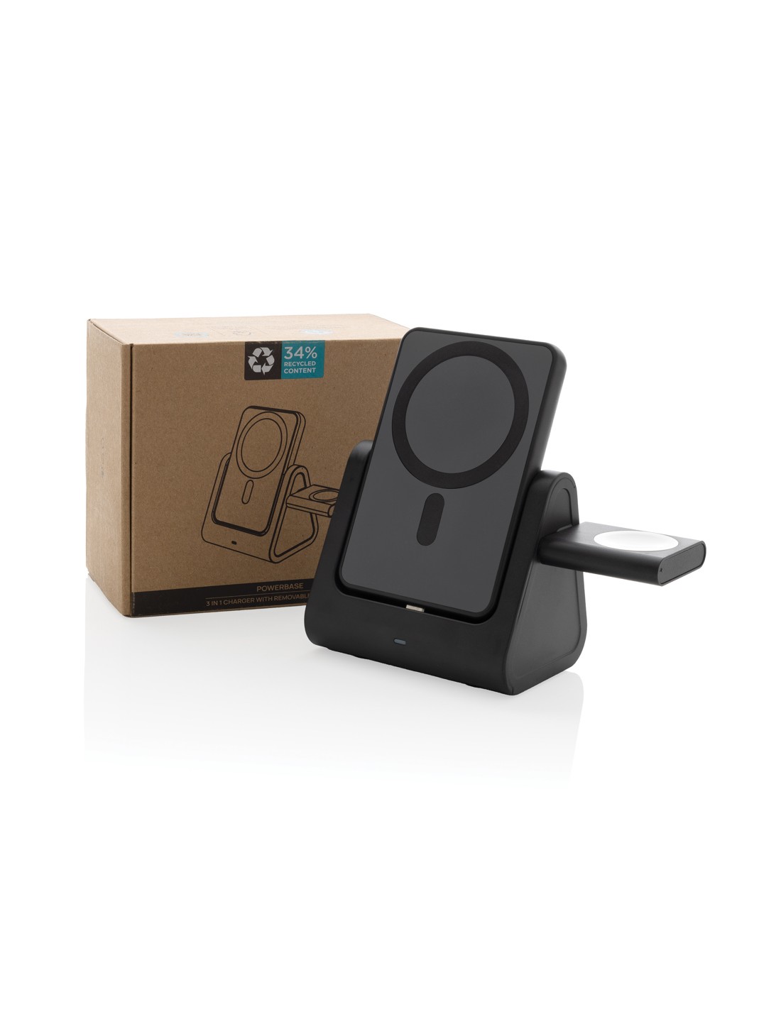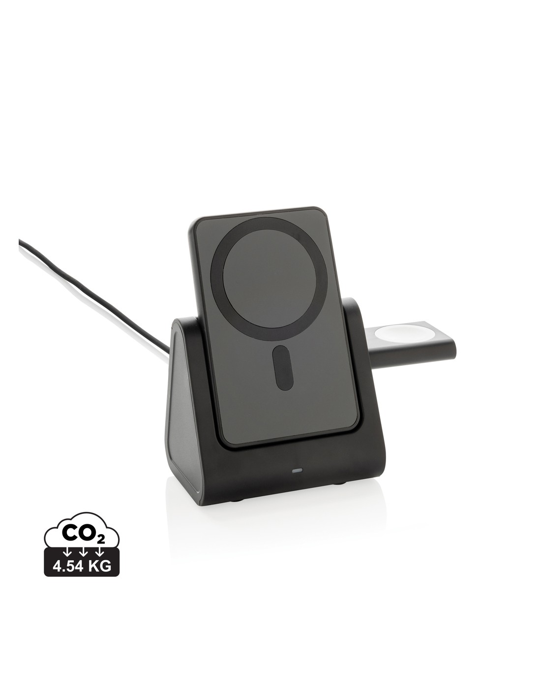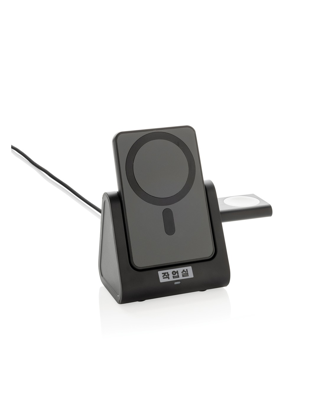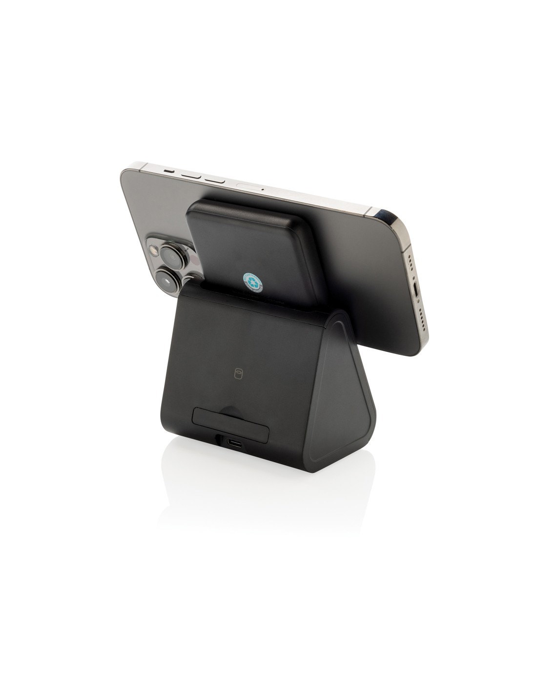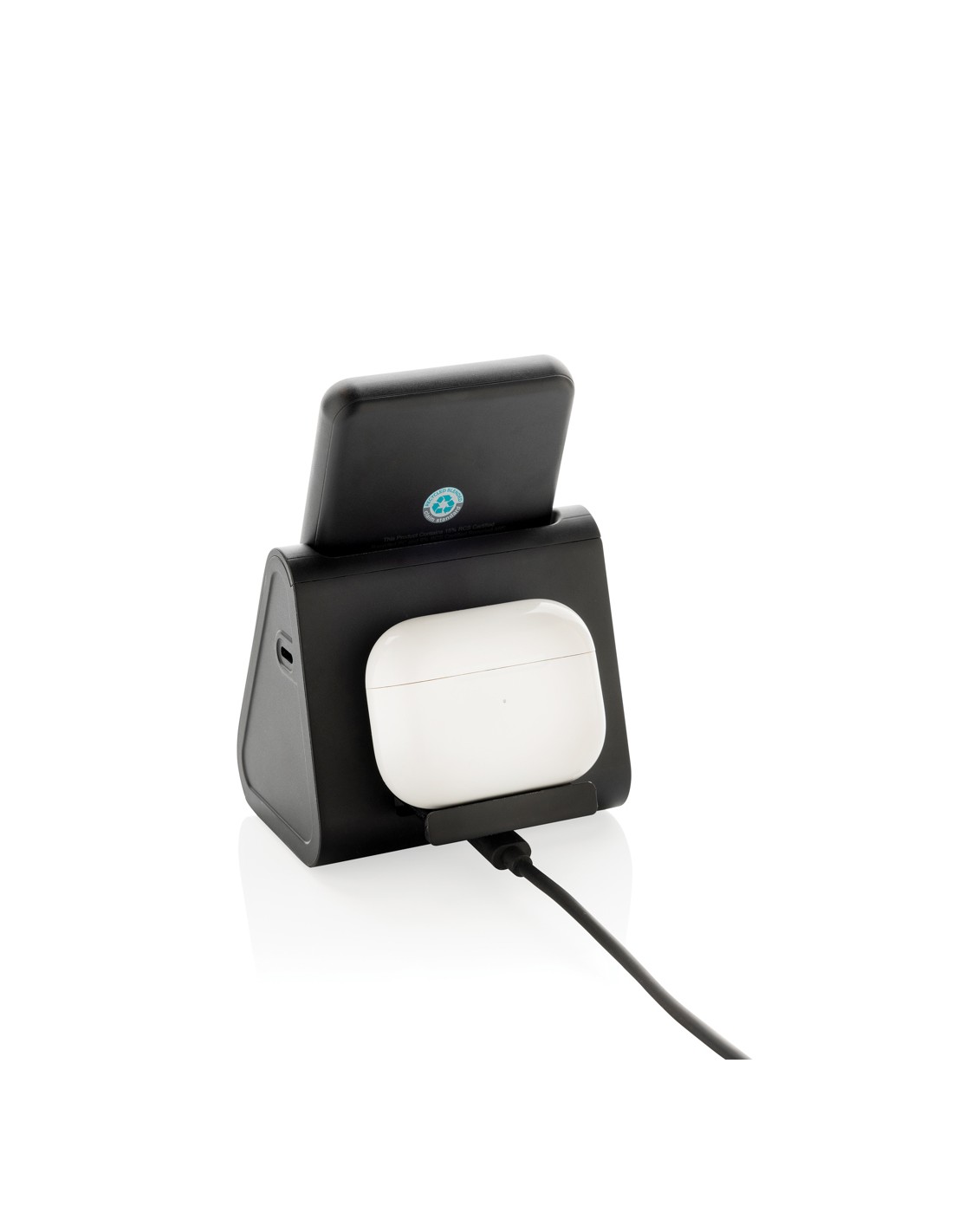 Caricabatterie wireless in alluminio riciclato con dettaglio superiore in noce. Collegare il dispositivo al computer, posizionare lo smartphone su di esso e lasciare che si ricarichi. Uscita: DC 9V/1,67A (15W).