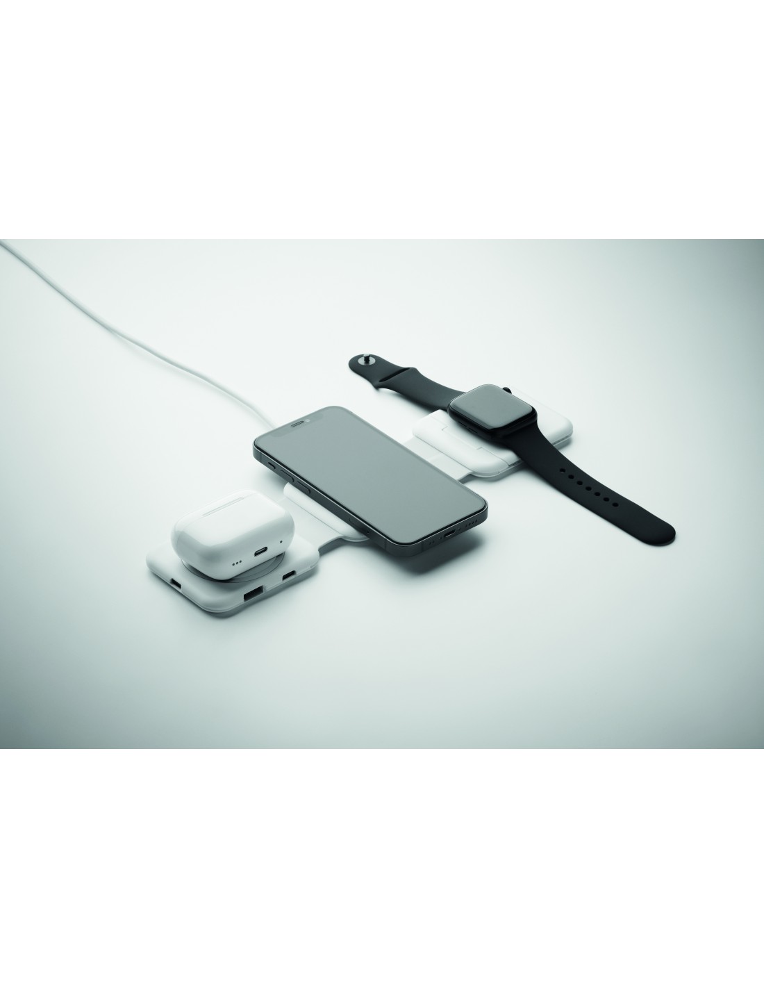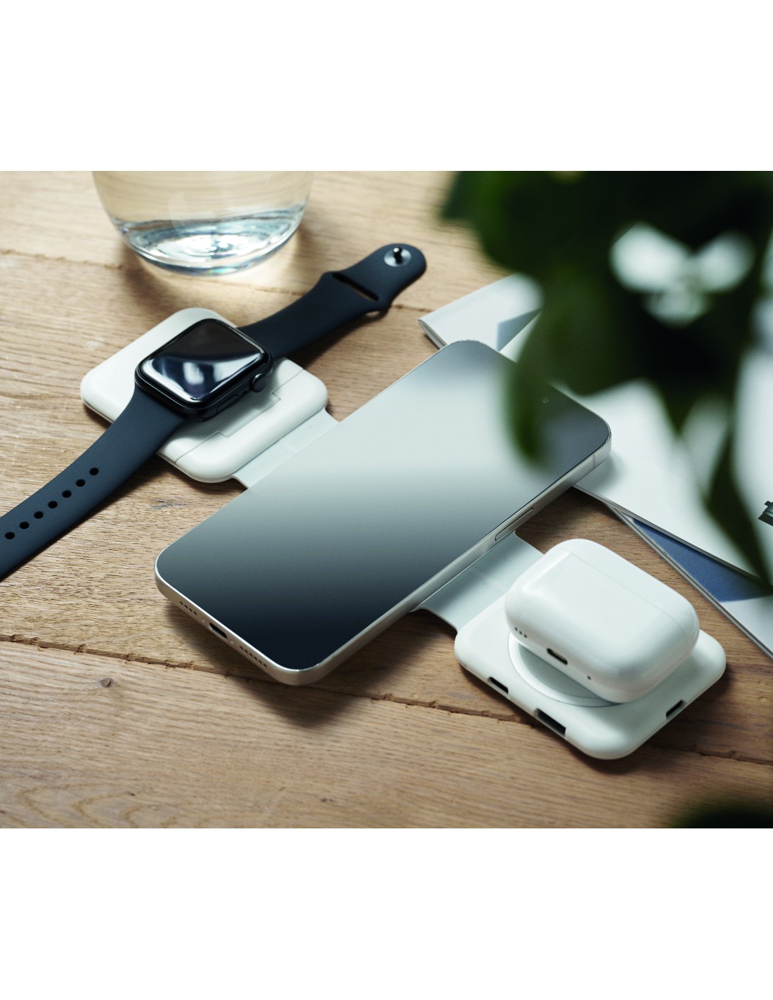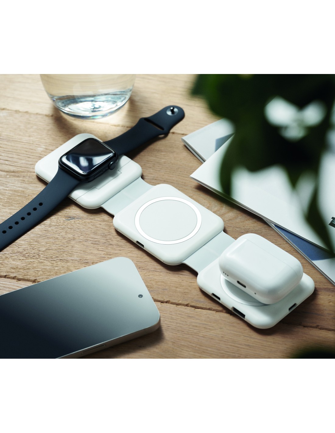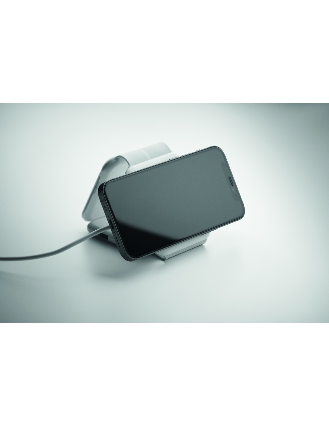 Stazione di ricarica 2 in 1 pieghevole in ABS. Include un caricatore wireless da 15 W e un caricatore per smartwatch (solo Apple®).