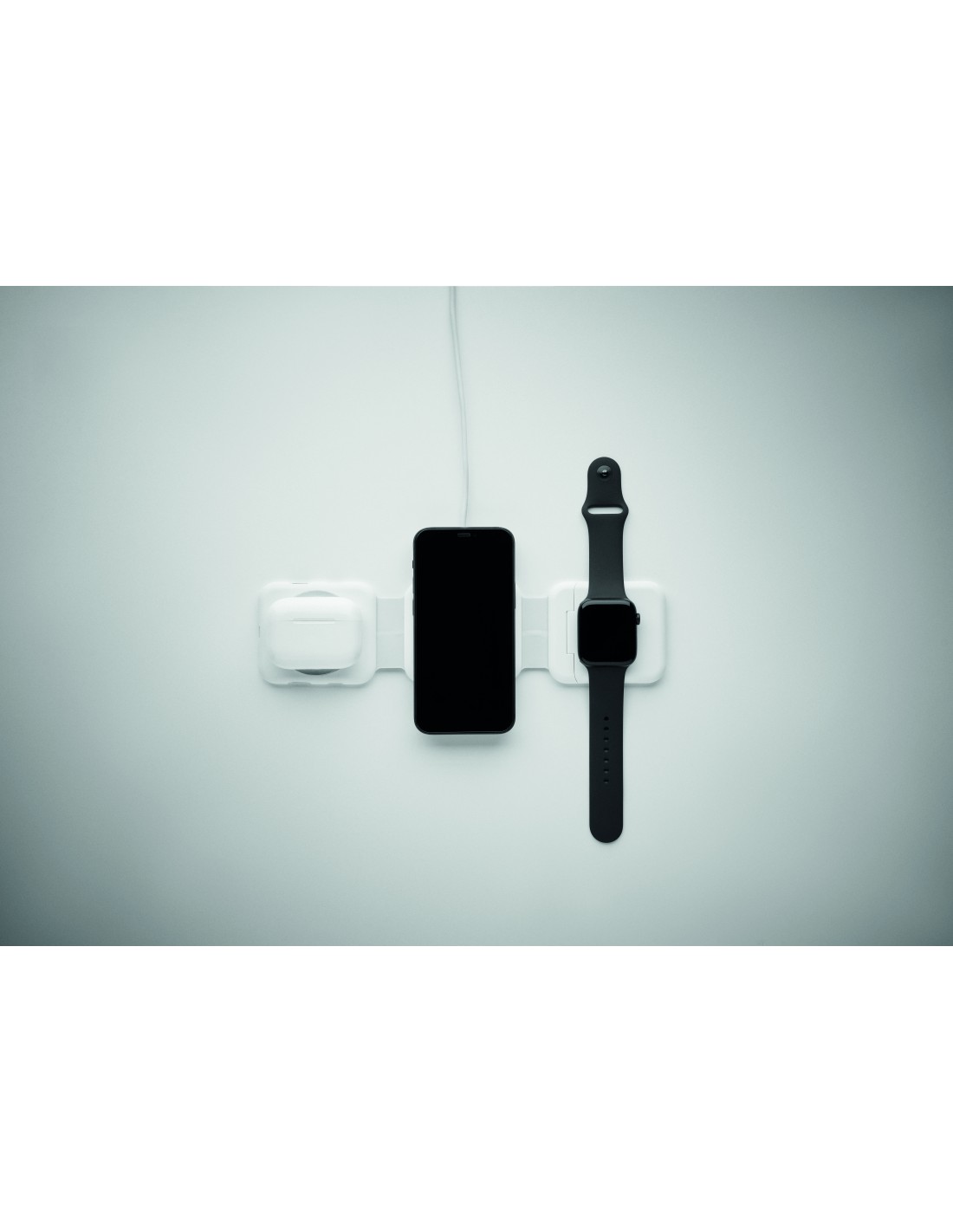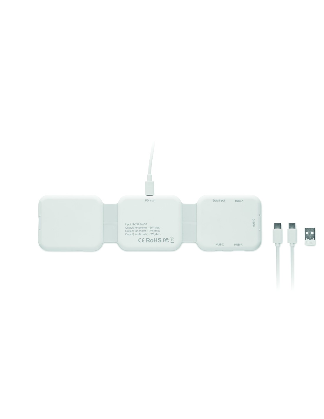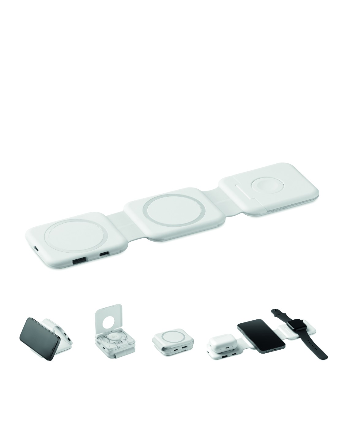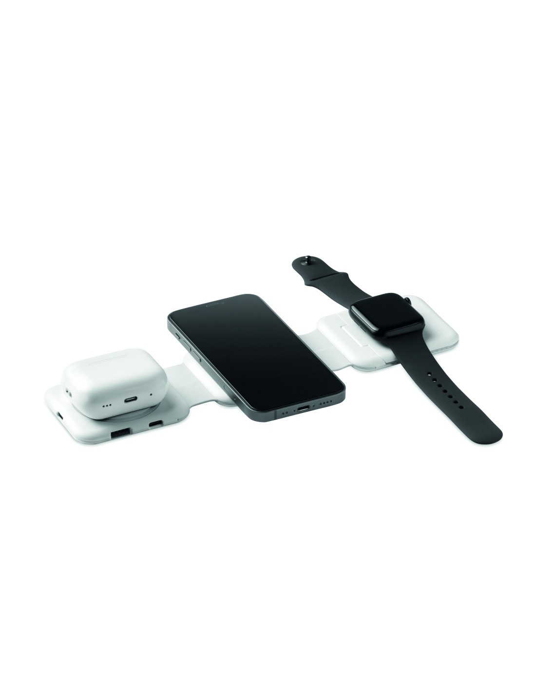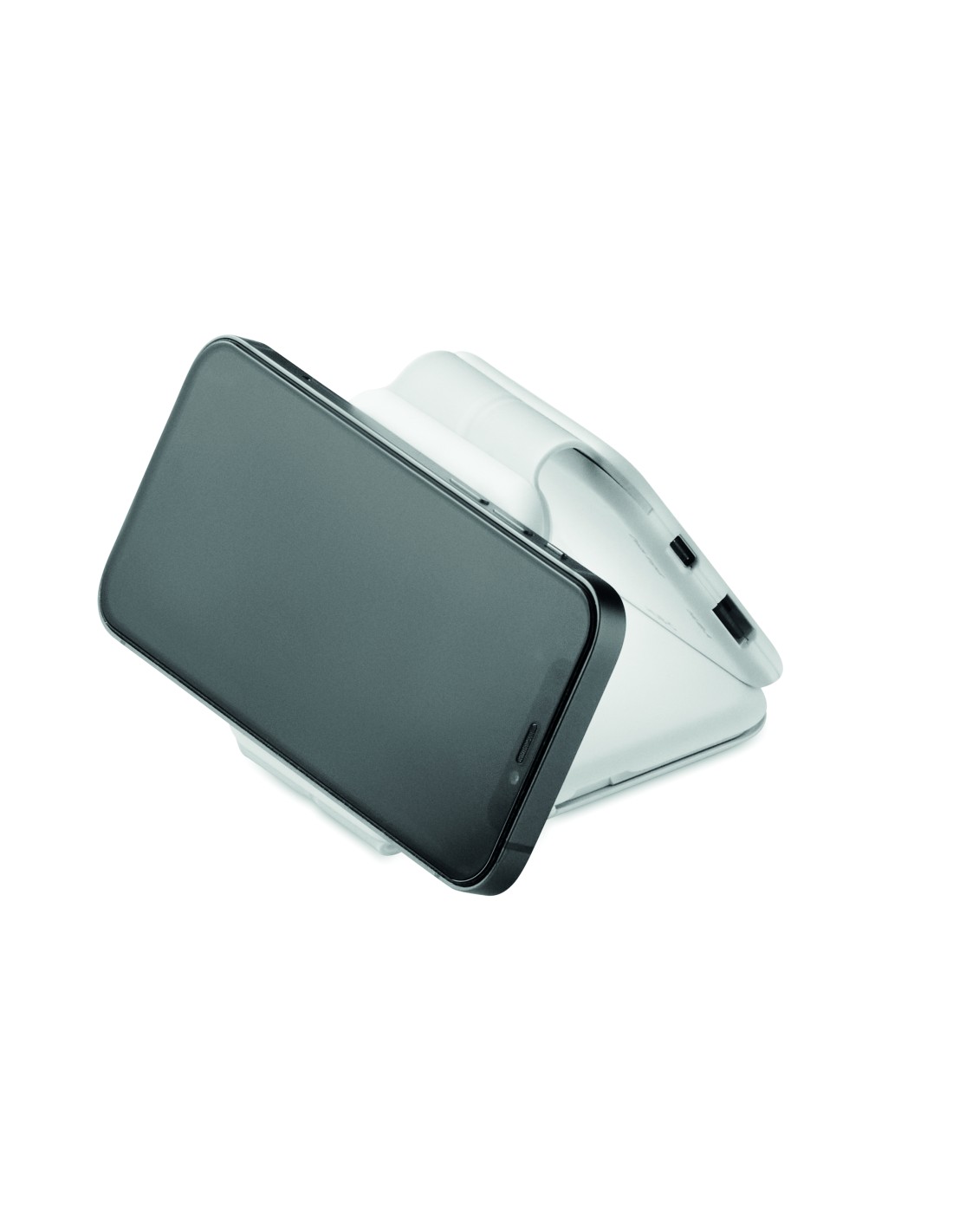 Stazione di ricarica 2 in 1 pieghevole in ABS. Include un caricatore wireless da 15 W e un caricatore per smartwatch (solo Apple®).