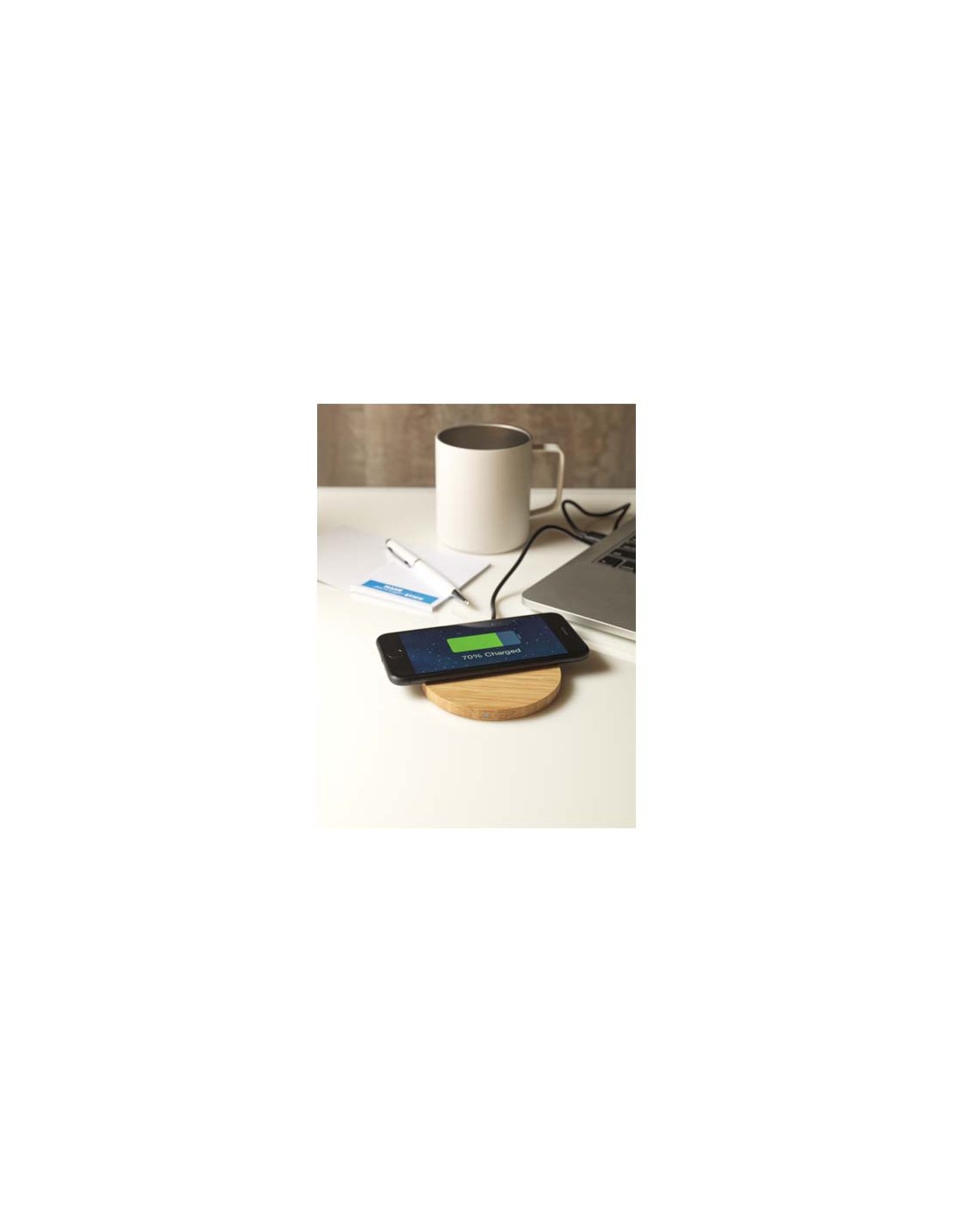 Stazione di ricarica in bambù in grado di ricaricare in modalità wireless tutti i dispositivi abilitati Qi a una velocità di ricarica massima di 15 W. Fornita con un cavo in TPE riciclato da 50 cm con connettori di ingresso di Tipo-C e USB-A. Il bambù utilizzato proviene da fonti responsabili.
