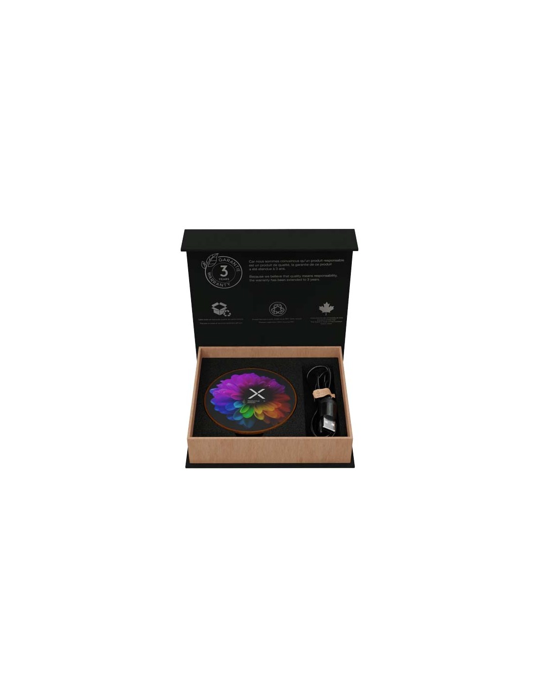 Stazione di ricarica wireless da 10 W realizzata in gomma e legno con cavo di ricarica realizzato in plastica PET riciclata. Può essere decorata con un logo luminoso. Fornita in confezione regalo realizzata in carta kraft nera con meccanismo di chiusura magnetico. Brevetto EUIPO EUROPA.