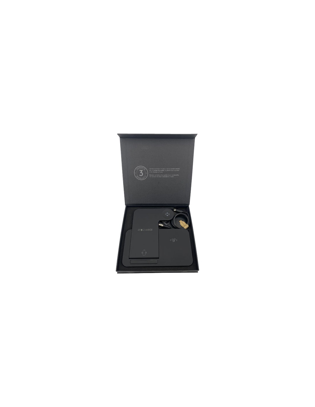 Base wireless pieghevole 3 in 1 realizzata in plastica riciclata, che funziona anche come supporto per telefono. La base può ricaricare tre diversi dispositivi contemporaneamente: smartphone (15 W), auricolari (5 W) e smartwatch (2 W). Fornita in una confezione regalo (19 x 17,5 x 2,3 cm) con chiusura magnetica. Garanzia di 3 anni inclusa.