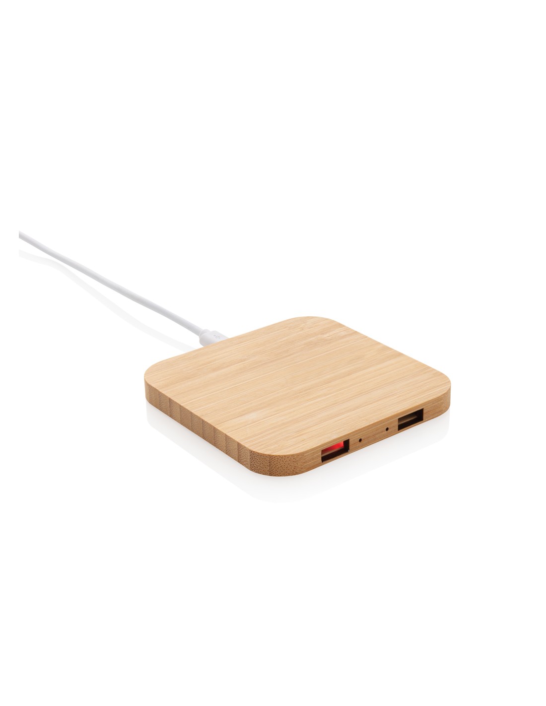 Caricatore wireless da 5W realizzato in bambù certificato FSC al 100% con due porte USB integrate. Include cavo micro USB in TPE da 150 cm. Compatibile con tutti i dispositivi abilitati QI come Android di ultima generazione, iPhone 8 e versioni successive. Input: 5V/2A; Output USB, 5V/2A; output wireless: 5V/1A - 5W. Articolo e accessori 100% senza PVC. Confezionato in scatolina FSC mix.