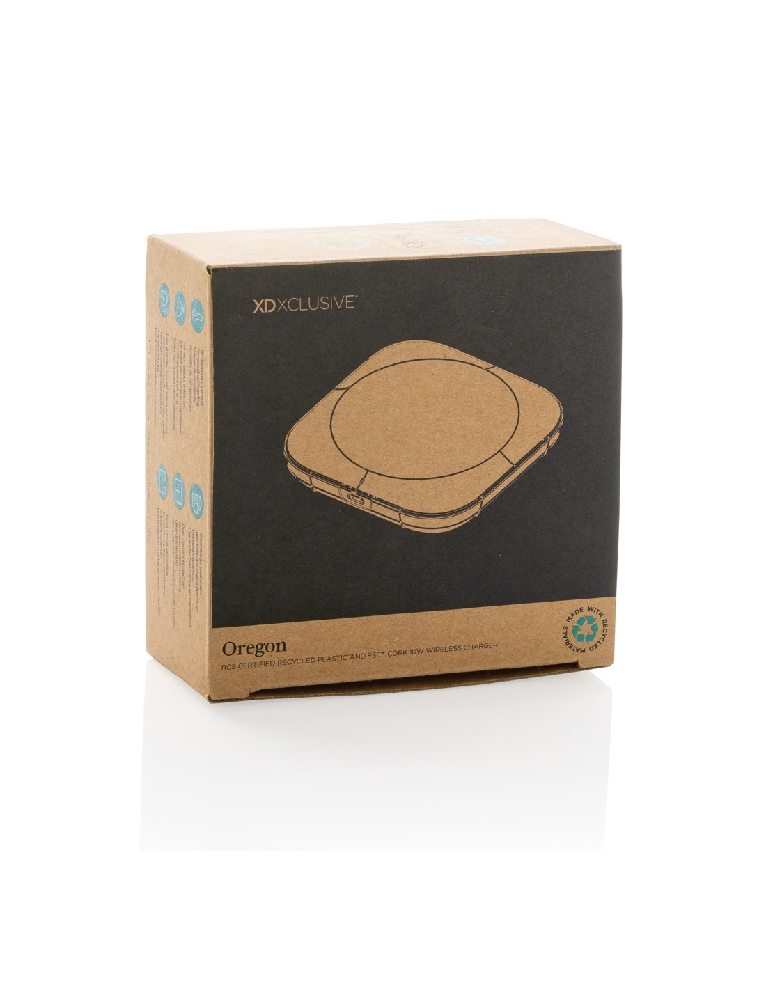Caricabatterie wireless da 10W dal design elegante, realizzato con sughero 100% FSC® e ABS riciclato certificato RCS (Recycled Claim Standard). Contenuto riciclato totale: 33% in base al peso totale dell'articolo. La certificazione RCS garantisce una catena di approvvigionamento dei materiali riciclati completamente certificata. Il sughero è certificato FSC 100%. Ricarica wireless compatibile con Android di ultima generazione e iPhone 8 e successivi. Articolo e accessori privi di PVC. Include un cavo di ricarica di tipo C da 120 cm in TPE riciclato certificato RCS. Input Type-C 5V/2A; 9V/2A; Output wireless 5V/1A;9V/1.1A; (10W) Confezionato in scatola kraft FSC®. Articolo e accessori 100% senza PVC.
