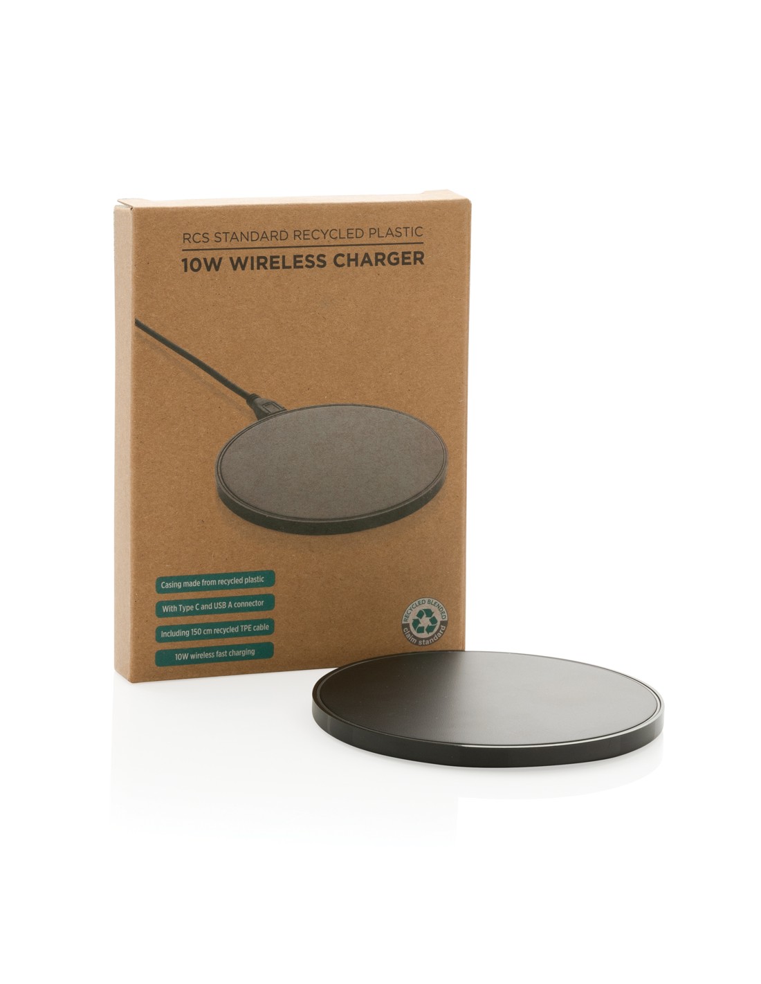 Caricatore wireless da 10W con cavo a doppio connettore (USB A e USB C) con custodia realizzata in plastica ABS riciclata certificata RCS e cavo in TPE riciclato. Contenuto totale riciclato: 58% in base al peso totale dell'articolo. RCS (Recycled Claim Standard) è uno standard per verificare il contenuto riciclato di un prodotto lungo l'intera catena di fornitura. RCS è lo standard che viene utilizzato quando una parte dell'articolo è stata realizzata con materiali riciclati. Ricarica wireless compatibile con Android di ultima generazione, iPhone 8 e superiori. Input: 9V/1.5A. Output wireless: output: 9V/1,1 10W. Articolo e accessori non contengono PVC. Include un cavo in TPE riciclato da 150 CM senza PVC che offre il collegamento ad adattatori sia USB A che type C.
