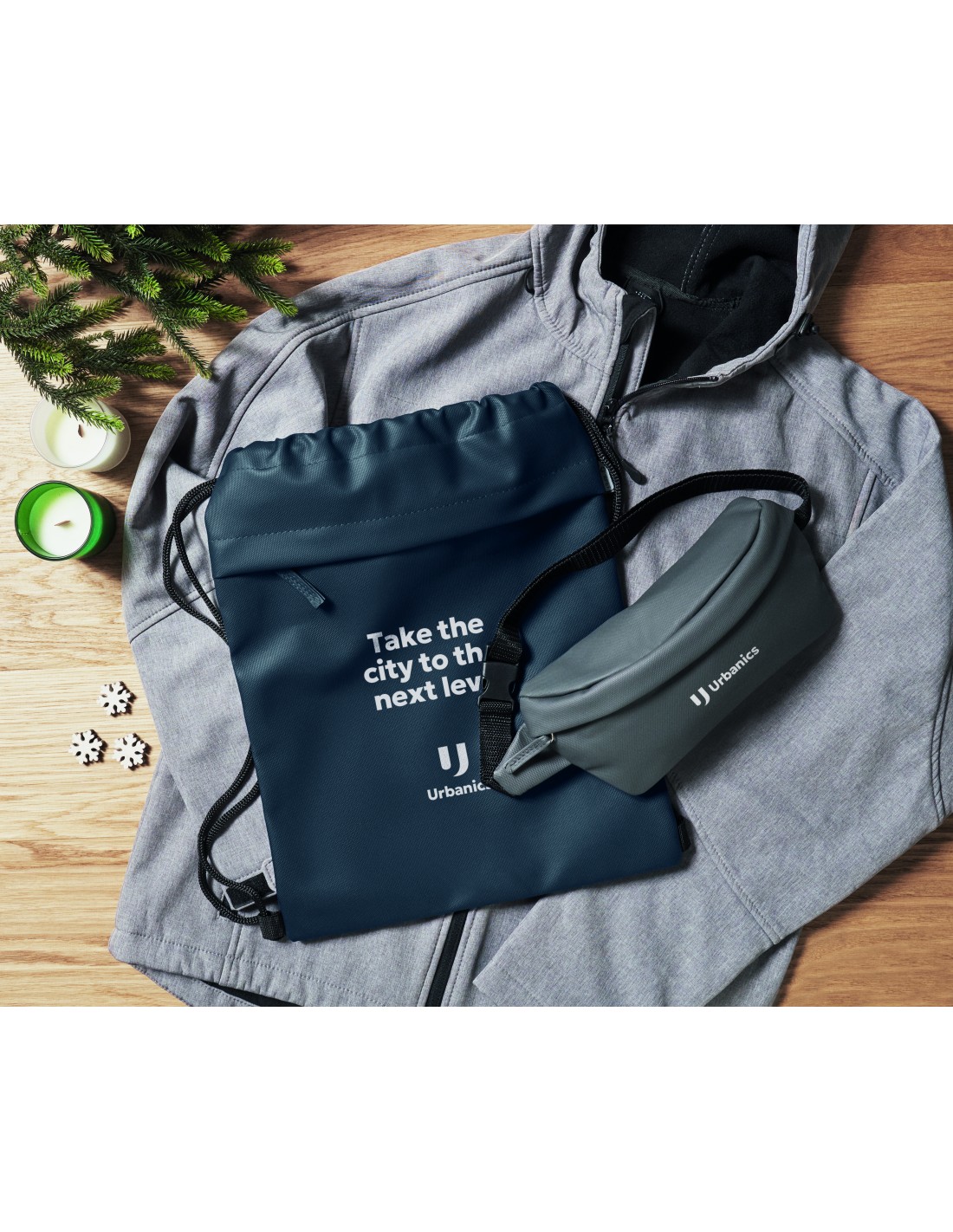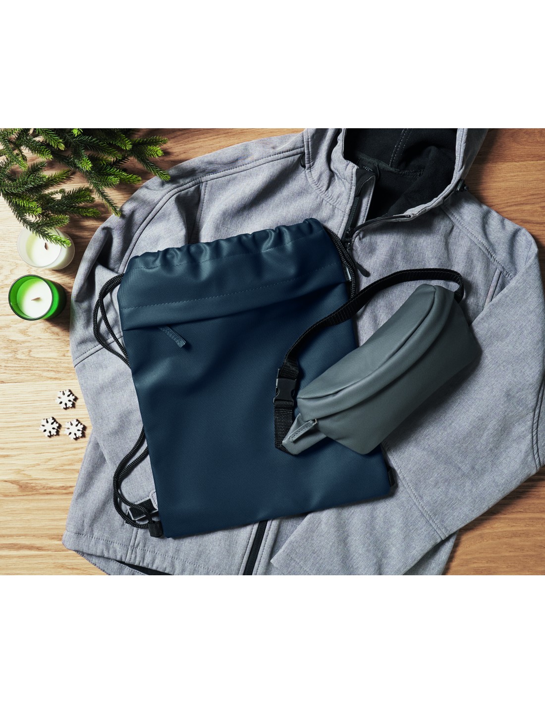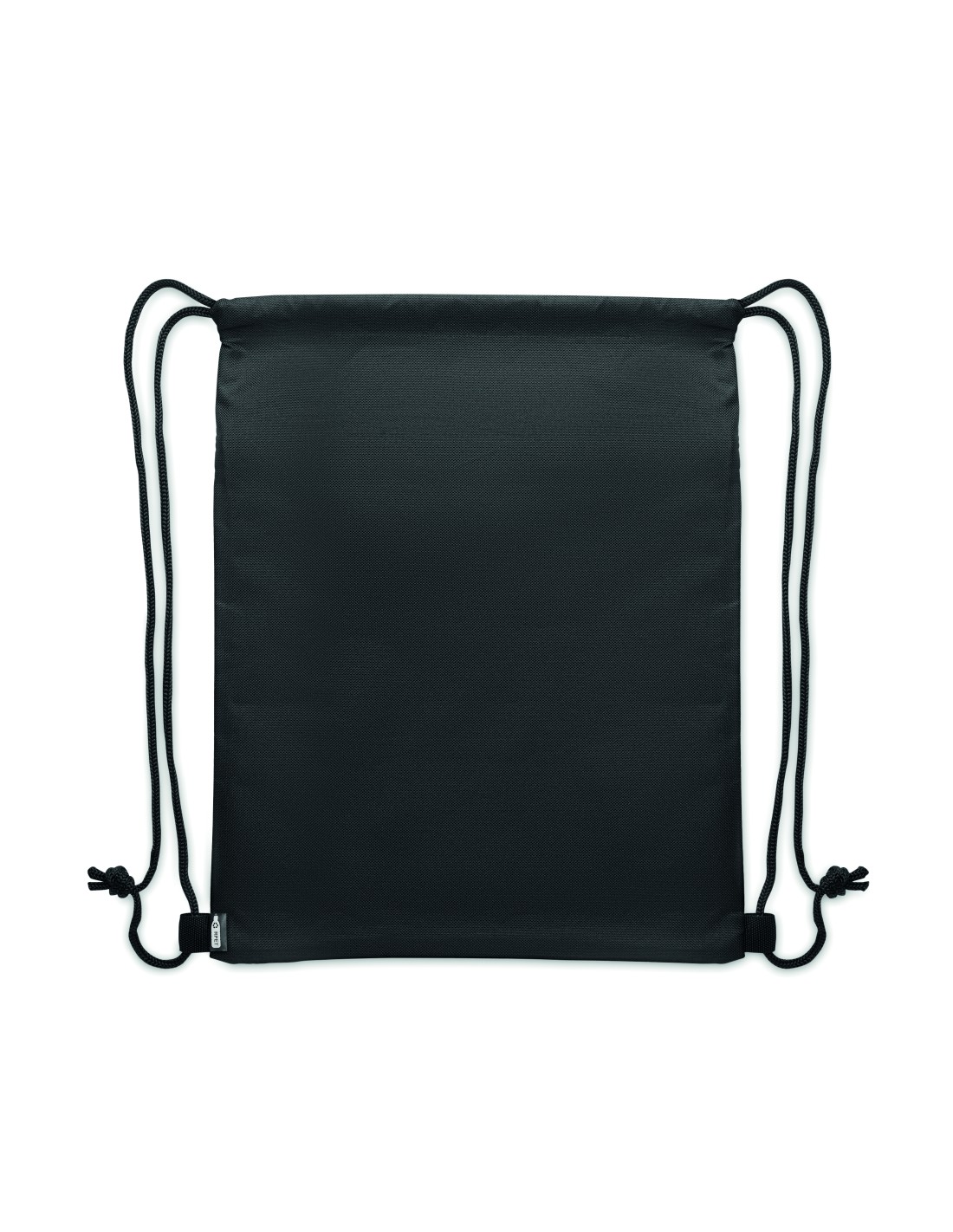 Borsa con coulisse con rivestimento in PU in poliestere 600D RPET e fodera in poliestere 190T RPET. Tasca frontale con cerniera.