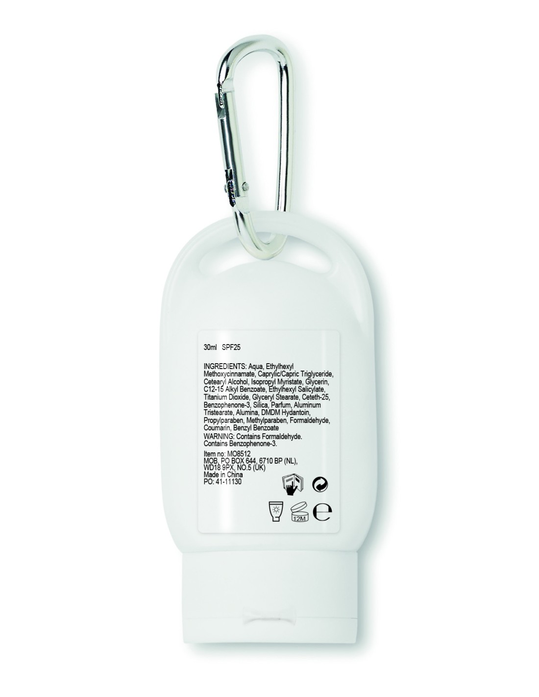 Protezione solare SPF25 con moschettone. Provvisto di etichetta con ingredienti. 30 ml.