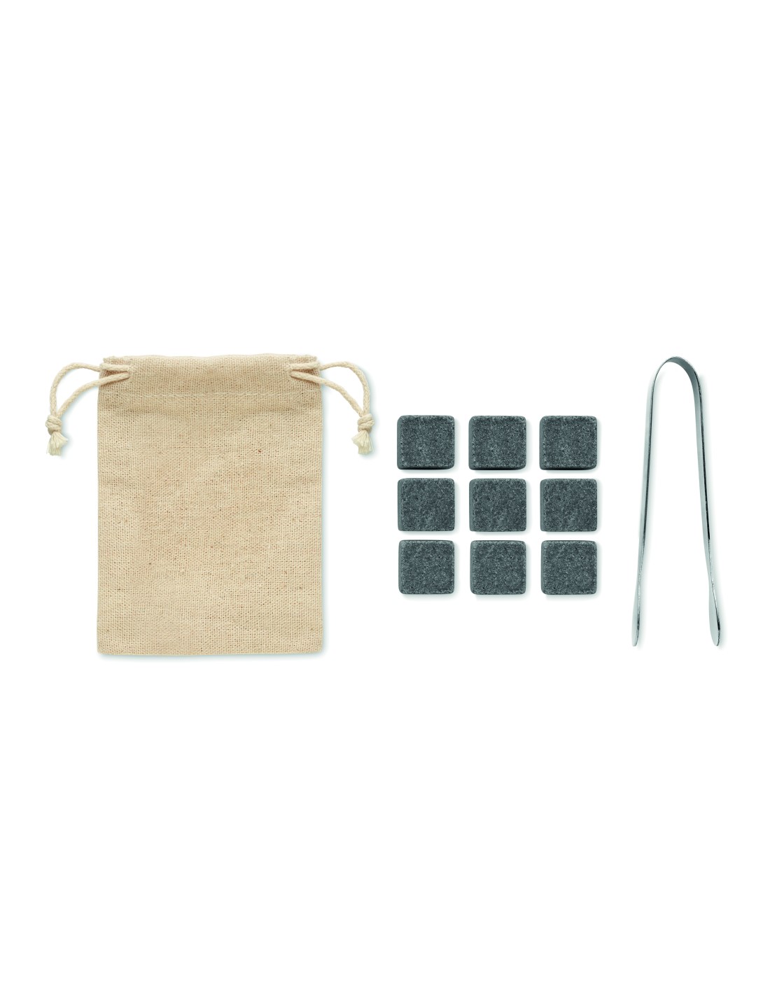 Kit da cocktail in busta di cotone con cordoncino composto da: misurino bifacciale (15 e 30 ml), un muddler in legno, un colino per cocktail, uno shaker e un coltello cavatappi per camerieri.
