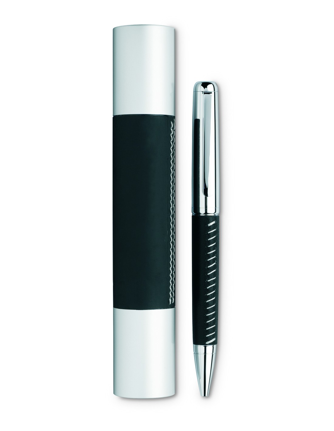 Set penna a sfera con refill blu e matita in alluminio in confezione di metallo. Meccanismo a scatto.