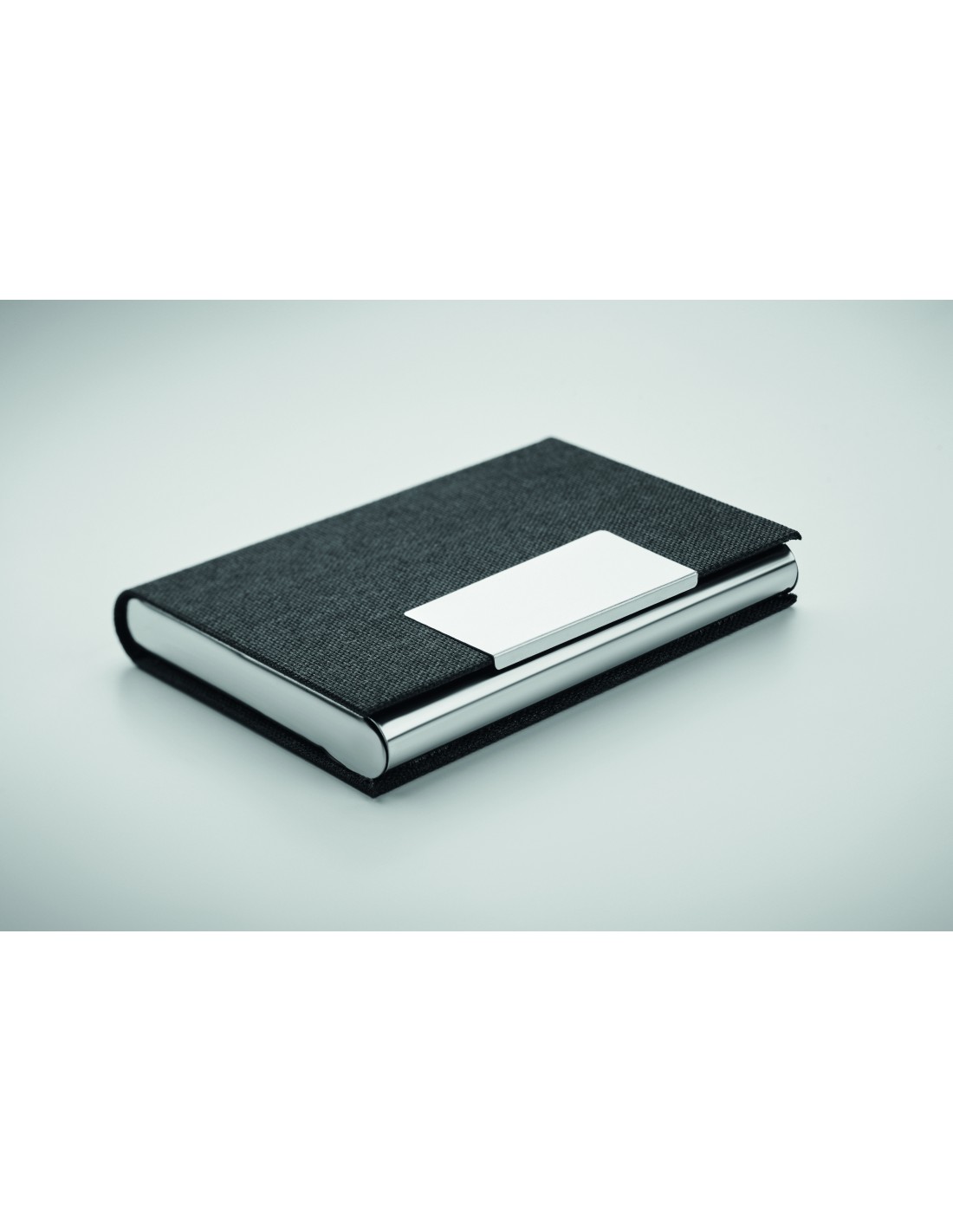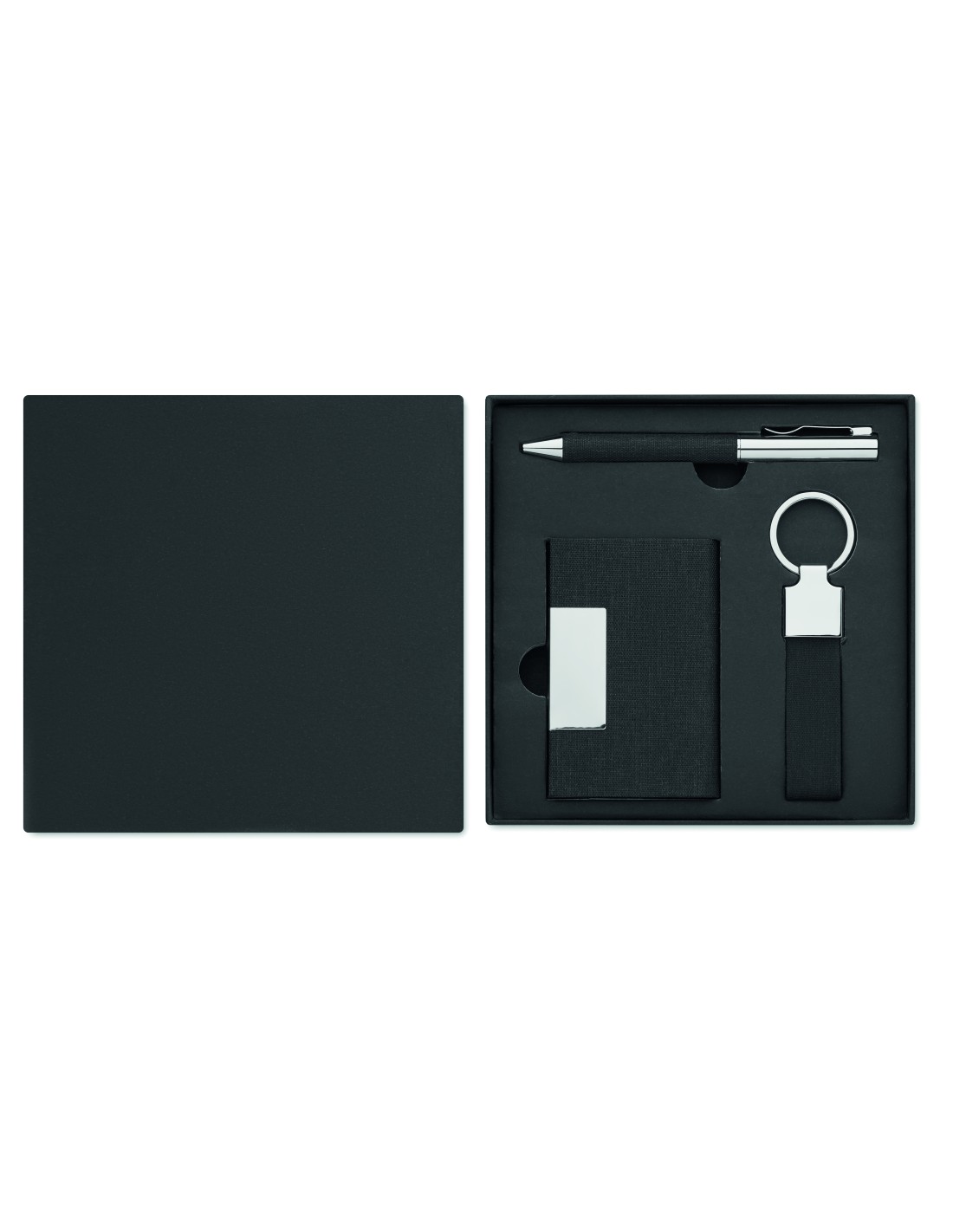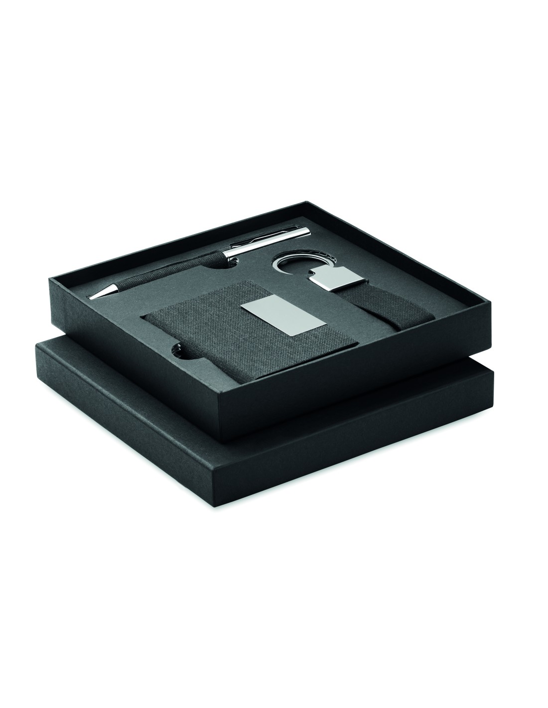 Set da 3 pezzi in confezione regalo. Comprende una penna a sfera a rotazione in metallo con dettagli in poliestere RPET, un portachiavi in poliestere RPET e un portacarte in poliestere RPET con targhetta in metallo. Inchiostro blu.
