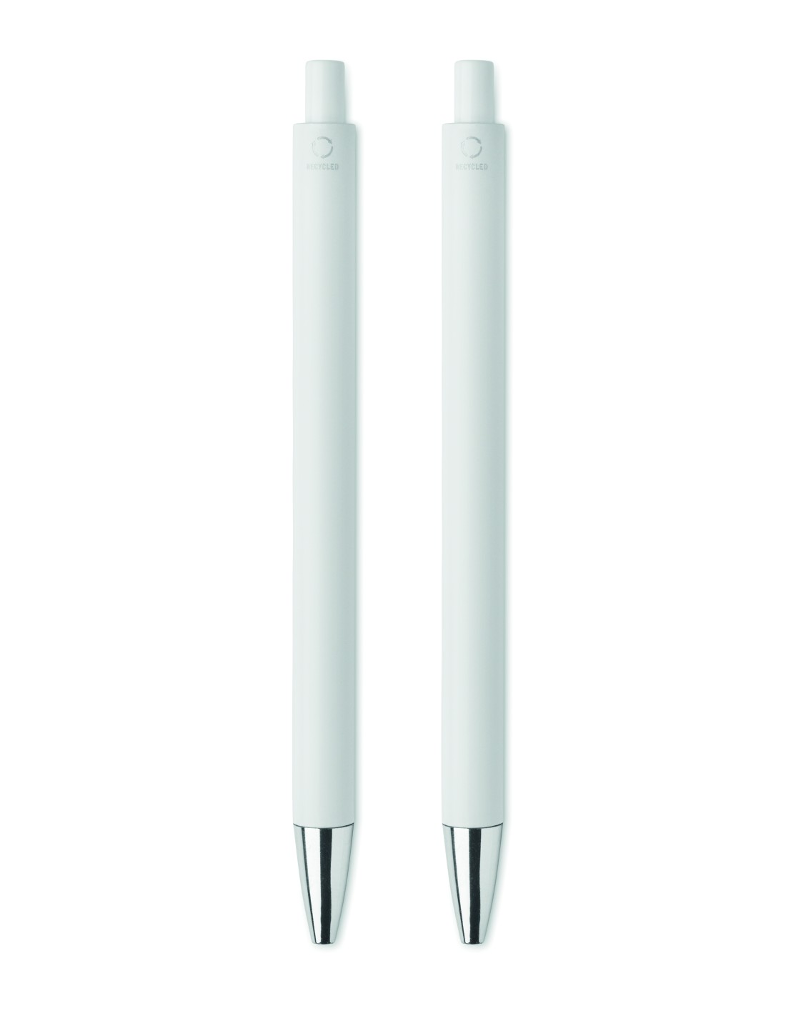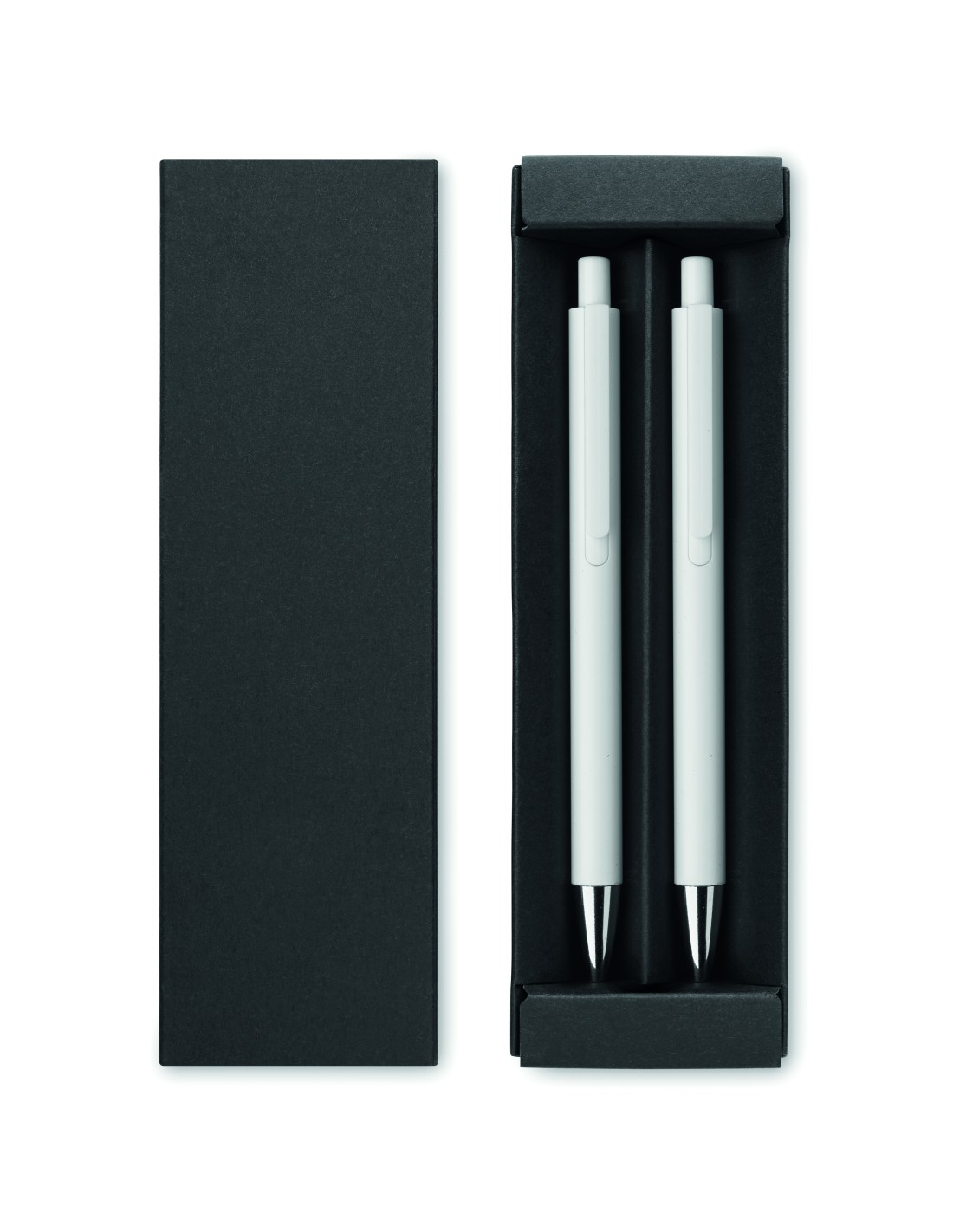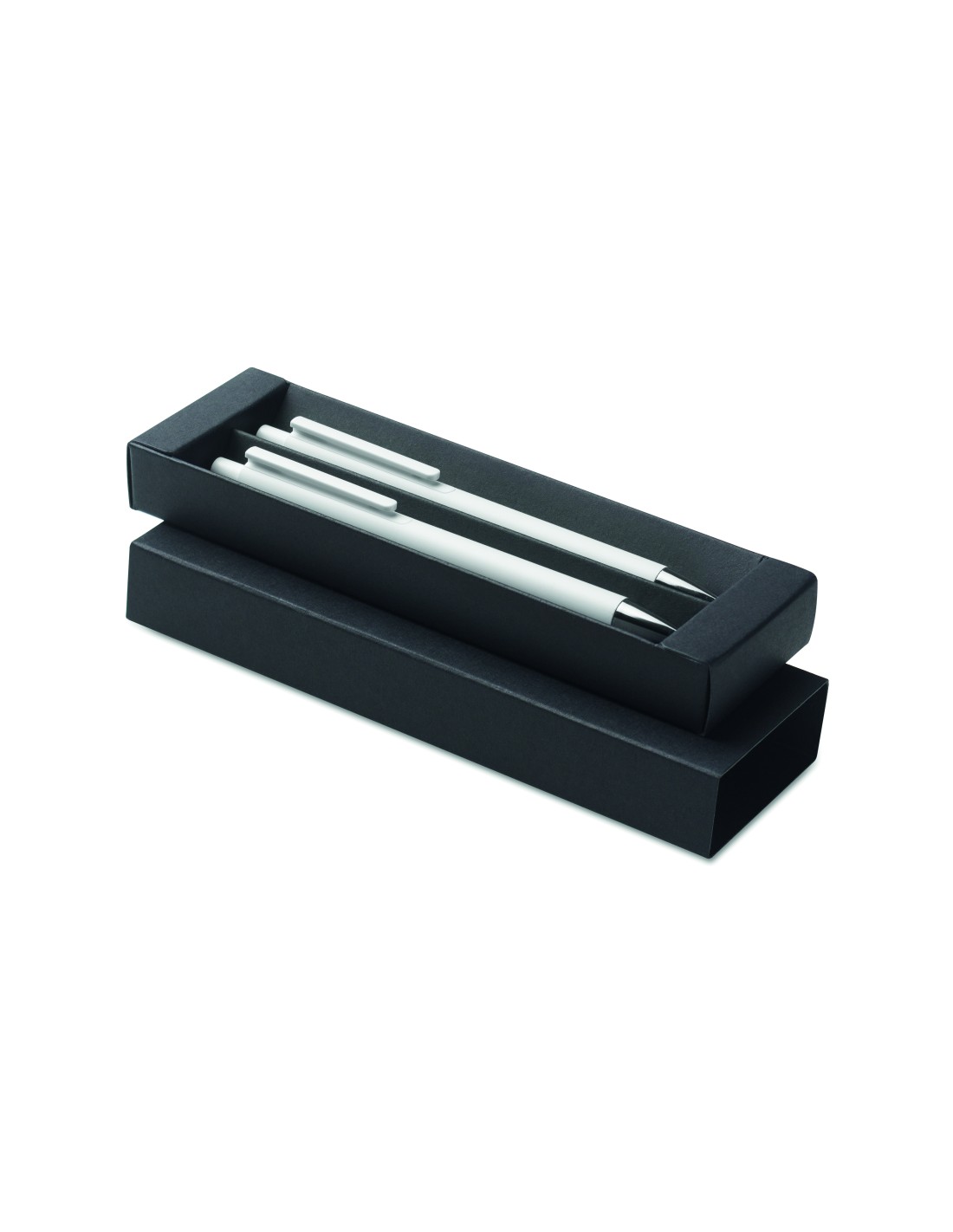 Set di penne in alluminio riciclato con 1 penna a sfera e 1 penna a inchiostro di grafite. Inchiostro blu. Presentato in una scatola di carta riciclata.
