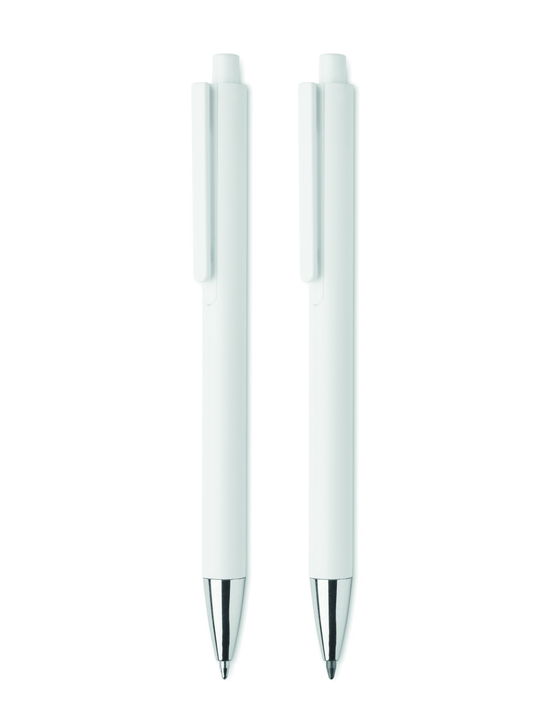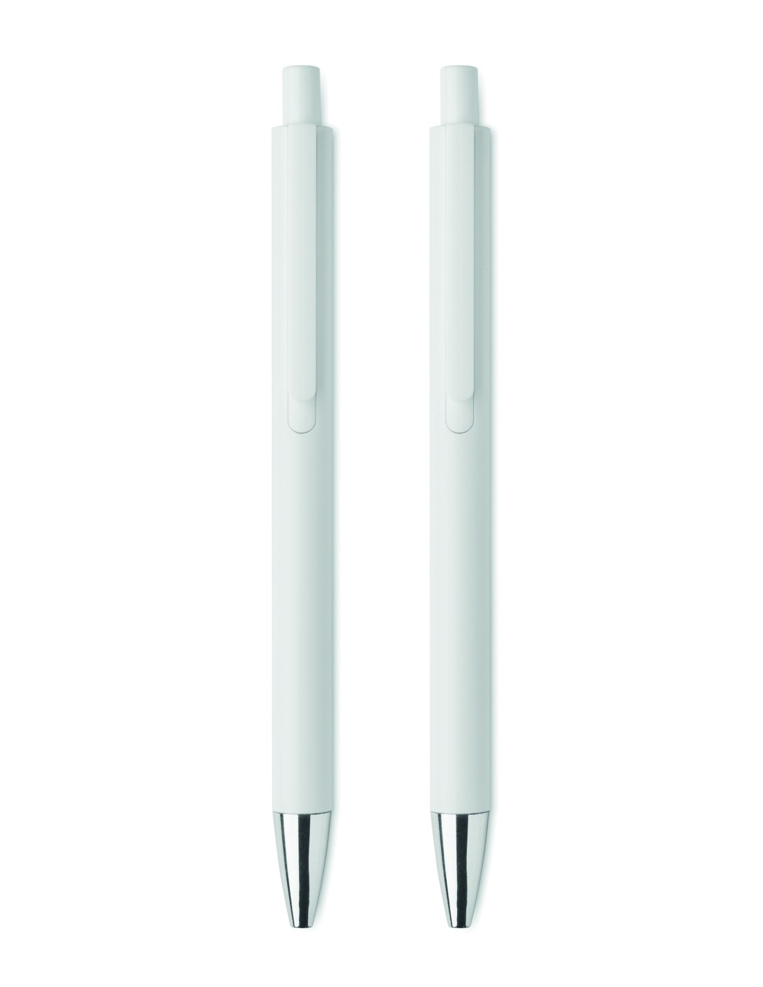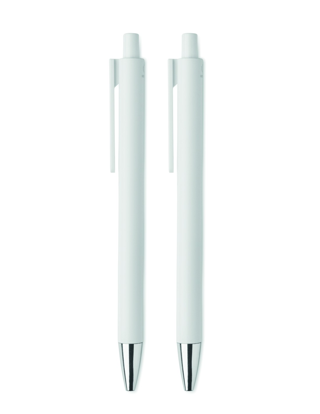 Set di penne in alluminio riciclato con 1 penna a sfera e 1 penna a inchiostro di grafite. Inchiostro blu. Presentato in una scatola di carta riciclata.