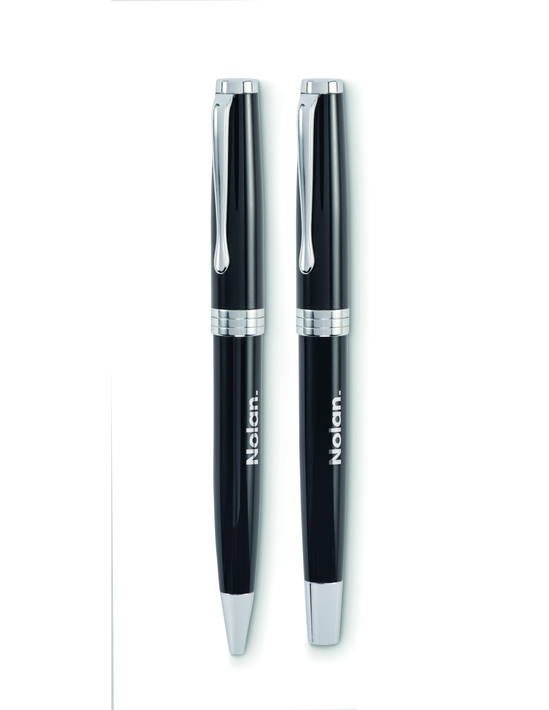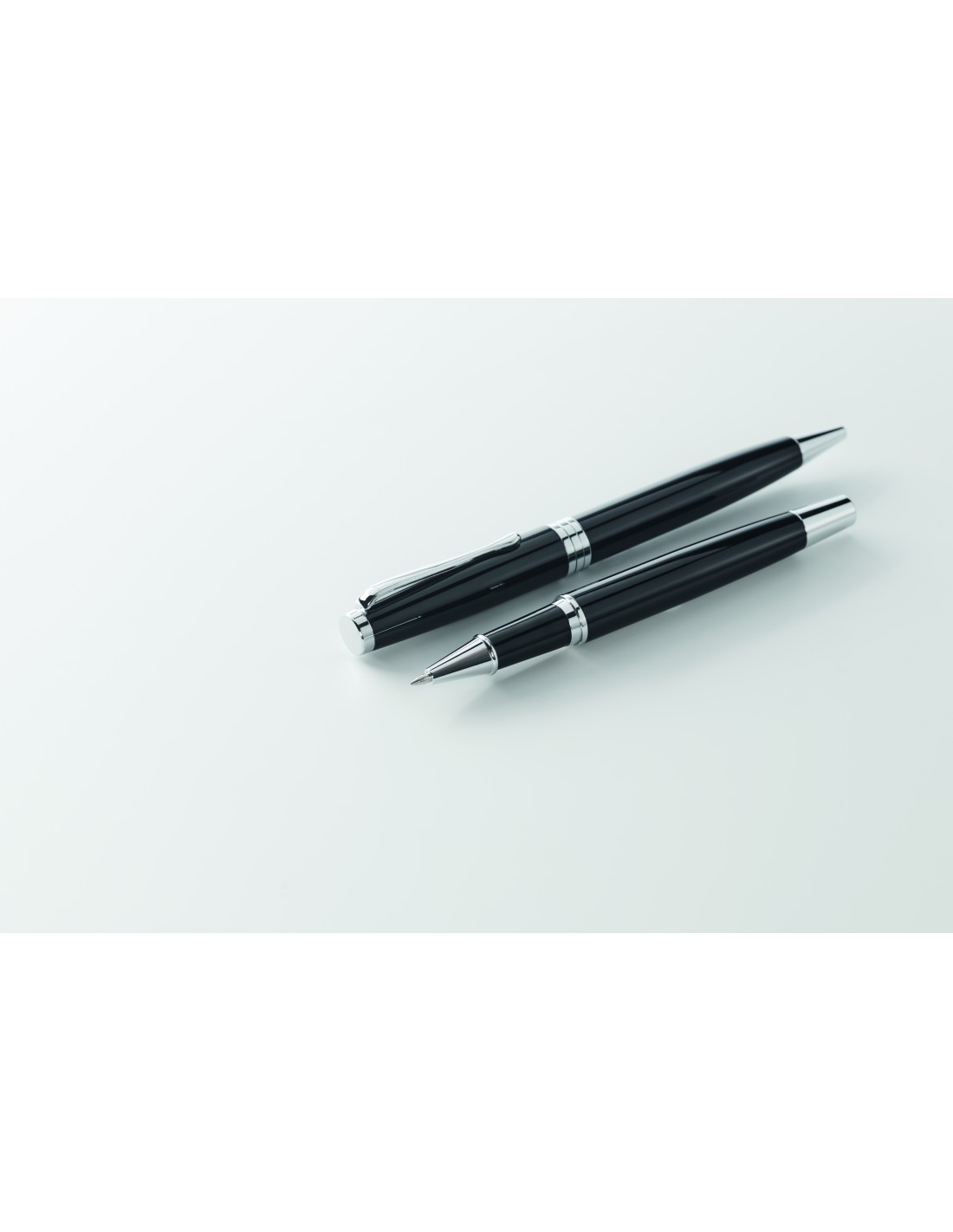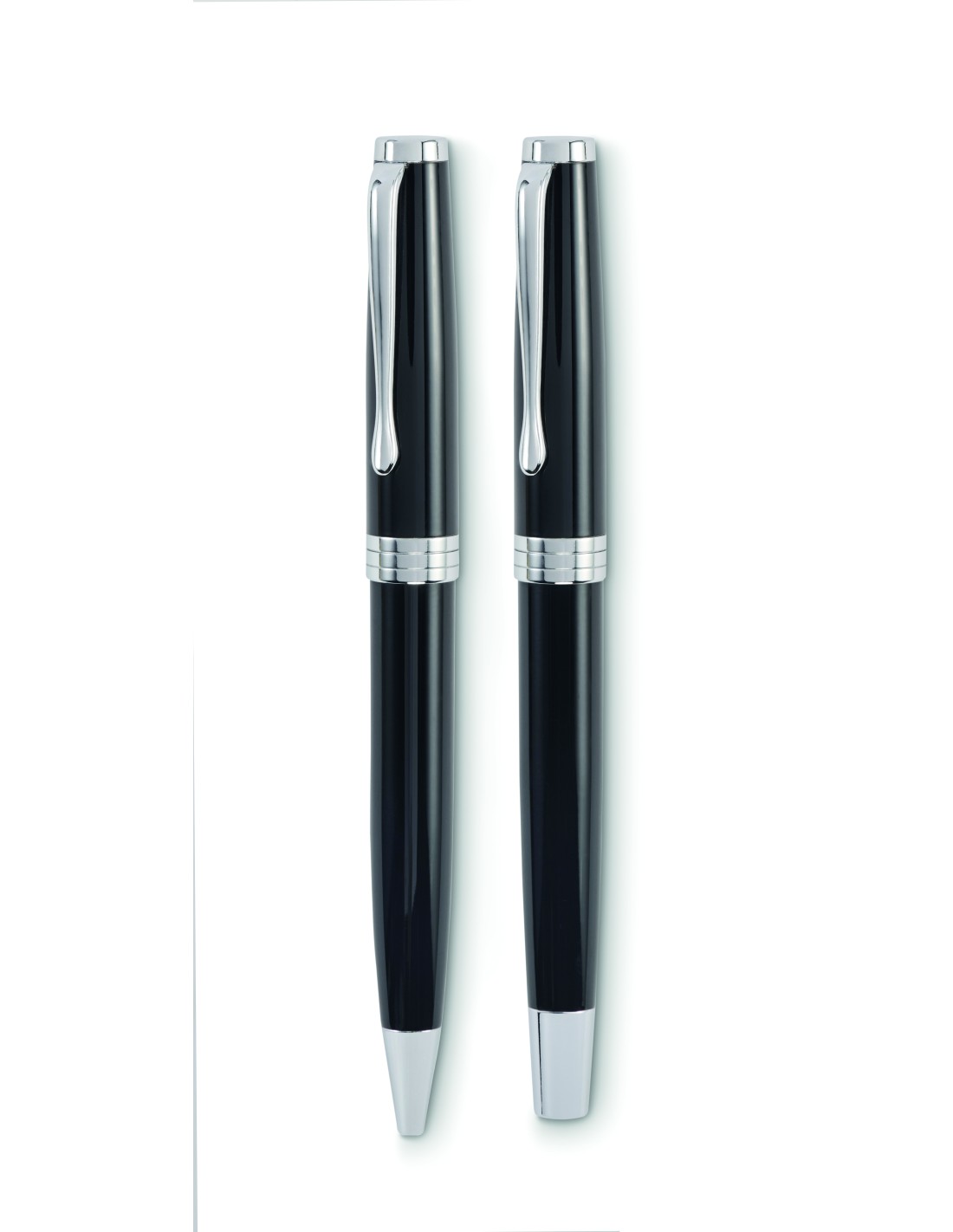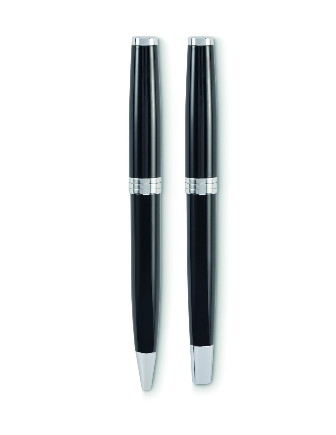 Set di penna a sfera e roller con fusto in acciaio inossidabile riciclato. Inchiostro blu e nero rispettivamente. Presentato in una scatola nera.